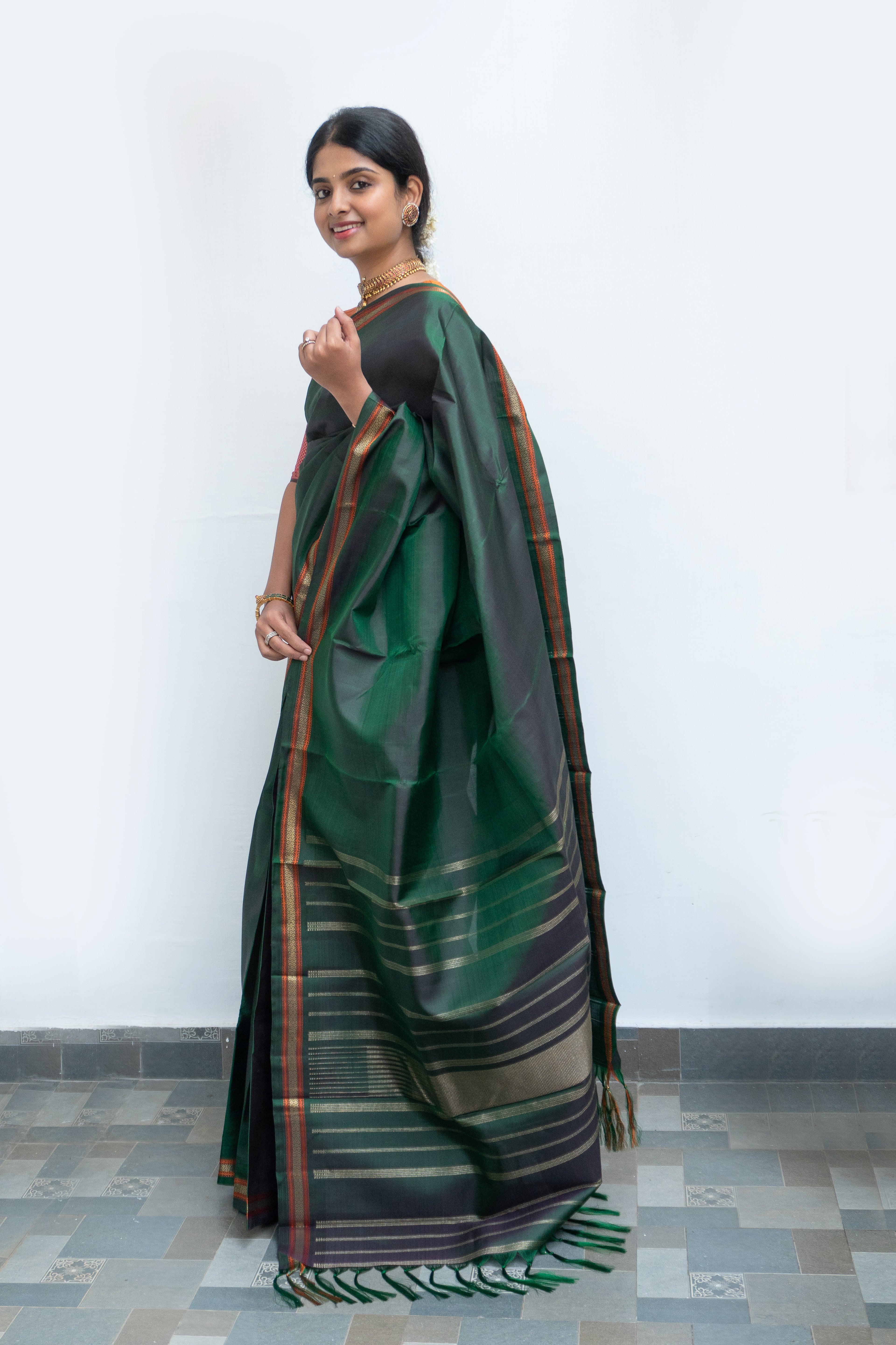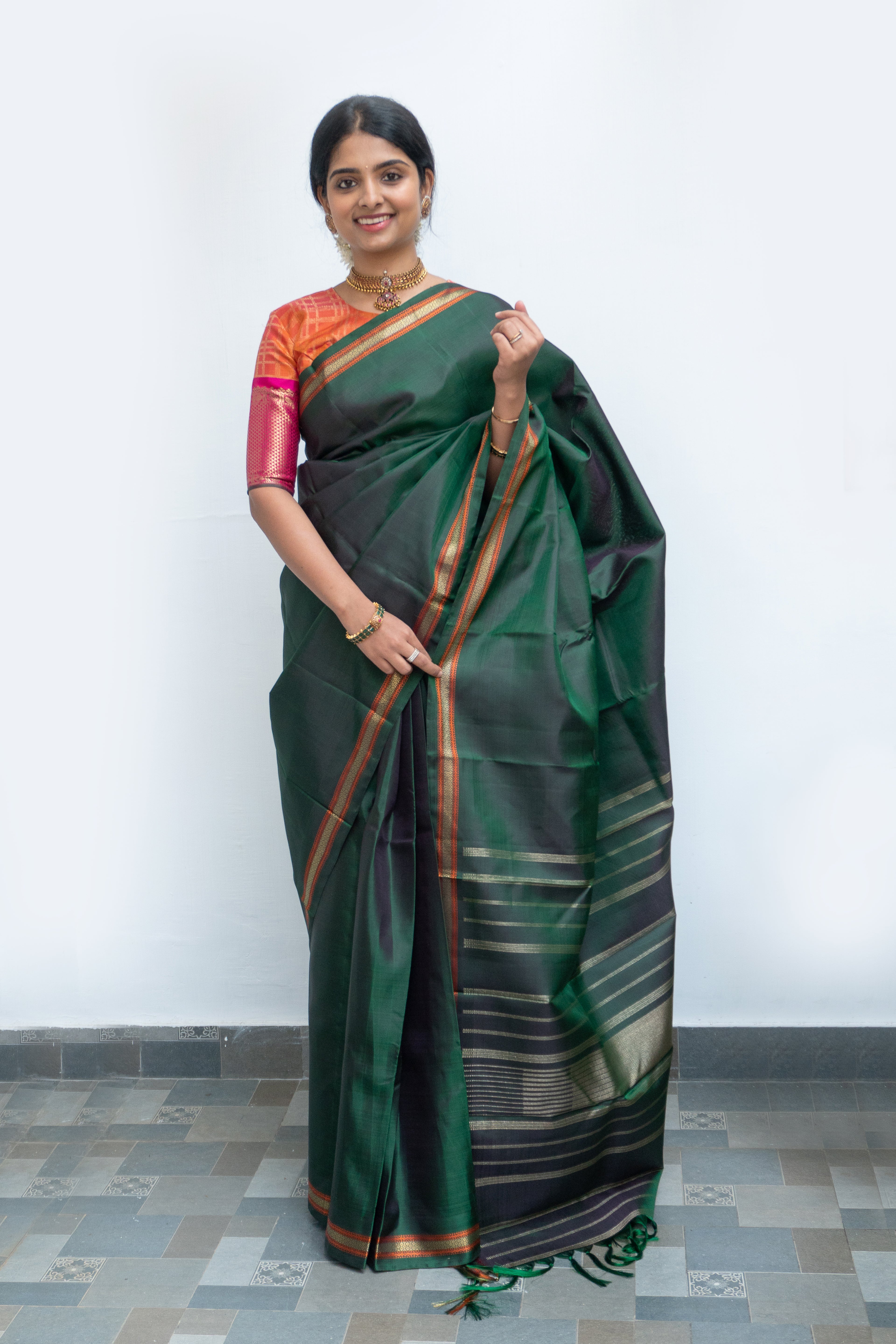 Rich Bottle green kanjivaram silk saree embodies timeless craftsmanship . The saree flows into a combination of gold zari and orange thread. The saree has a “seer” pallu woven in pure gold zari.