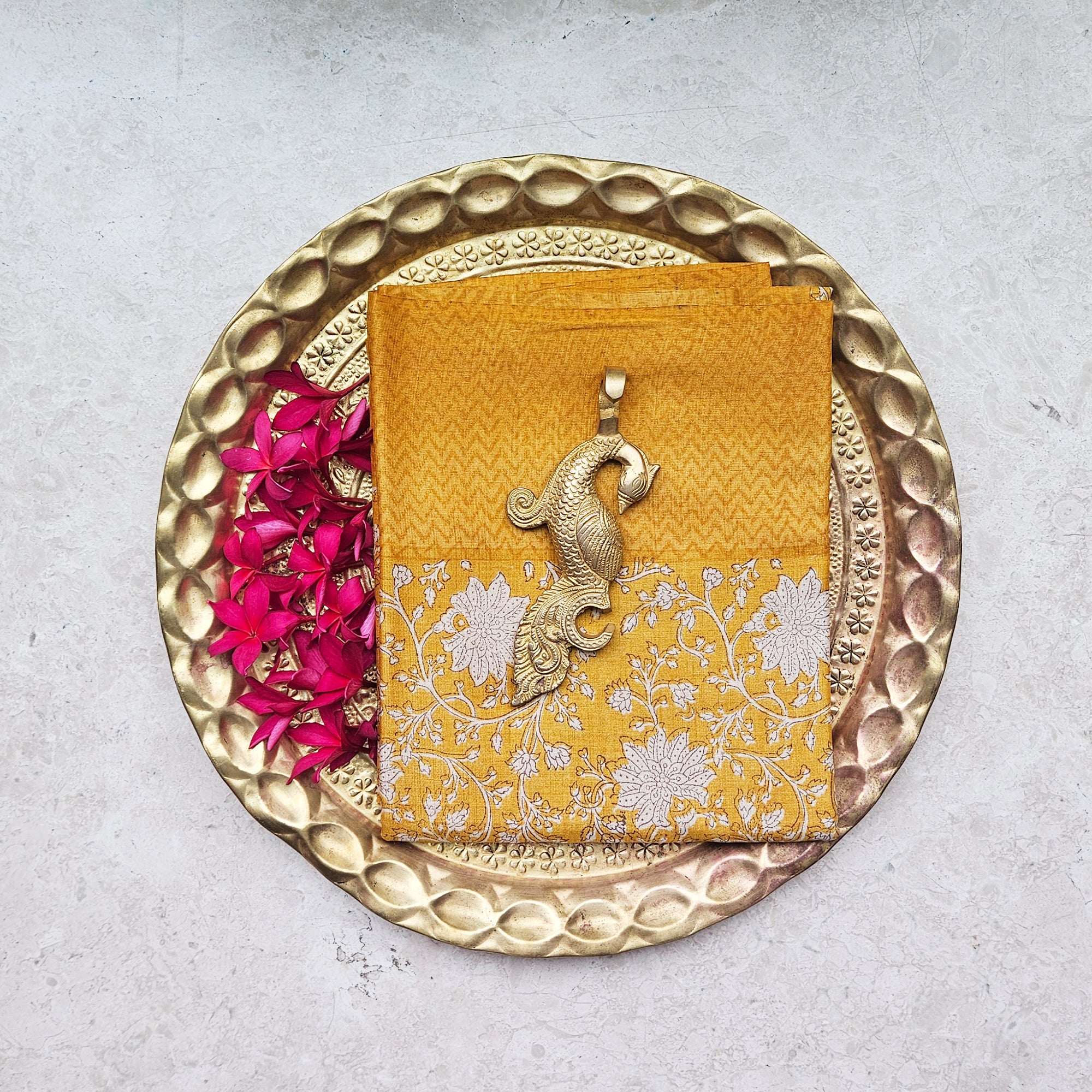 Beige Tussar Silk Saree with Mustard Stripes & Kalamkari Pallu