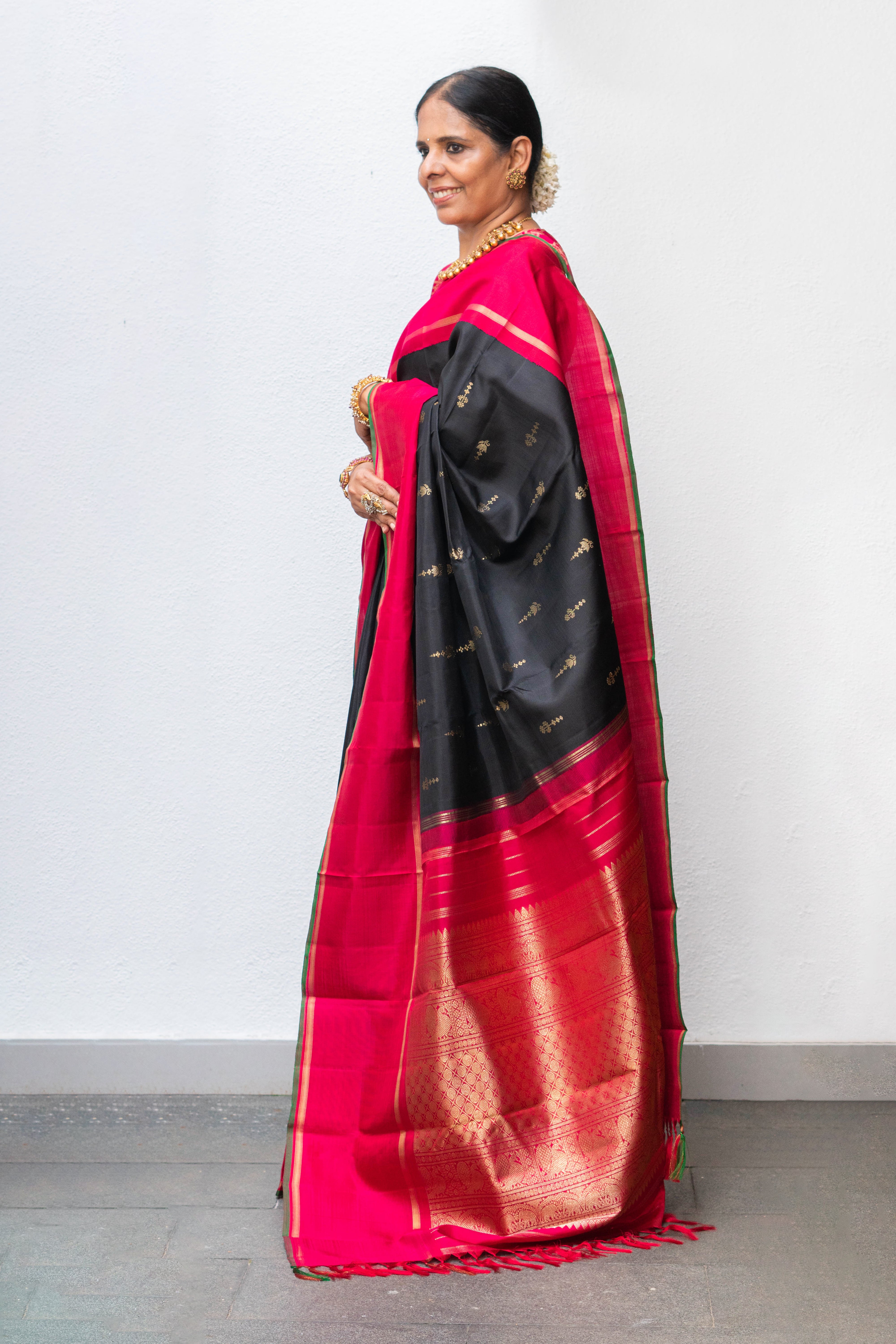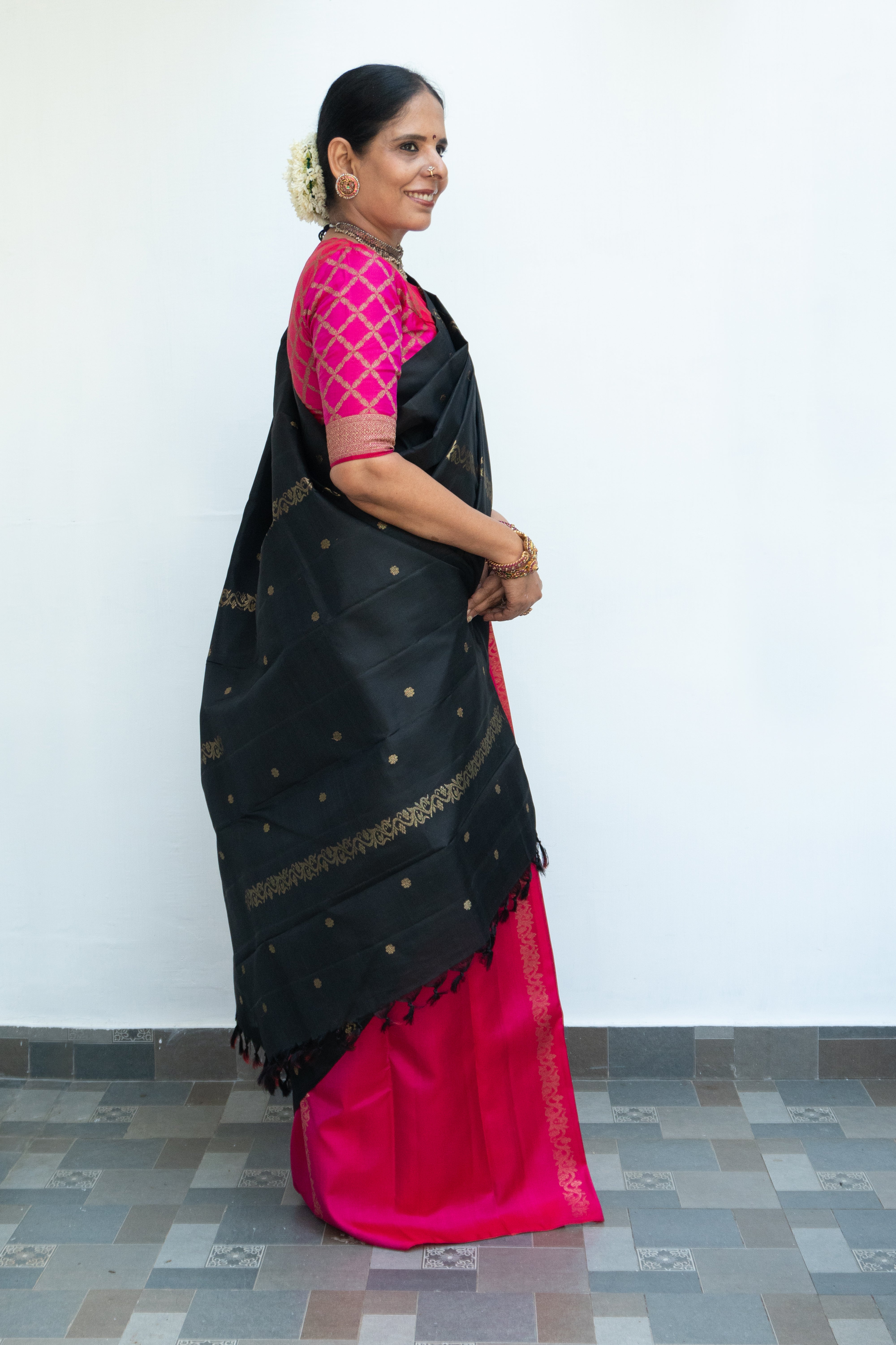 Black and Pink Half-and-Half Kanjivaram Silk Saree with Zari Motifs