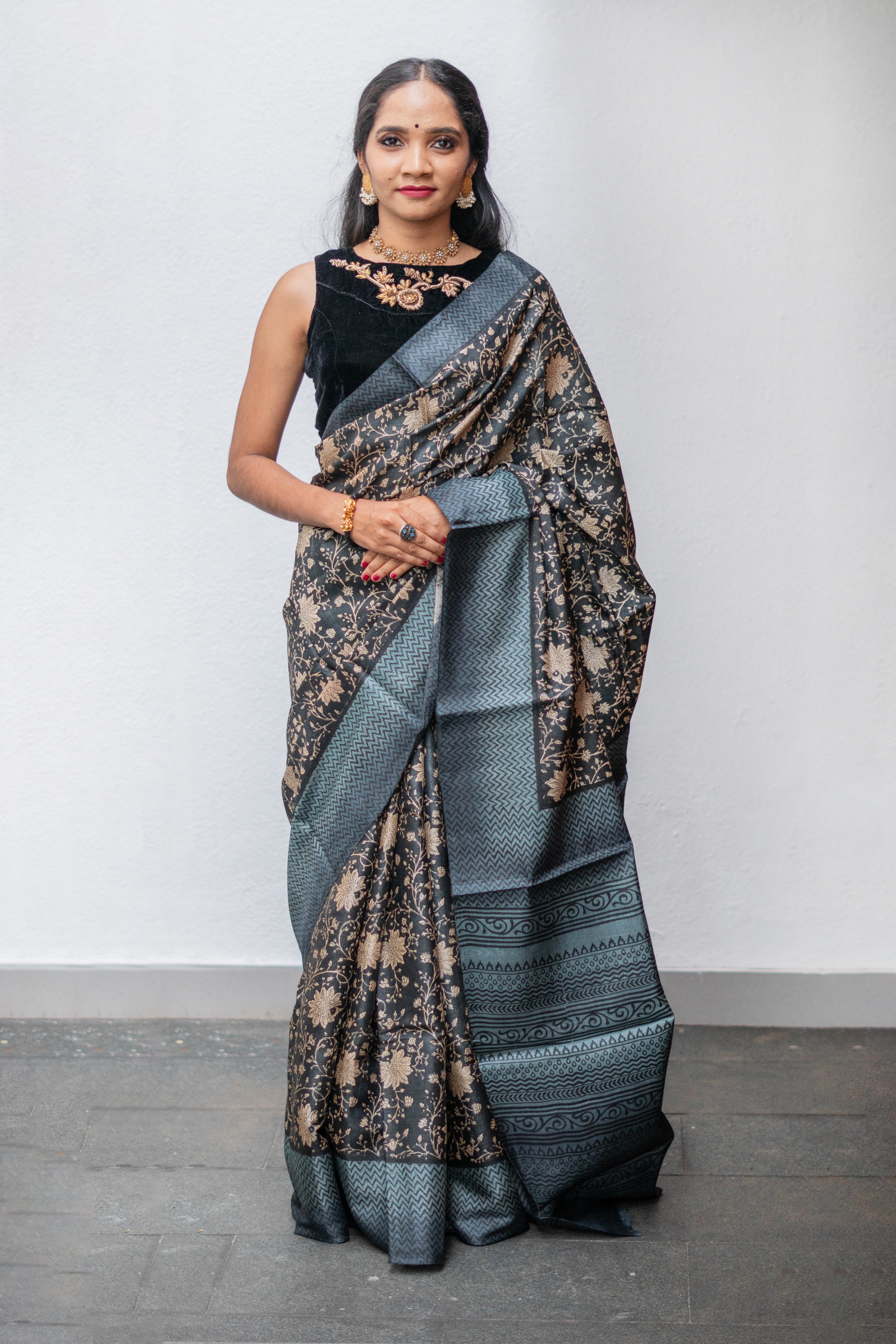 Beige Tussar Silk Saree with Grey Zig-Zag Border & Floral Print Pallu