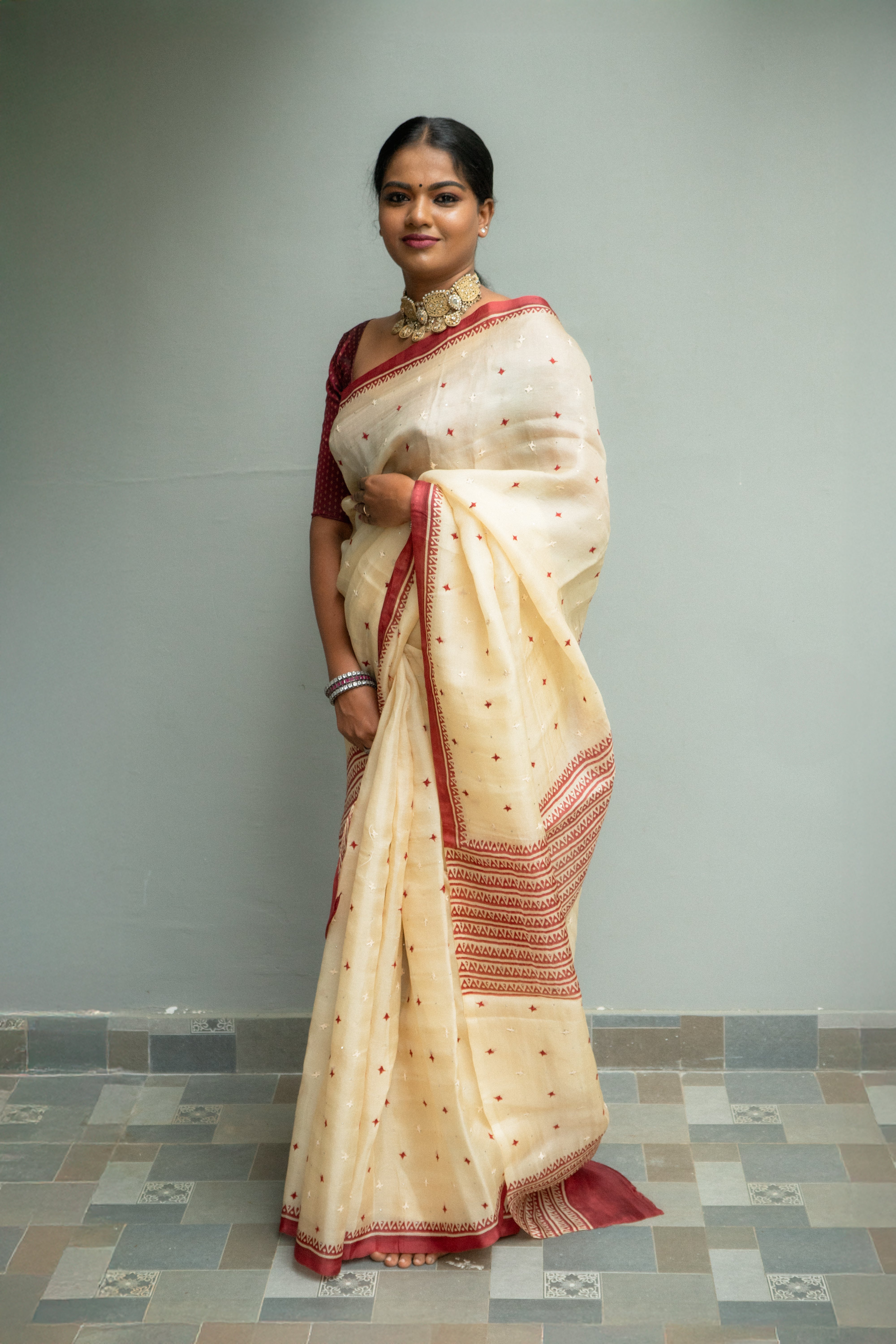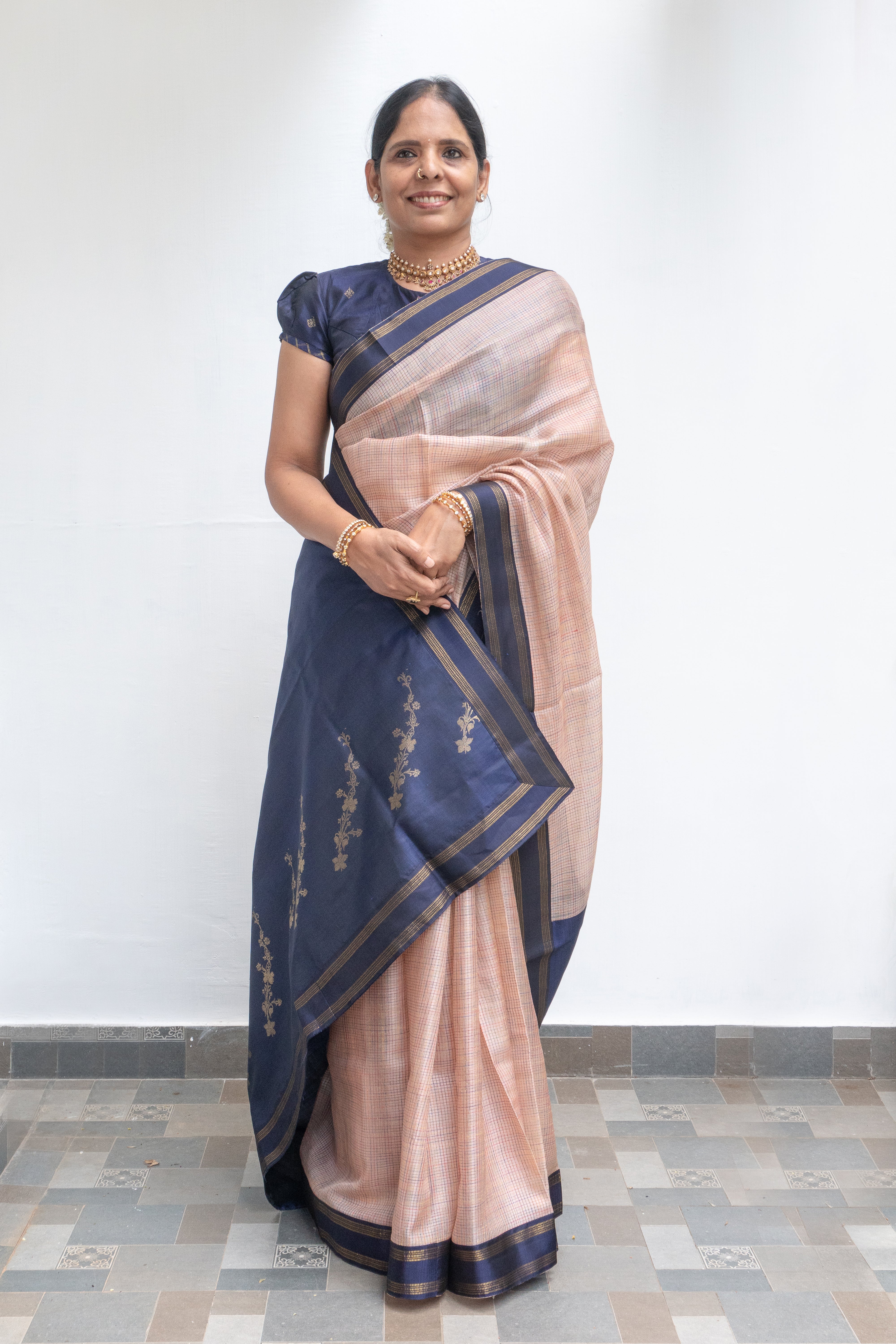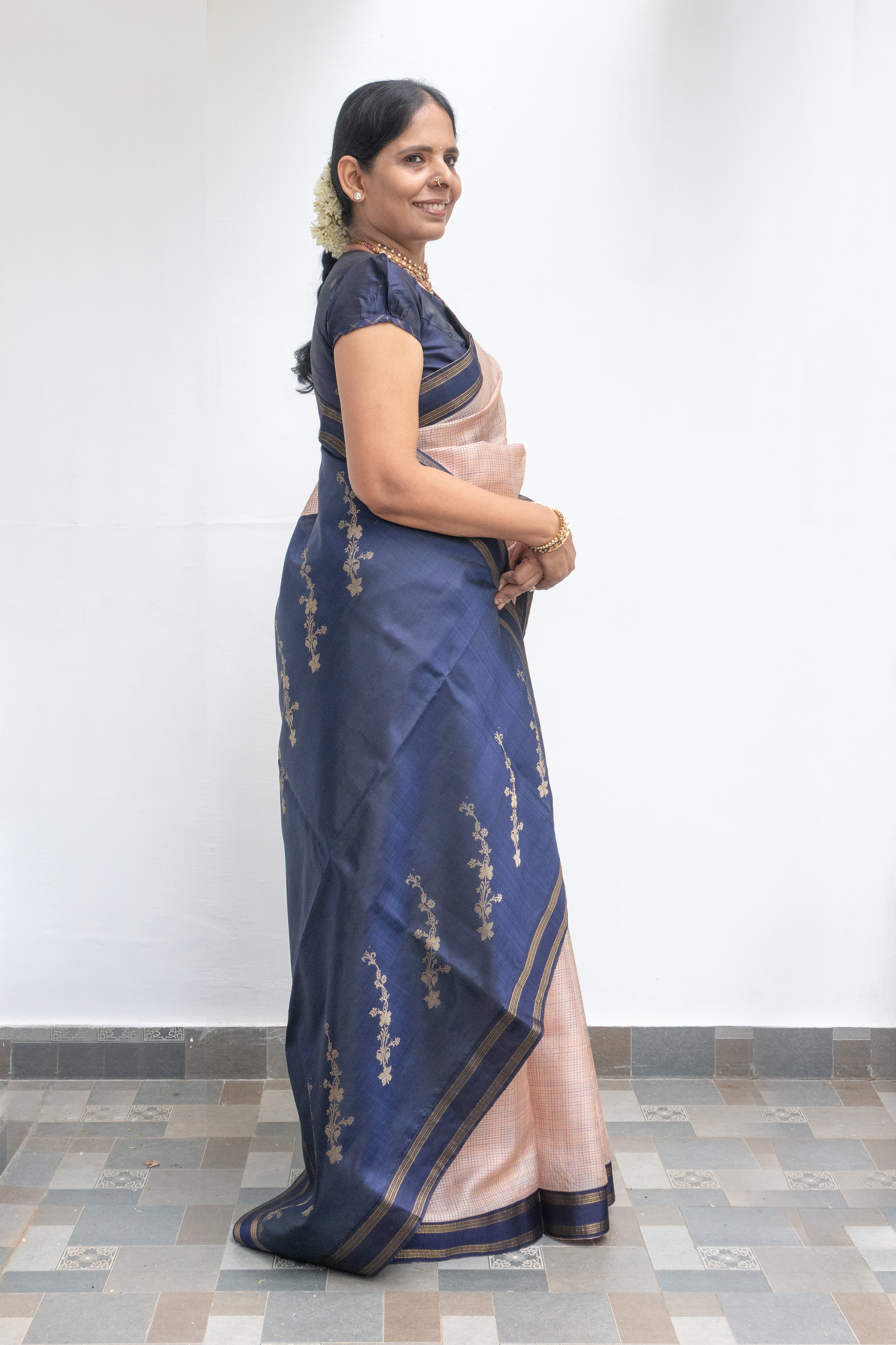 Beige Tussar Silk Saree with Checks & Navy Blue Kanjivaram Zari Border