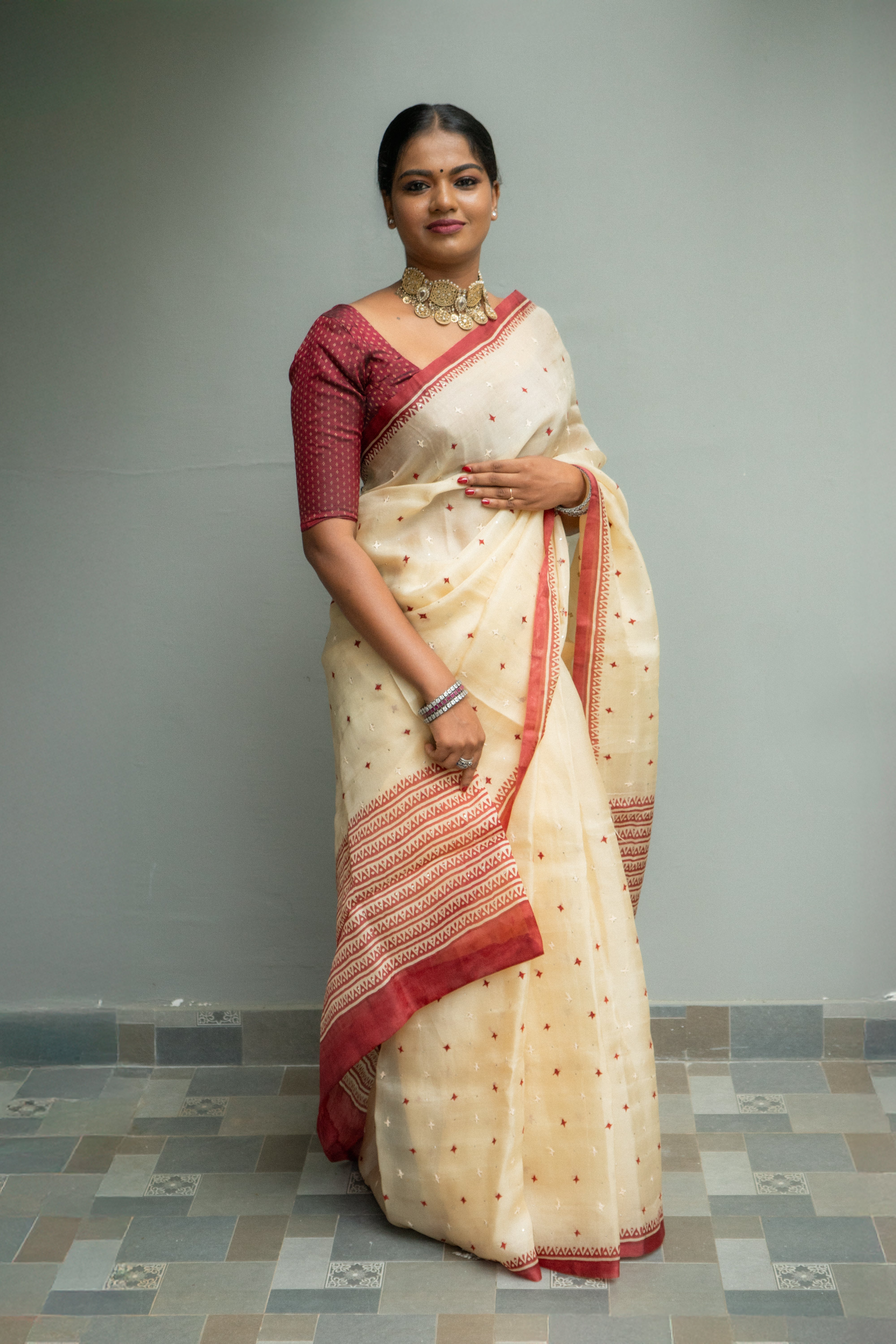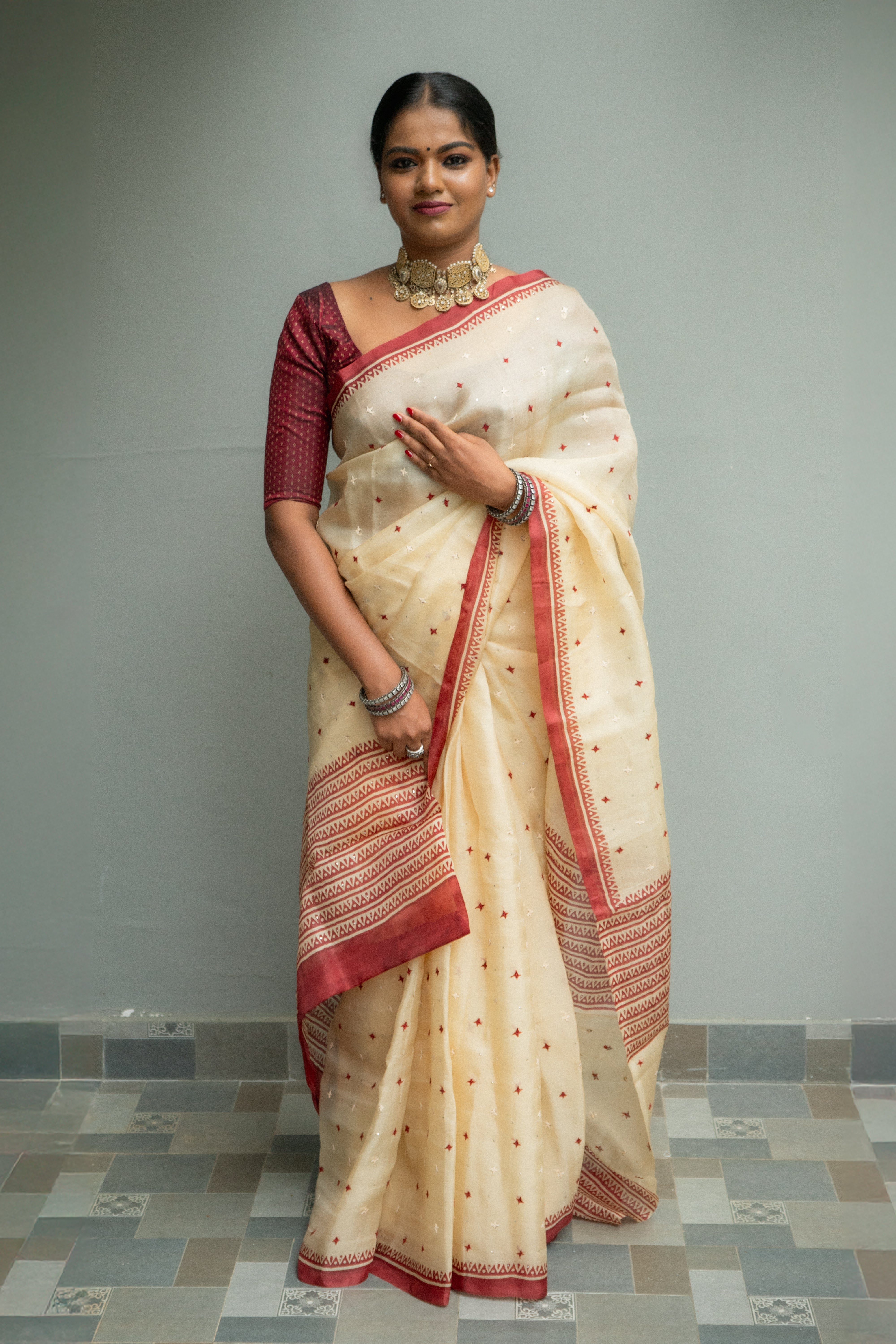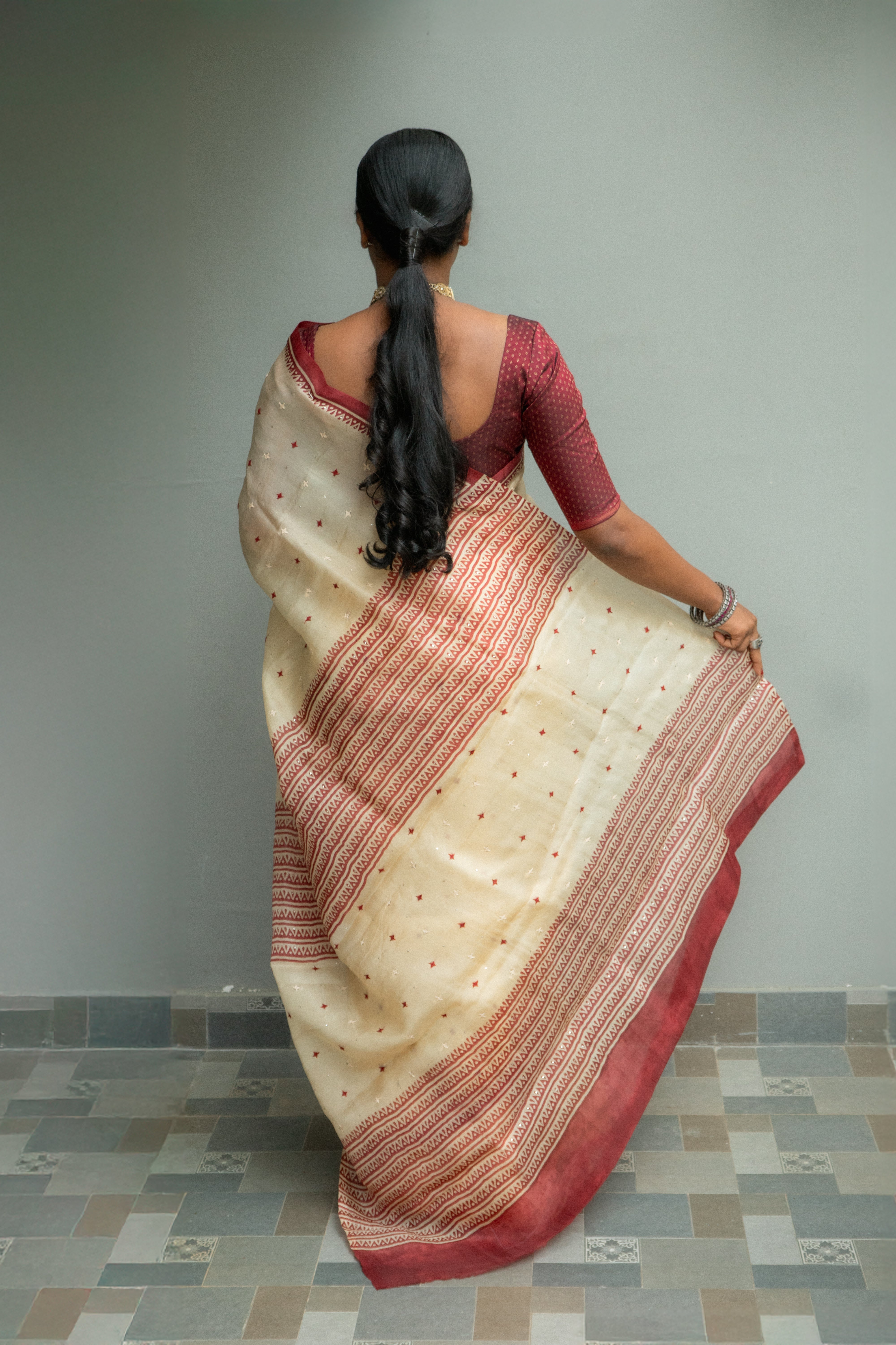 Beige Tussar Silk Saree with Hand Block Printed Dots and Peacock Motifs