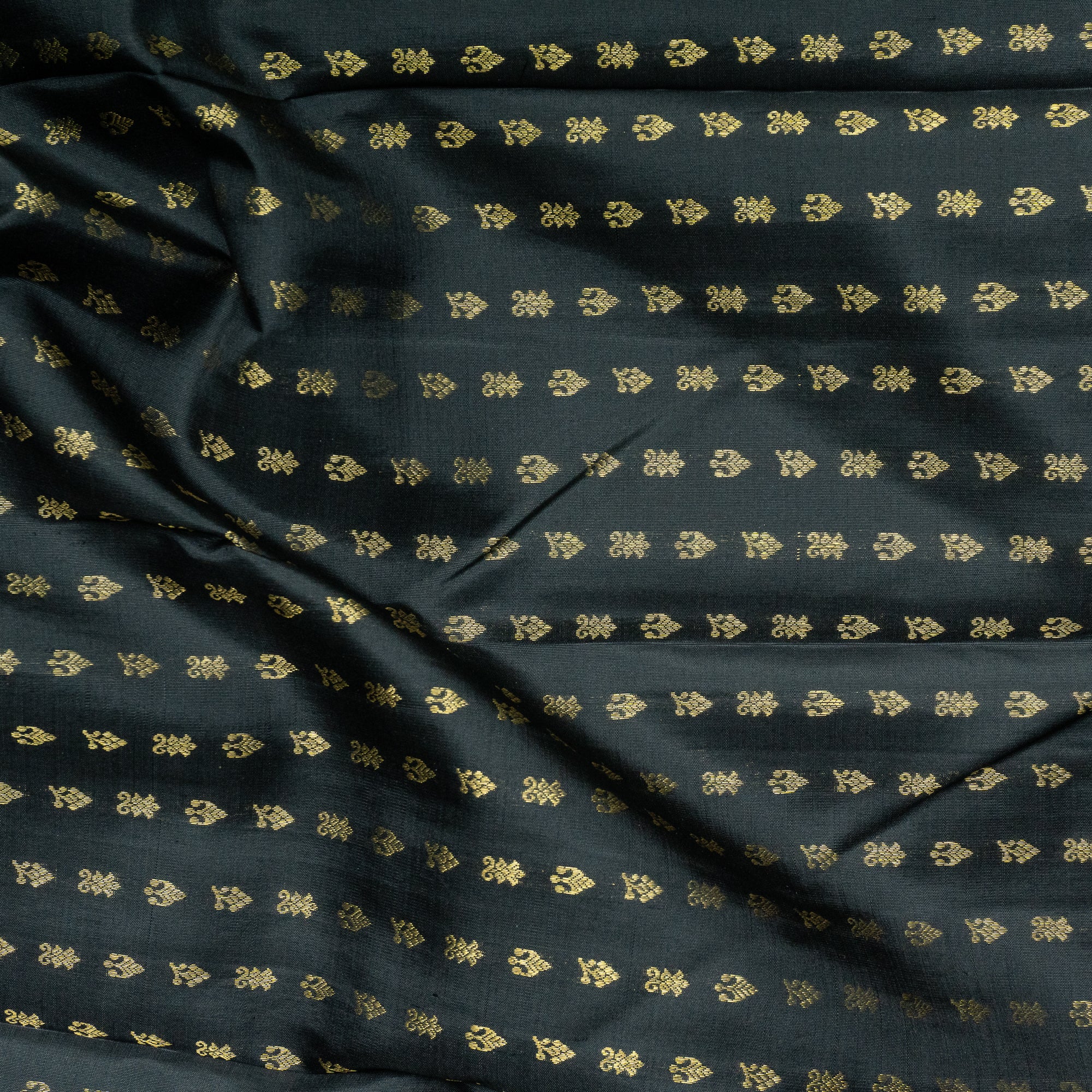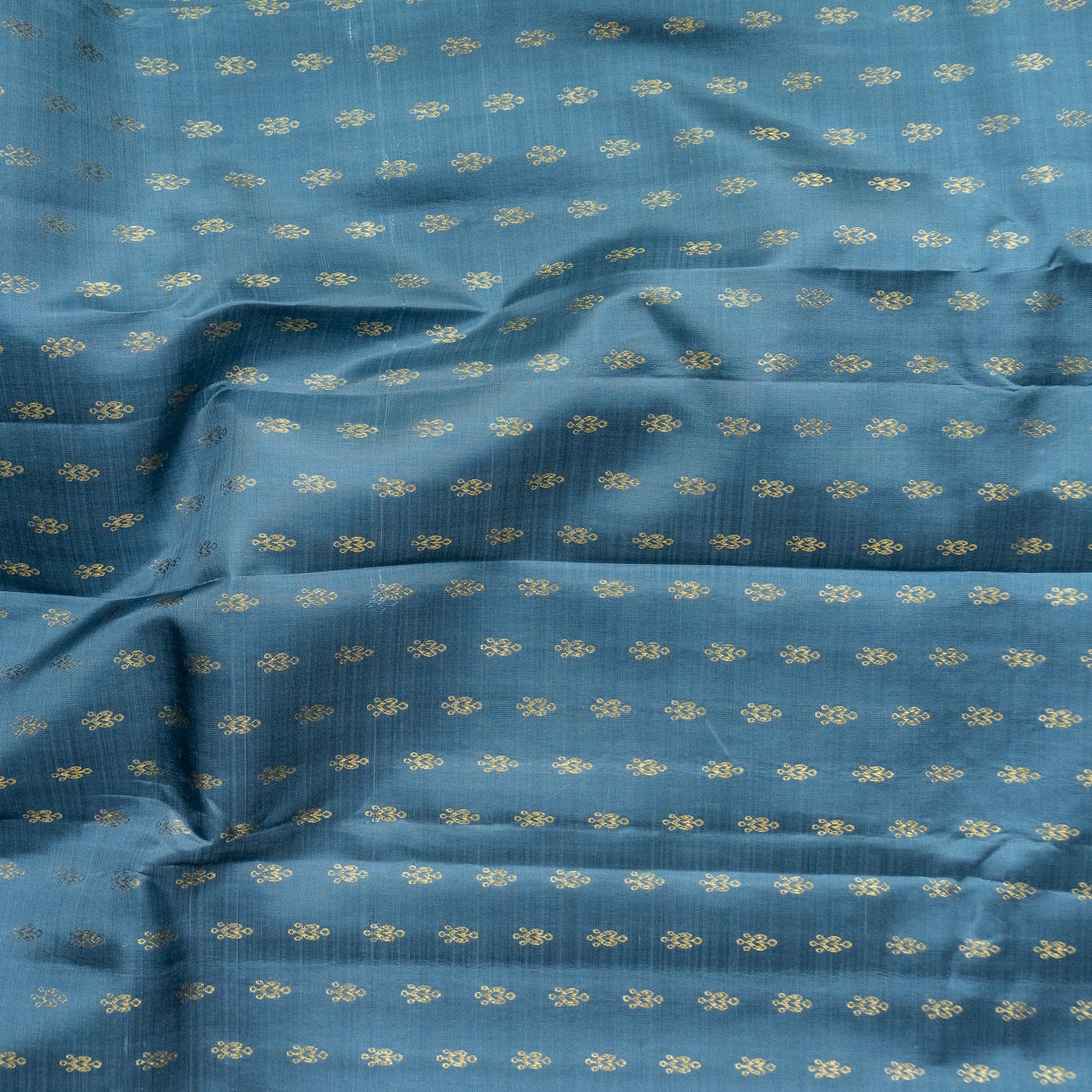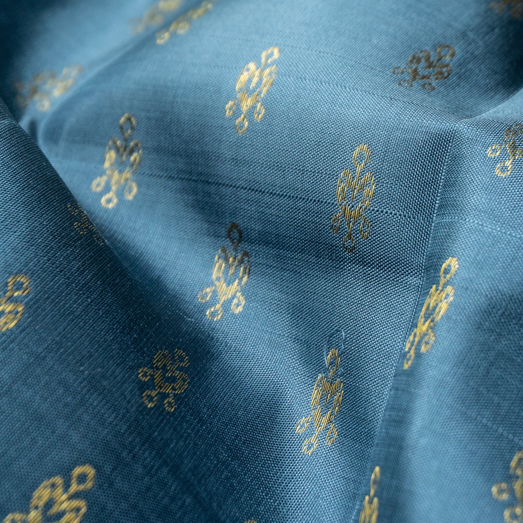 Greyish blue Kanjivaram silk fabric features motifs inspired by traditional jewelry designs, beautifully woven in gold zari.