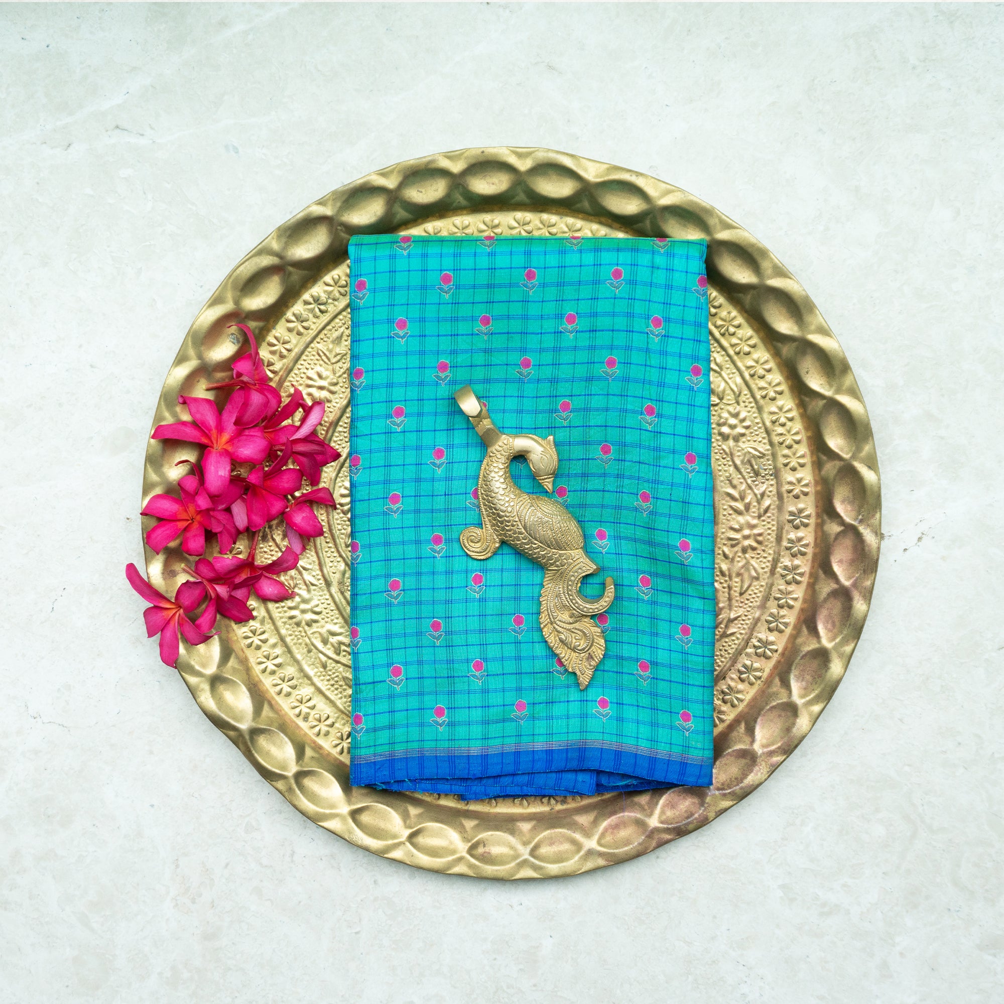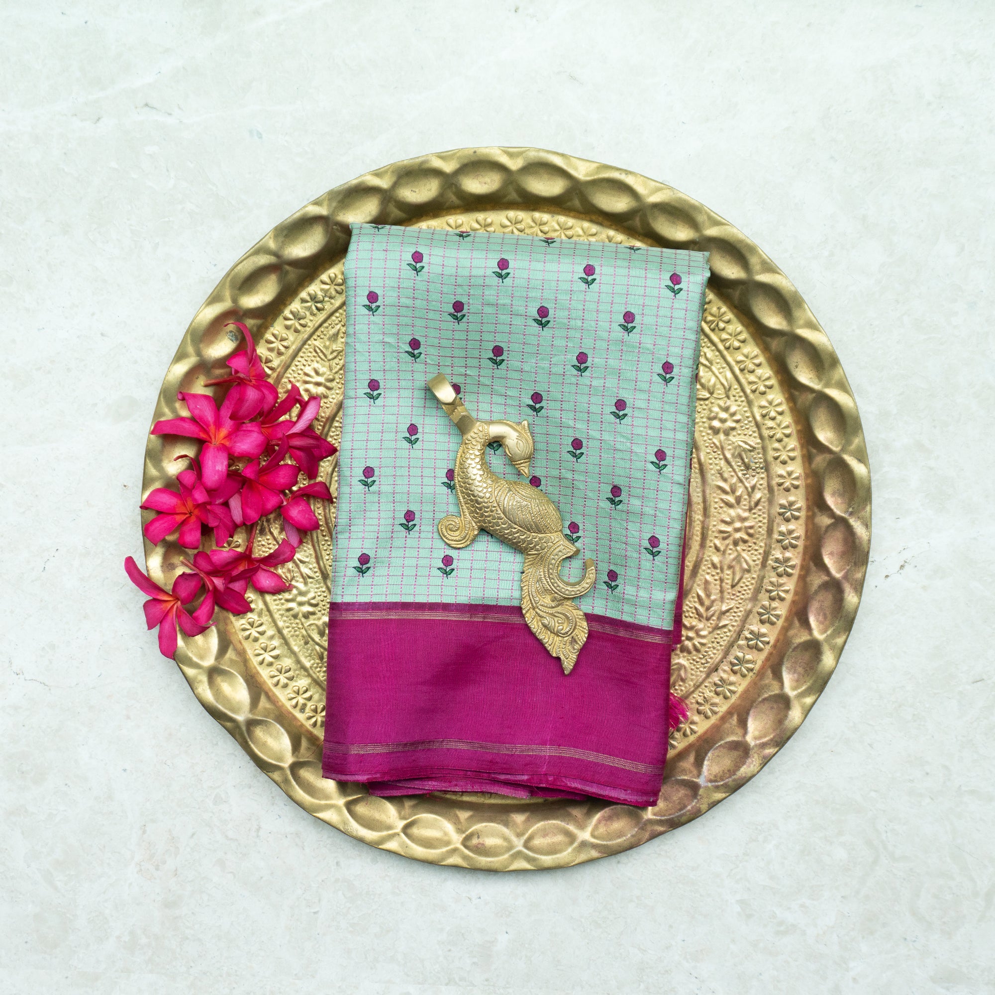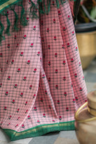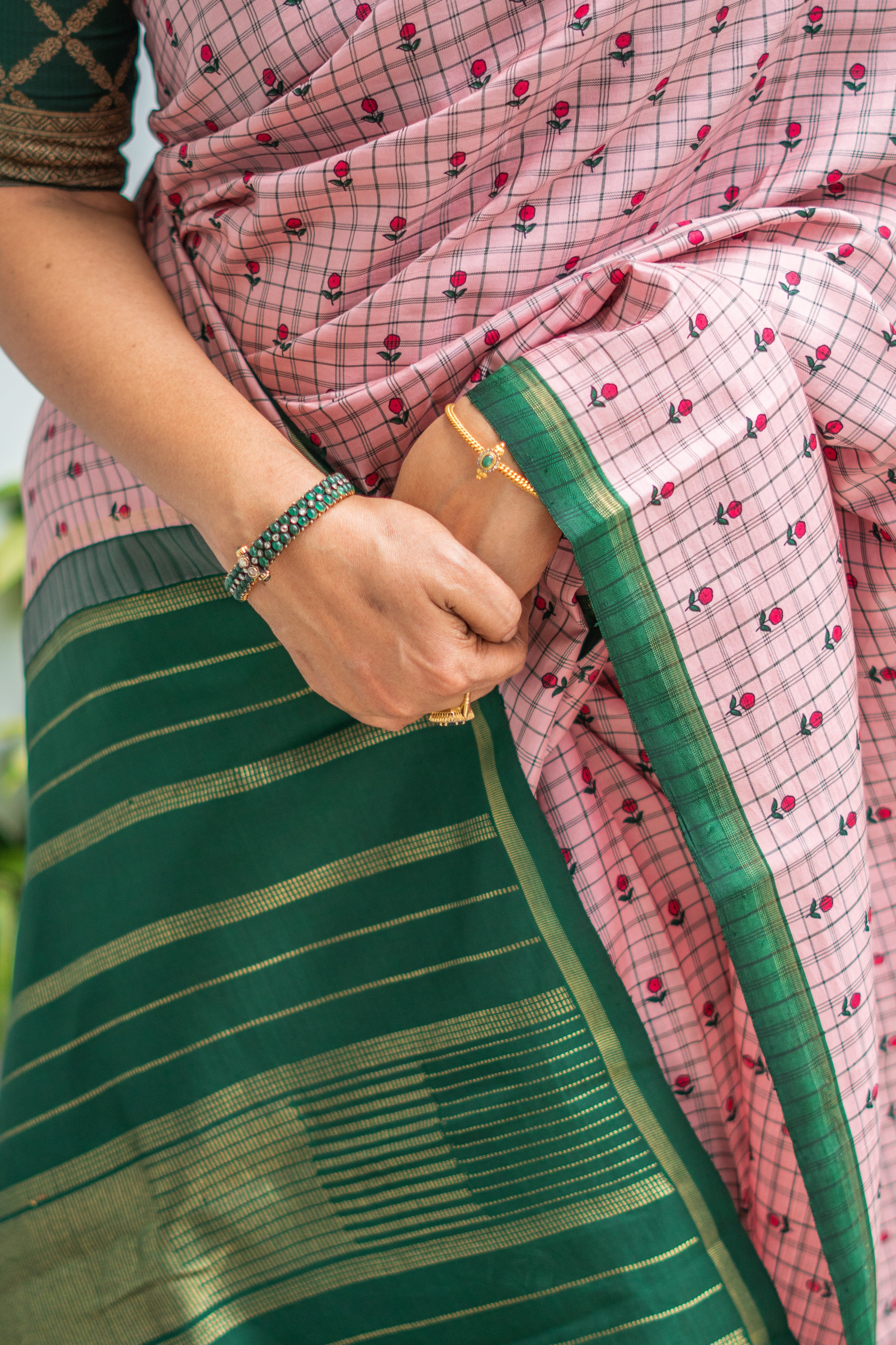 This elegant pastel pink Kanjivaram silk saree blends traditional craftsmanship with contemporary charm. The body is adorned with soft green checks and delicate floral block prints arranged in linear patterns, lending it a graceful, artisanal touch. The saree transitions into a rich bottle green contrast pallu, intricately woven with traditional Kanjivaram motifs in pure gold zari, exuding heritage grandeur.