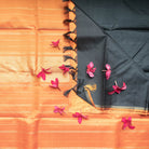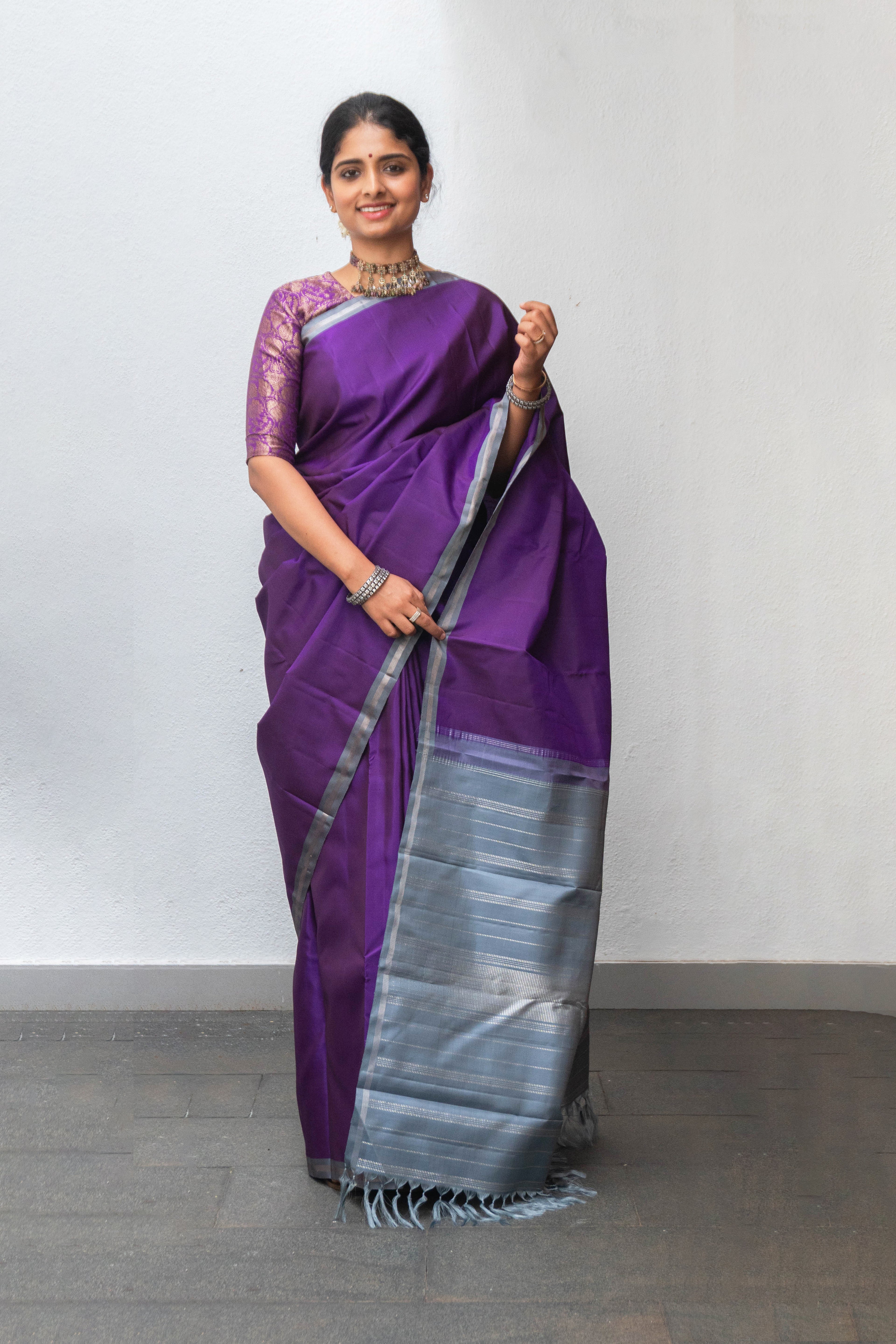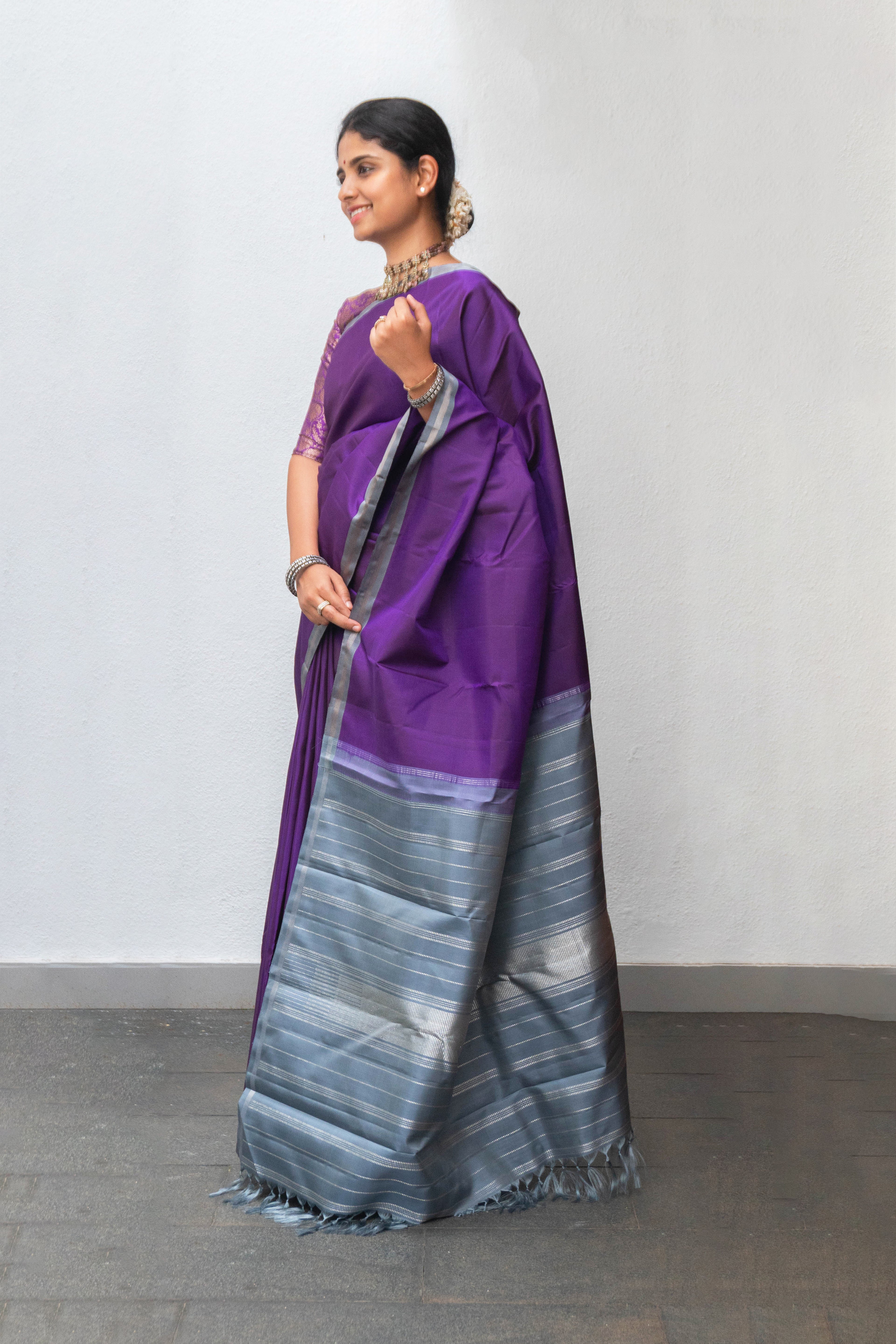 Kathiripoo Kanjivaram silk saree, which is a vibrant shade flows into a grey border with silver zari, and the pallu also has silver zari with seeprekku design.