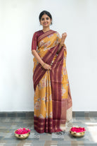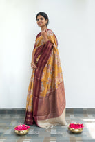 Elegant mustard woven tussar silk saree featuring delicate floral motifs across the body. The rich wine - colored border is highlighted with temple design and two bold zari lines, adding a touch of timeless charm.
