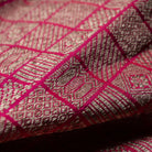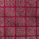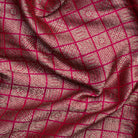 Red checkered banarasi silk with intricate zari detailing in each square, showcasing rich traditional artistry.