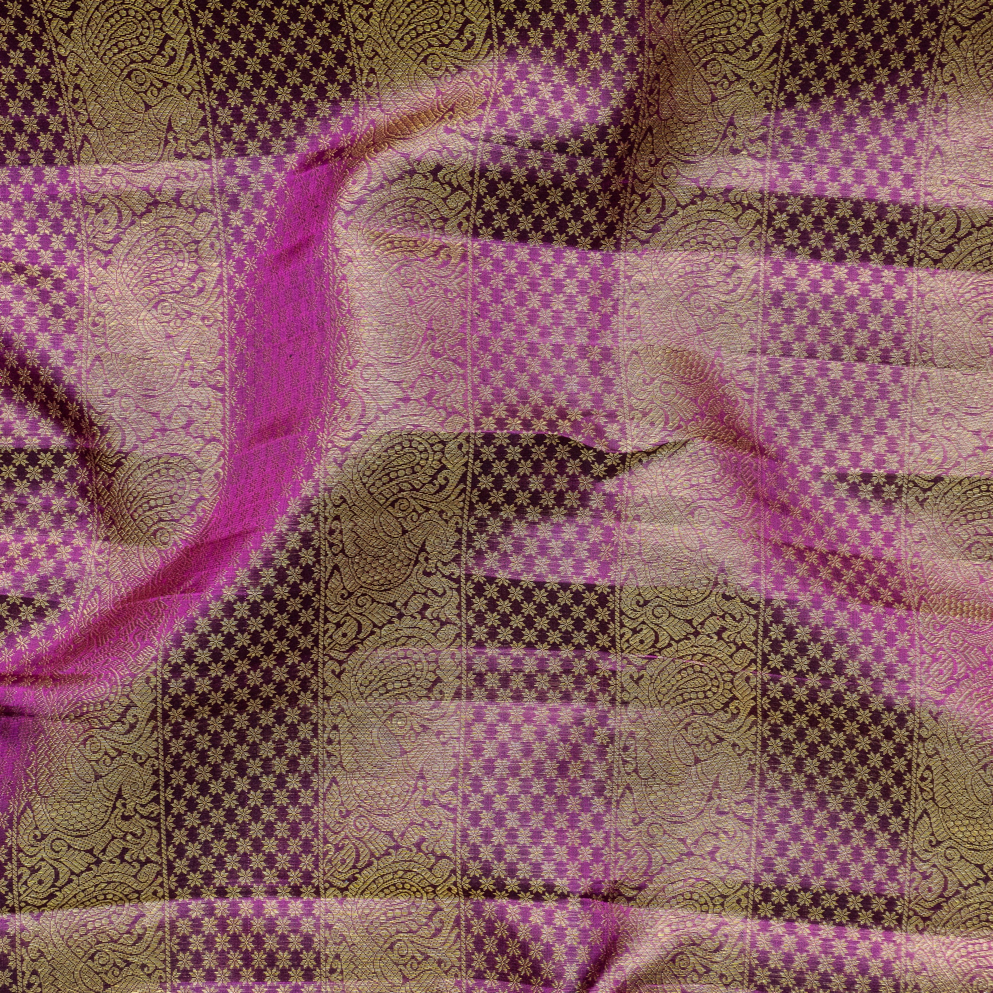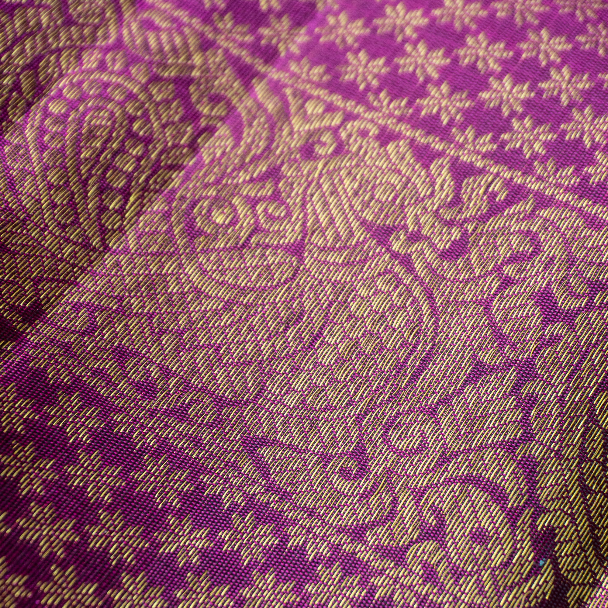 Vibrant purple Kanjivaram silk fabric features intricate peacock and floral motifs in graceful horizontal lines.
