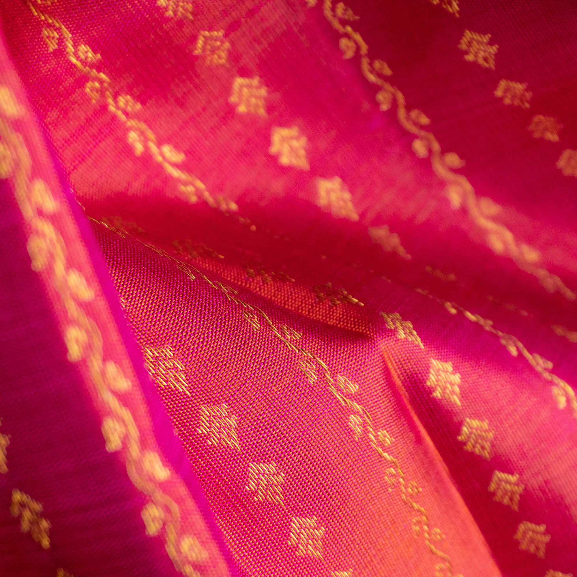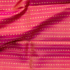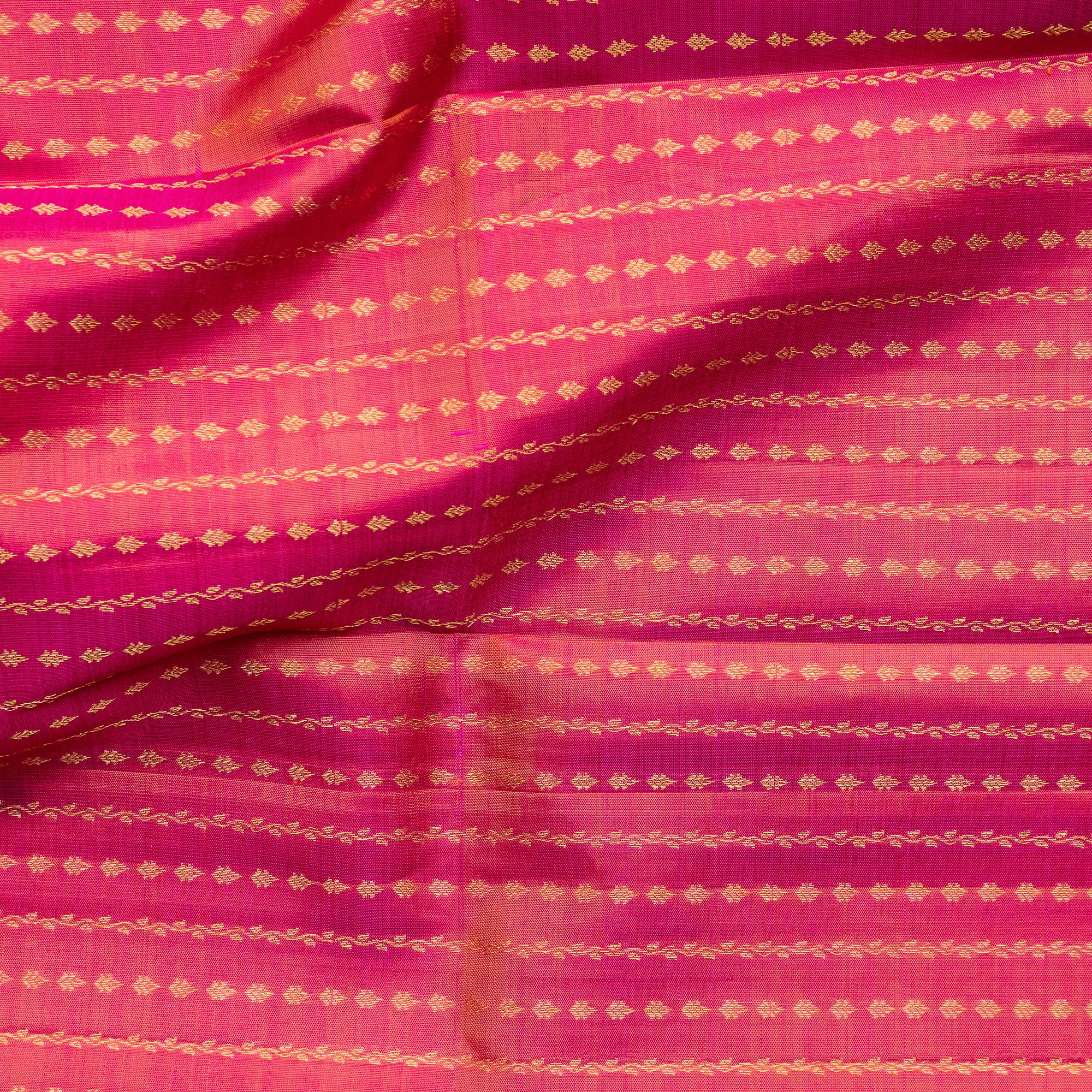 Luxurious peach Kanjivaram silk fabric features floral vines woven in shimmering gold zari. Ideal for crafting sophisticated sarees or festive attire.