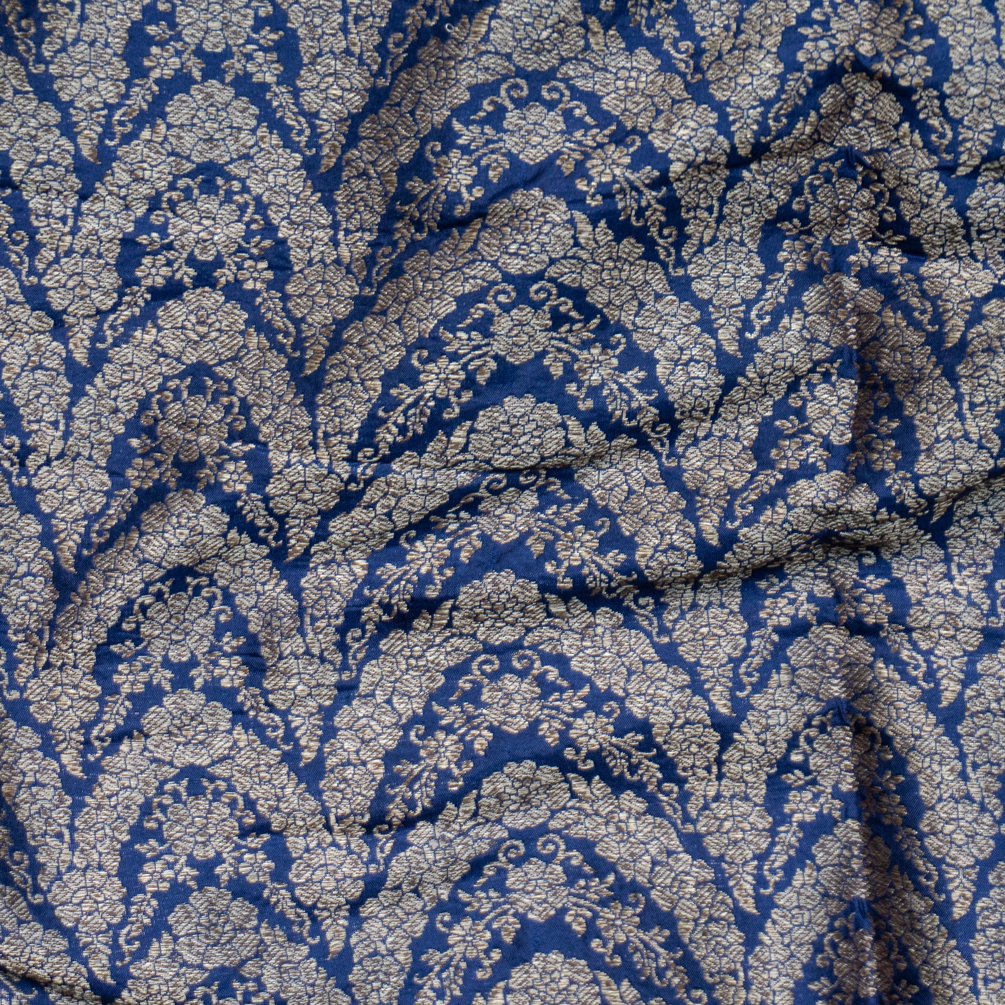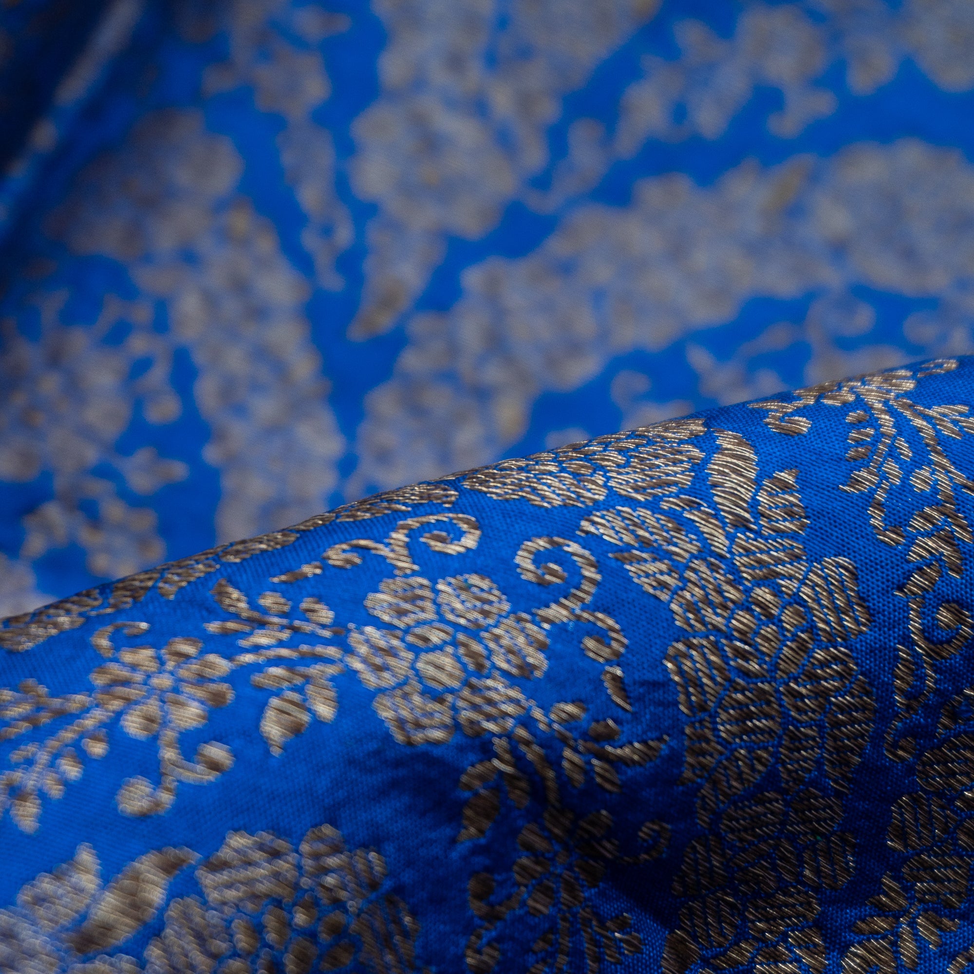 Deep, vibrant blue hue forms a striking canvas for the intricately woven brocade patterns in gold. It’s timeless elegance and rich craftsmanship bring an air of grandeur to any occasion.