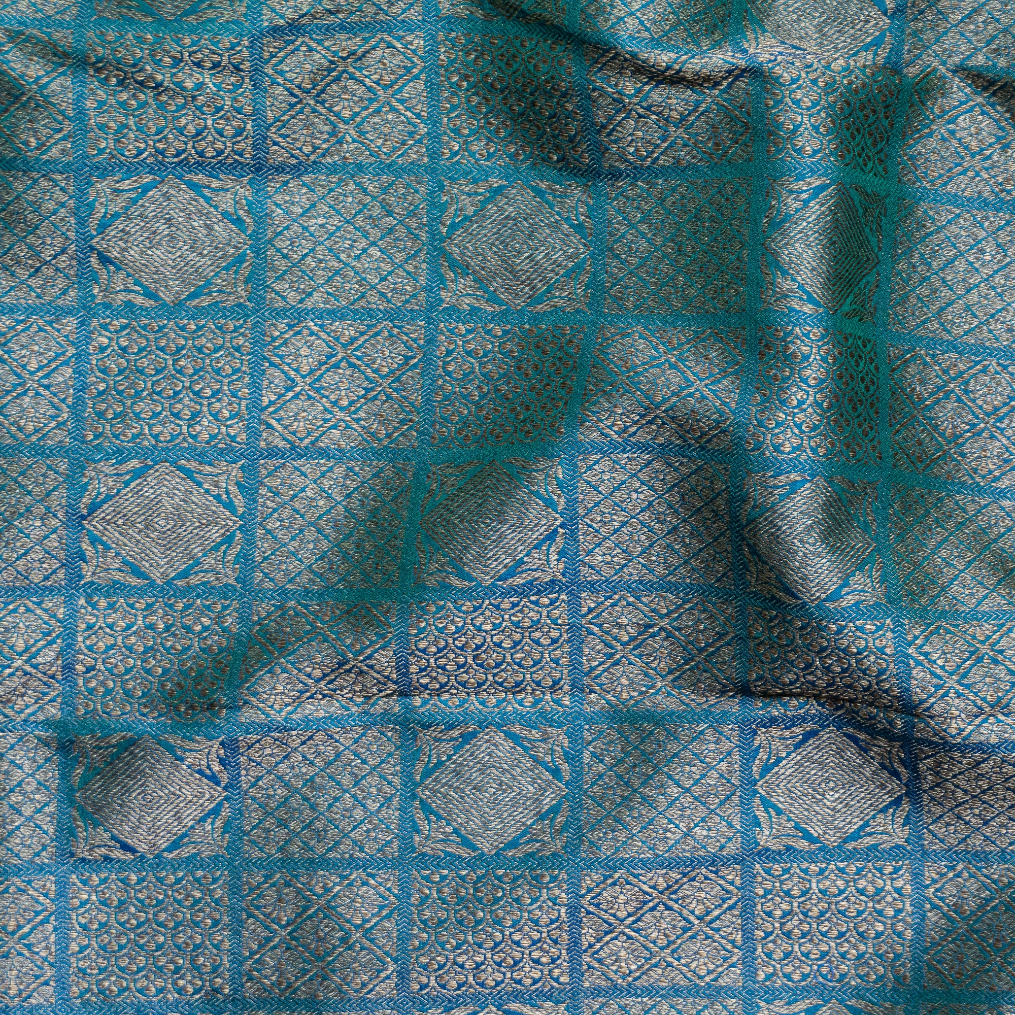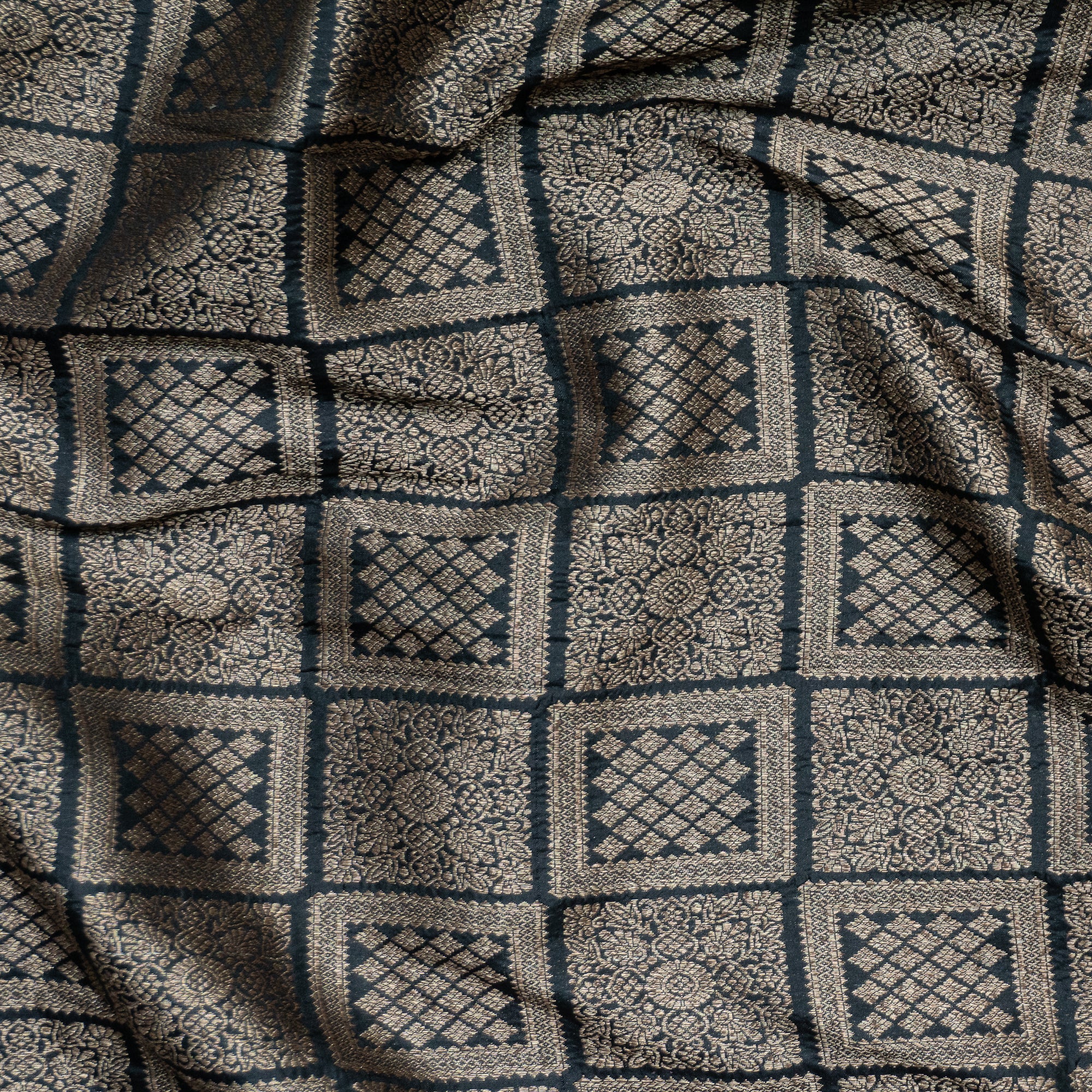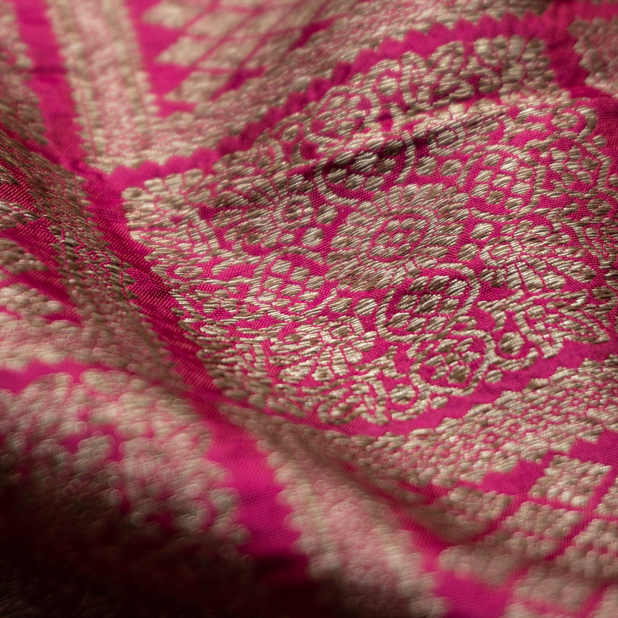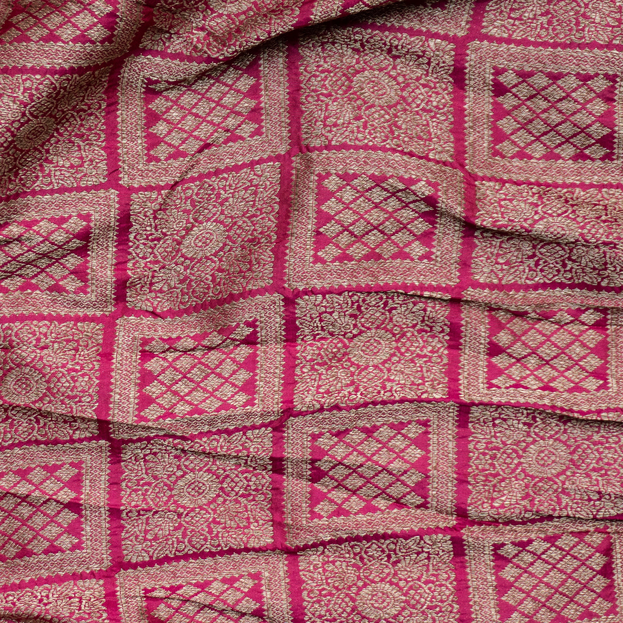This tomato pink banarasi silk fabric features bold checks with intricate floral and geometric patterns. The vibrant punk hue and rich silk texture combine traditional elegance with modern design, making it perfect for creating stunning looks !