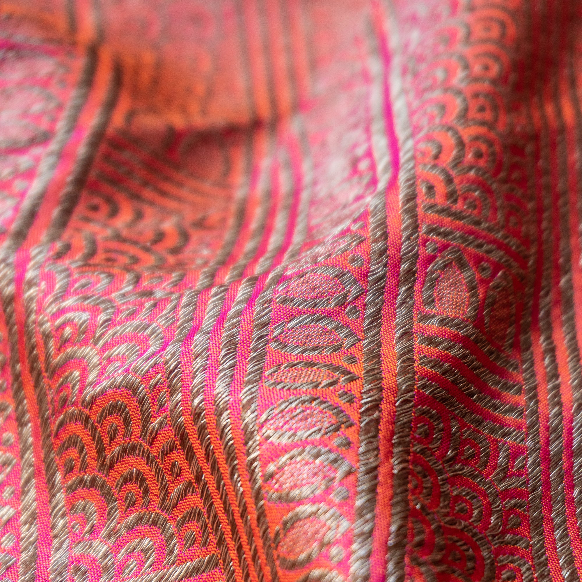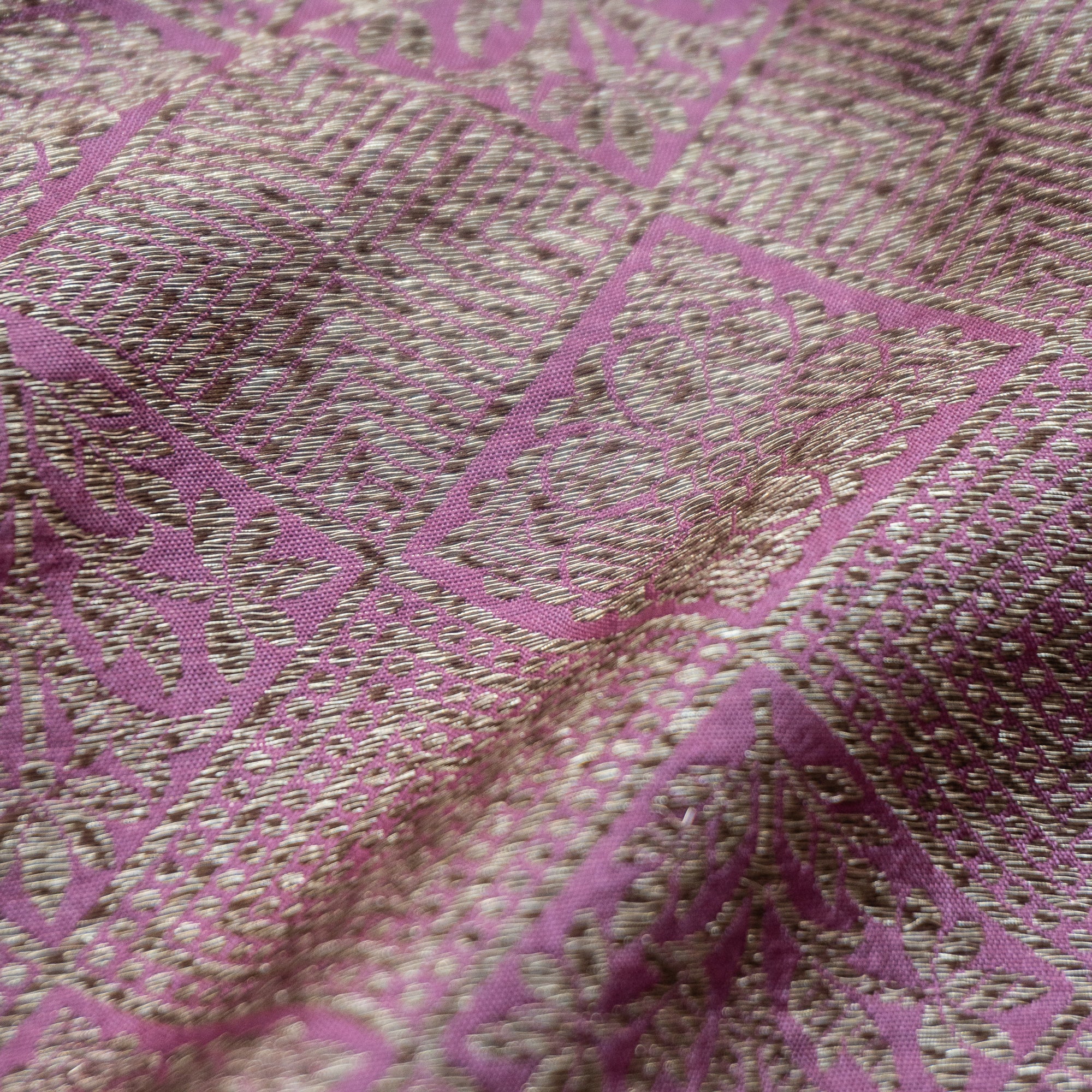 Peach brocade banarasi silk woven with golden zari threads, features ornate motifs. The soft peach hue enhances its timeless elegance, making it perfect for festive occasions.