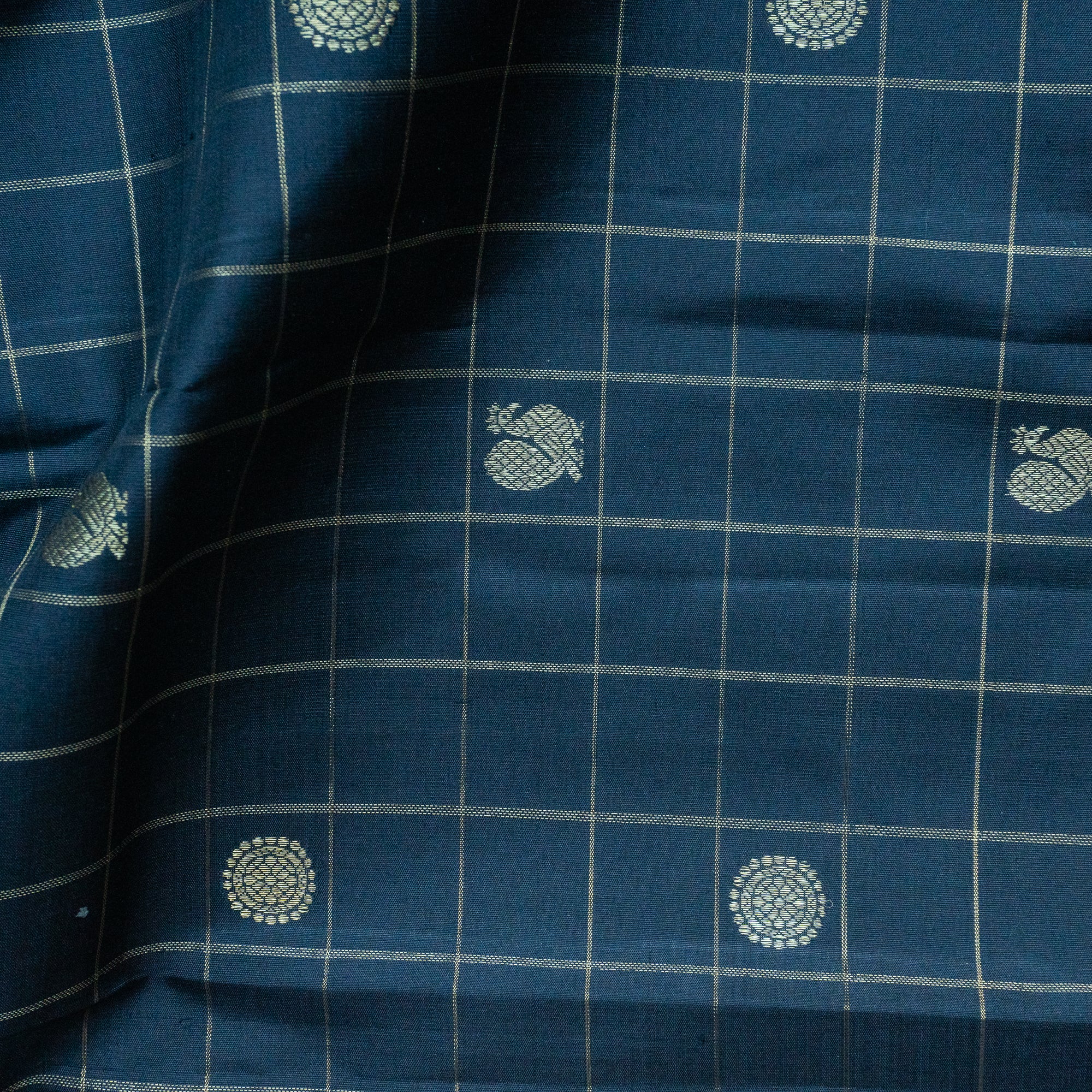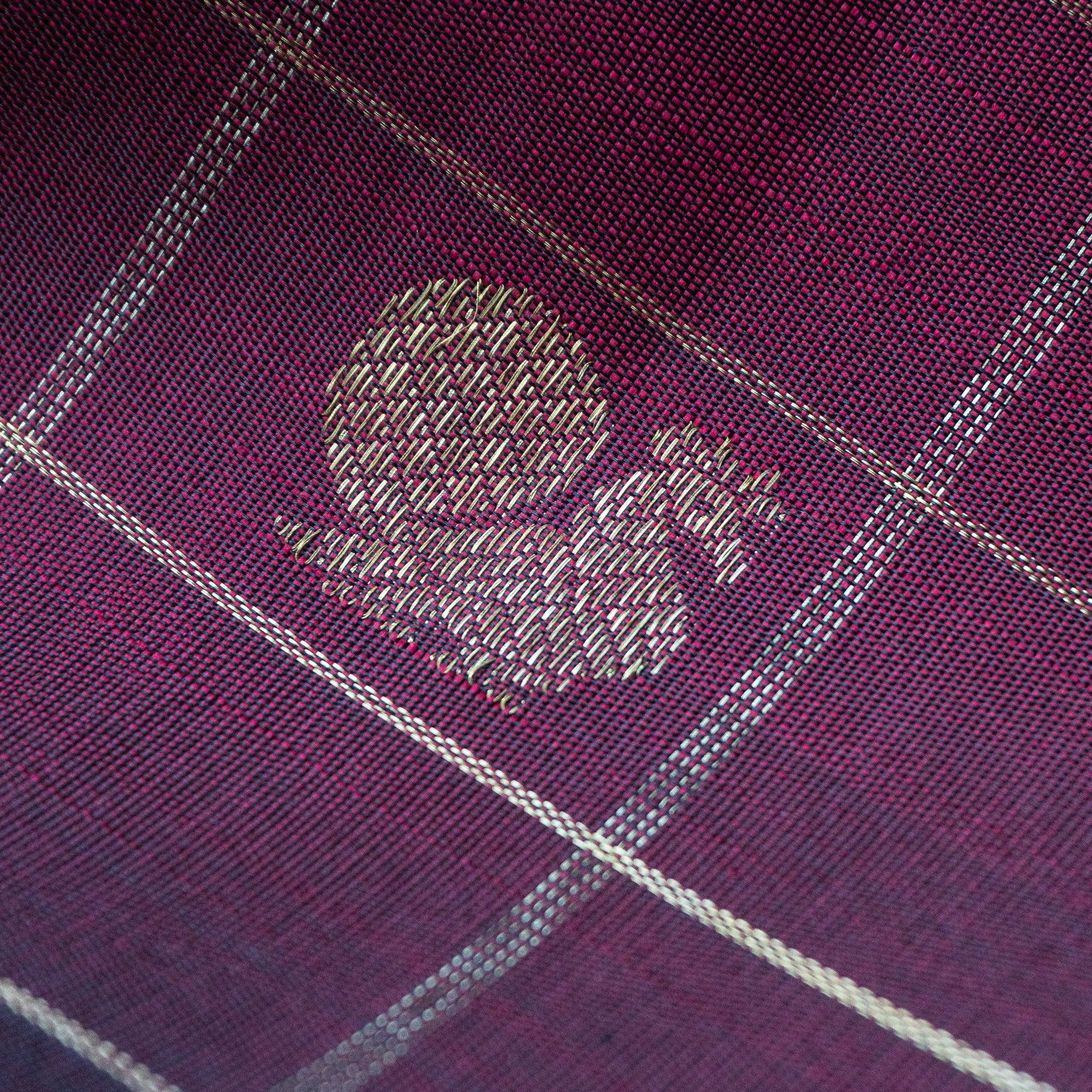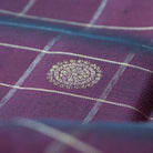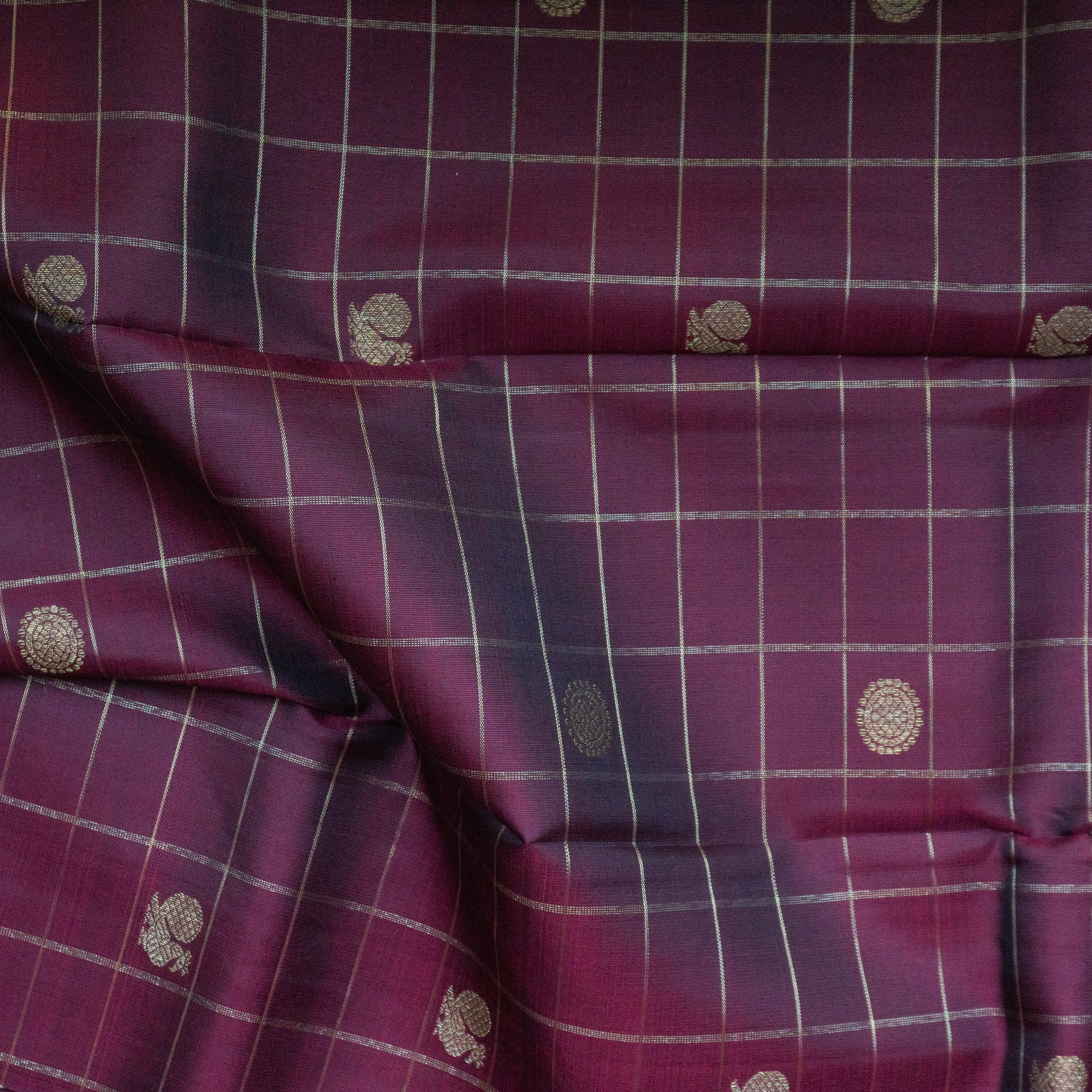 A wine - colored Kanjivaram silk with zari checks, featuring peacock and chakram motifs, combines regal elegance with cultural symbolism. Perfect for a special occasion .