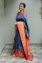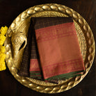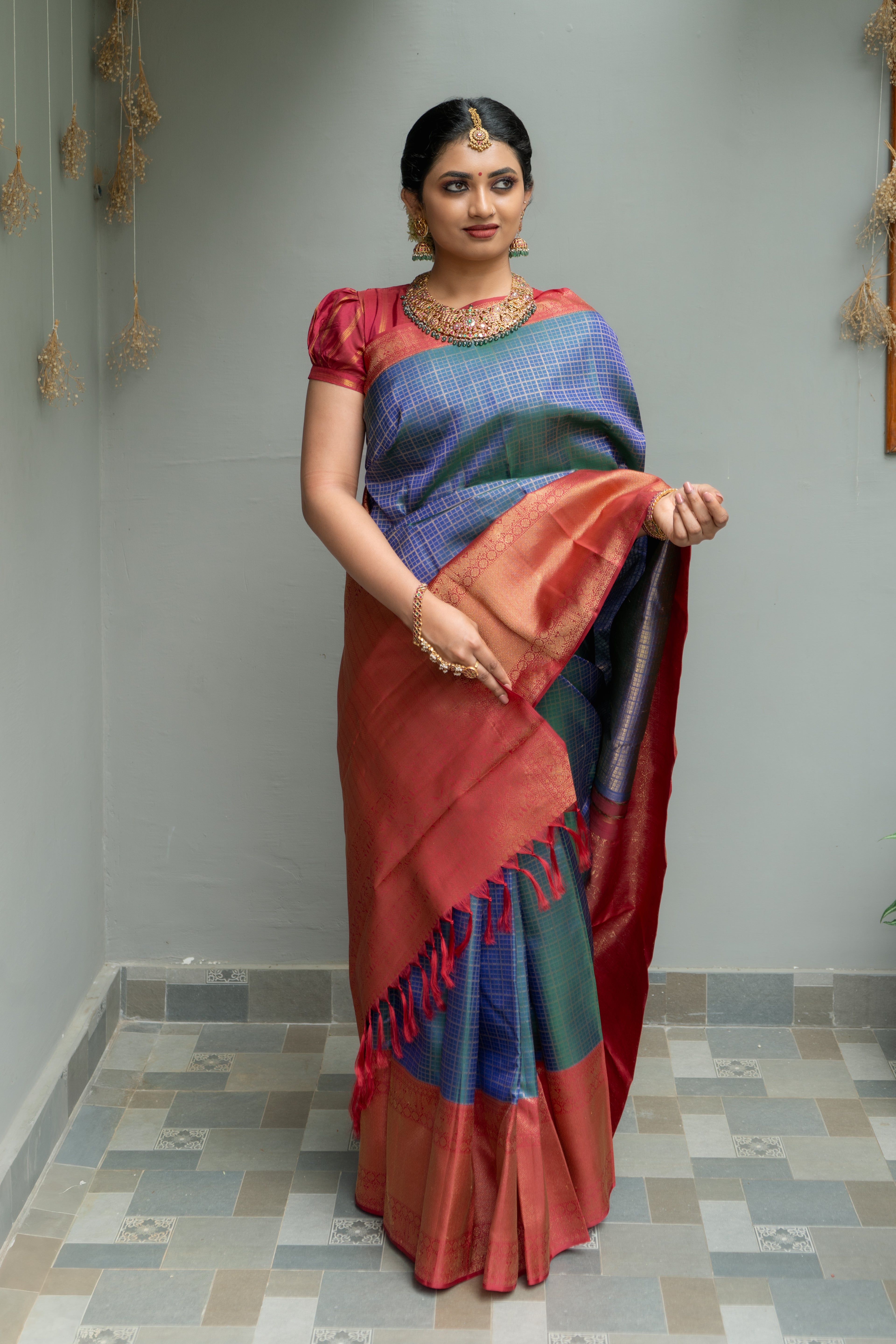 Peacock Blue Kanjivaram silk sari with checks on the body. The Korvai border is short on one side and broad on the other in traditional “arakku” ( red) shade with gold zari motifs. The pallu has elephants, yazhi, peacock, and geometric patterns.