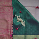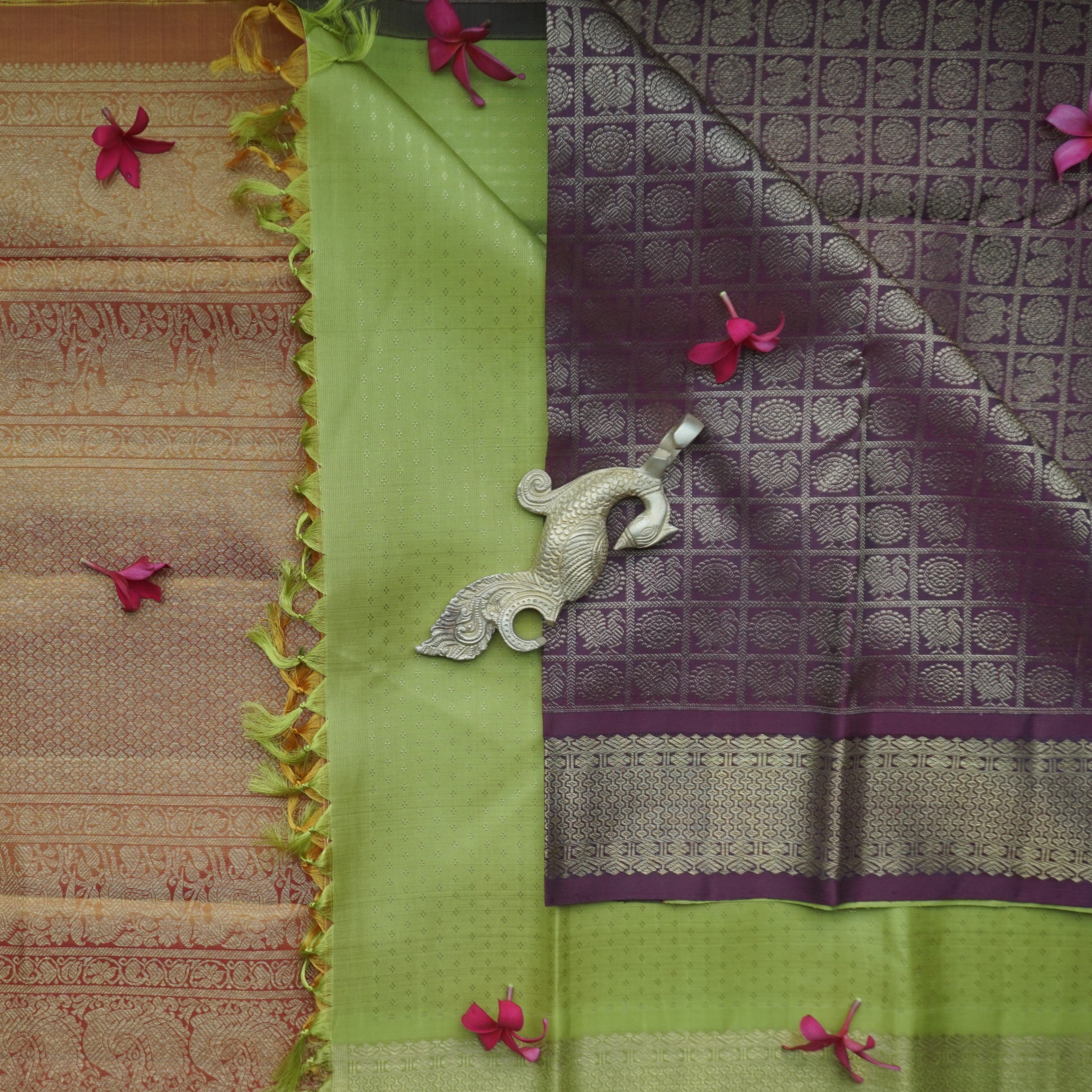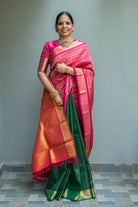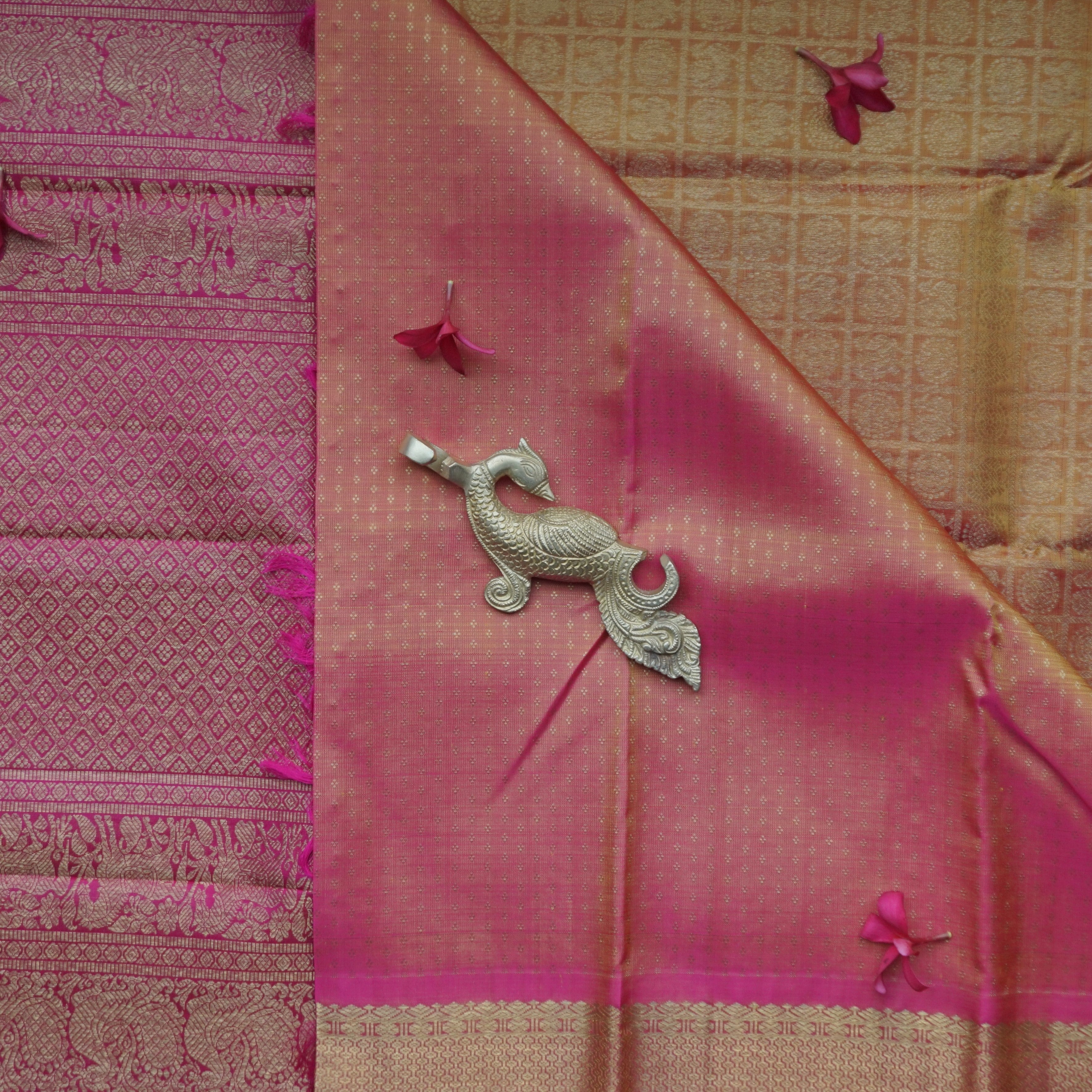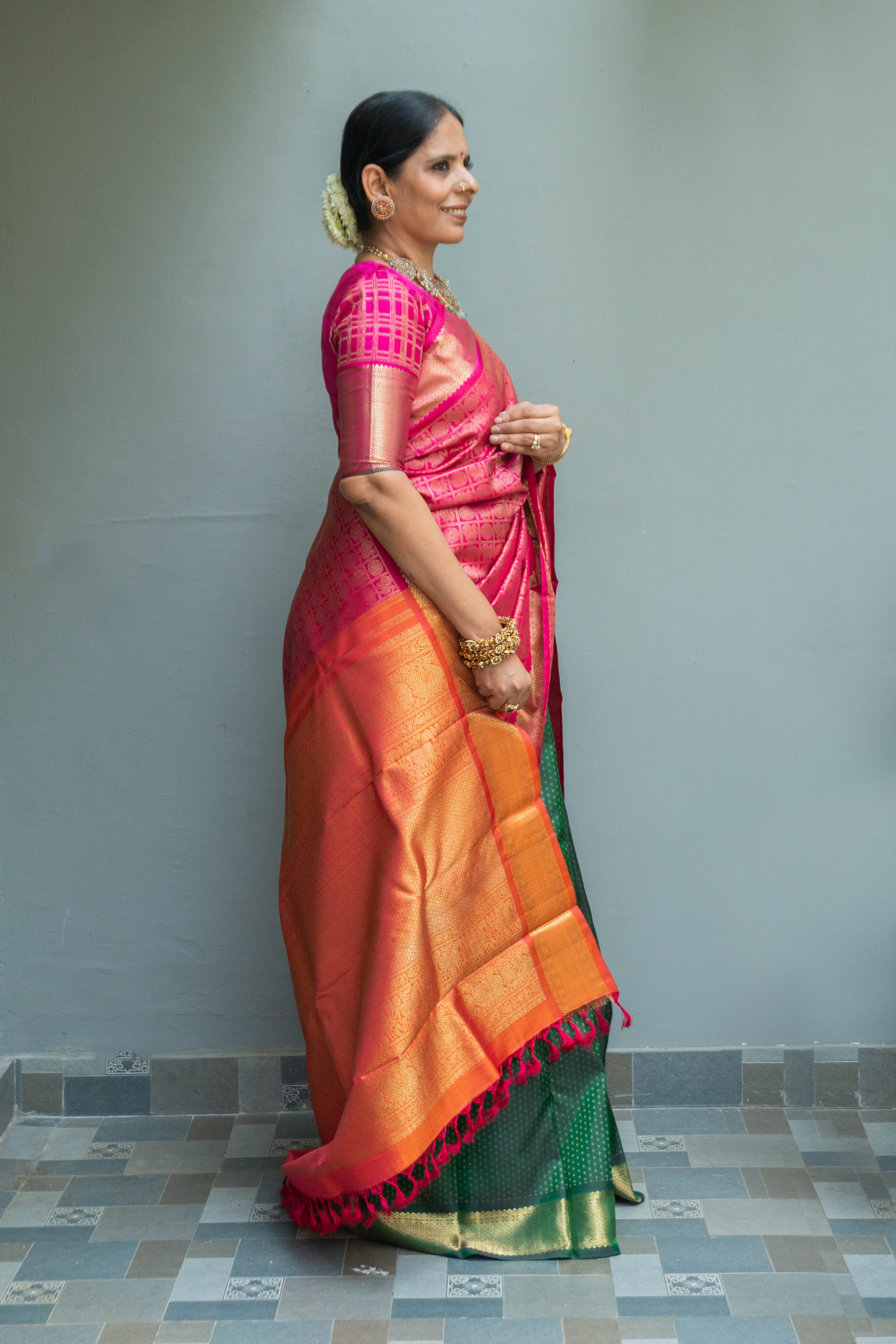 An interplay of colours. Rani Pink Kanjivaram in the shoulder with “Mayil-Chakram” enclosed in checks and pleats is bottle green with “Kuil-kann” motifs with border. The pallu is a beautiful coral orange which has been intricately woven in pure gold zari. The pallu features animal figurines, floral motifs and geometric designs. The border is a traditional border.