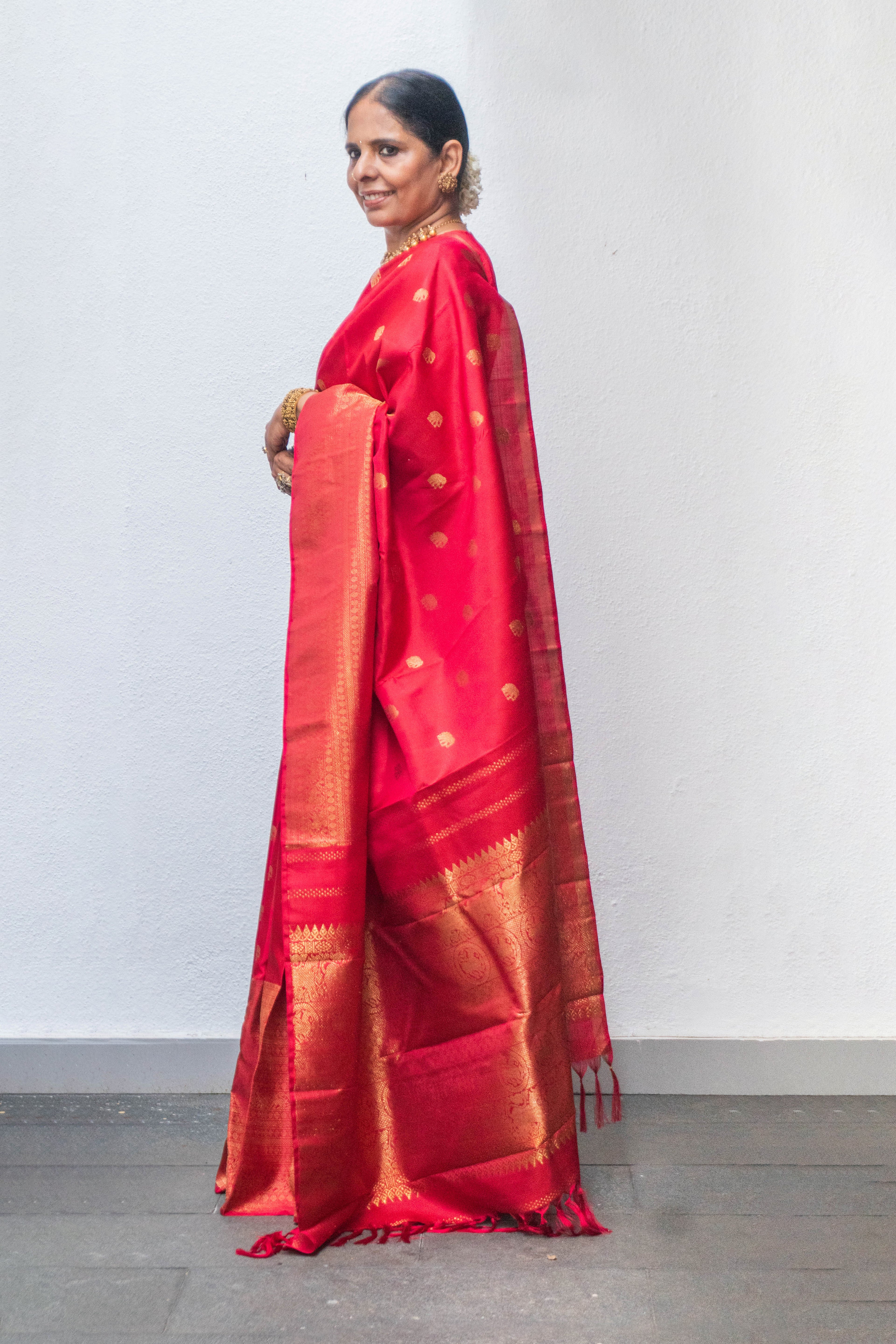Bold red Kanjivaram silk saree with elephant motifs adorned in the body woven with pure gold zari. The pallu is beautiful with vivid “yazhi” motifs and geometric pattern and blouse has vertical dotted lines with border. The long border is stunning with intricate details making it a timeless addition to any collection.