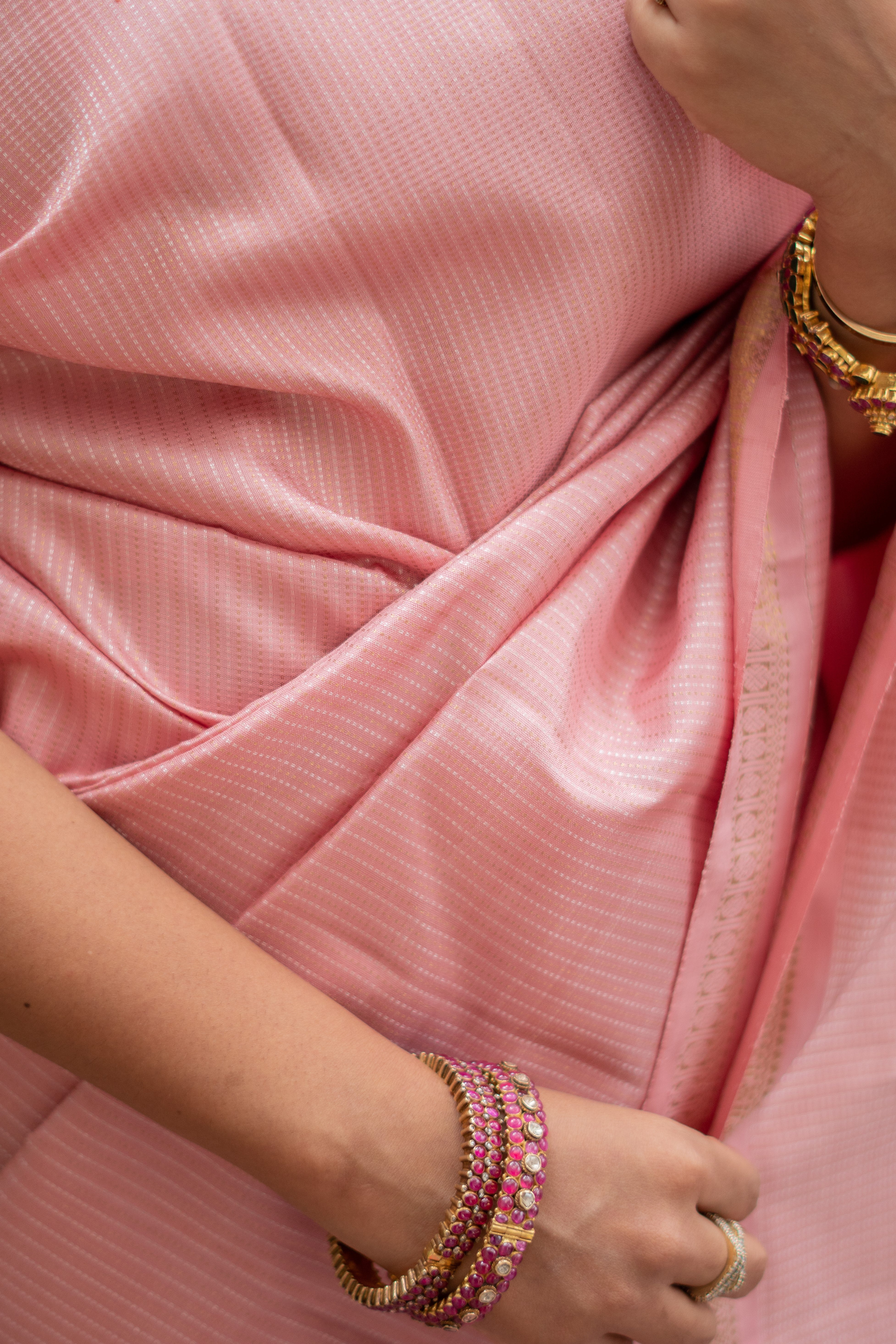 Pastel Pink Kanjivaram Silk Saree with Gold–Silver Zari Lines and Classic Zari Border