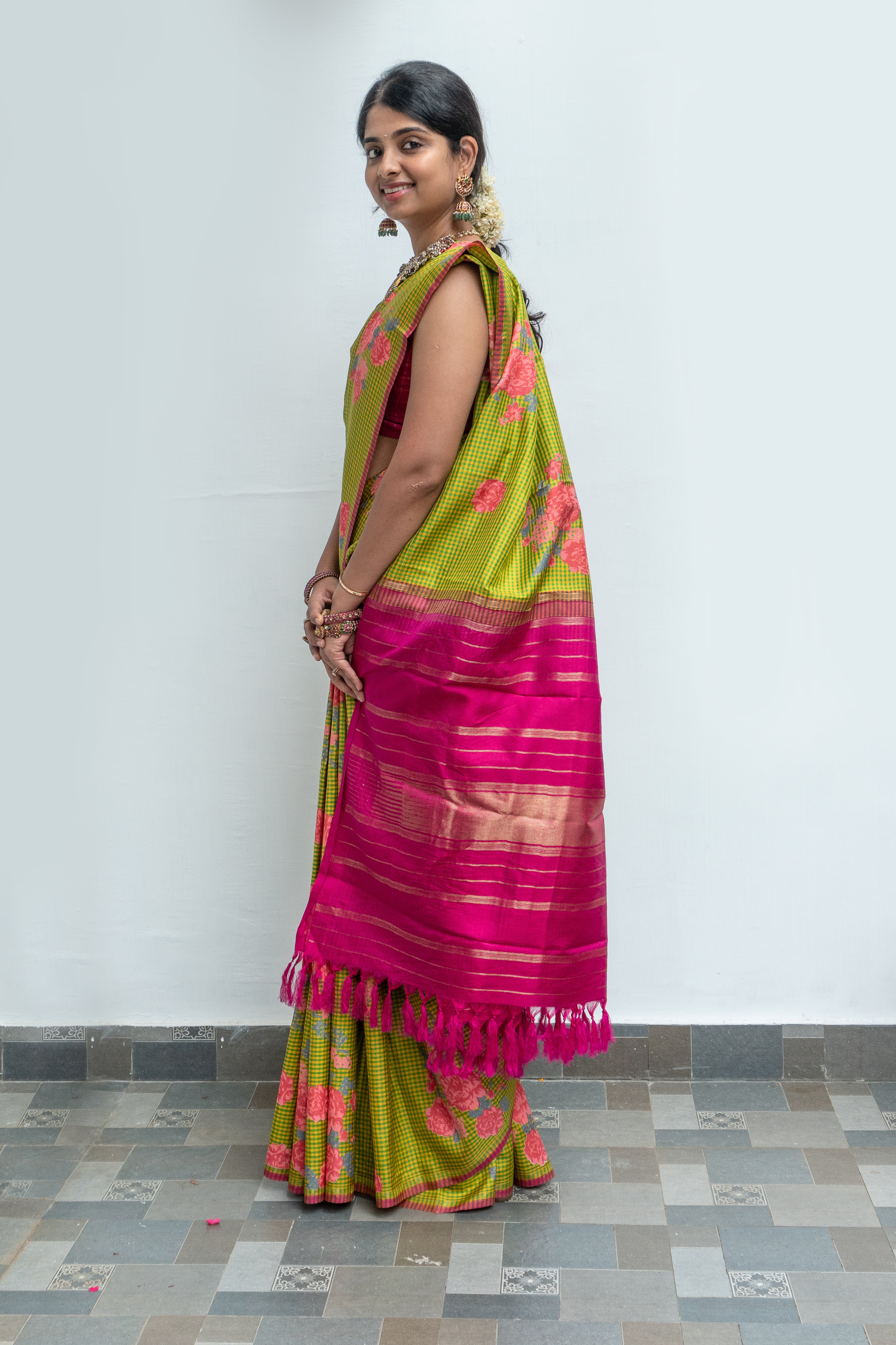 Kanchi Organza Silk Saree with Micro Checks, Eco Print Motifs and Neon Green Pallu
