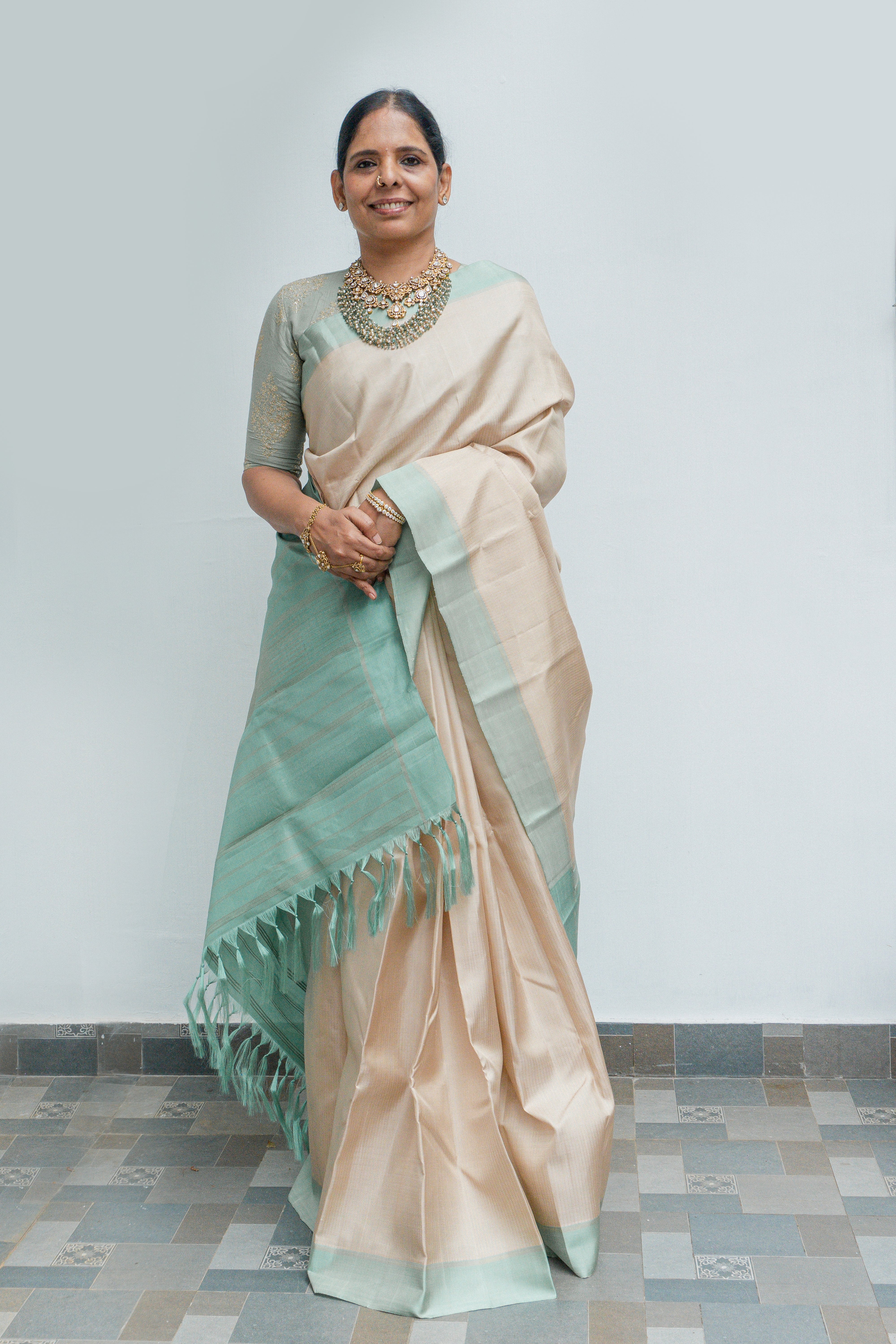 Ivory Kanjivaram Silk Saree with Gold Zari and Mint Green Contrast Border