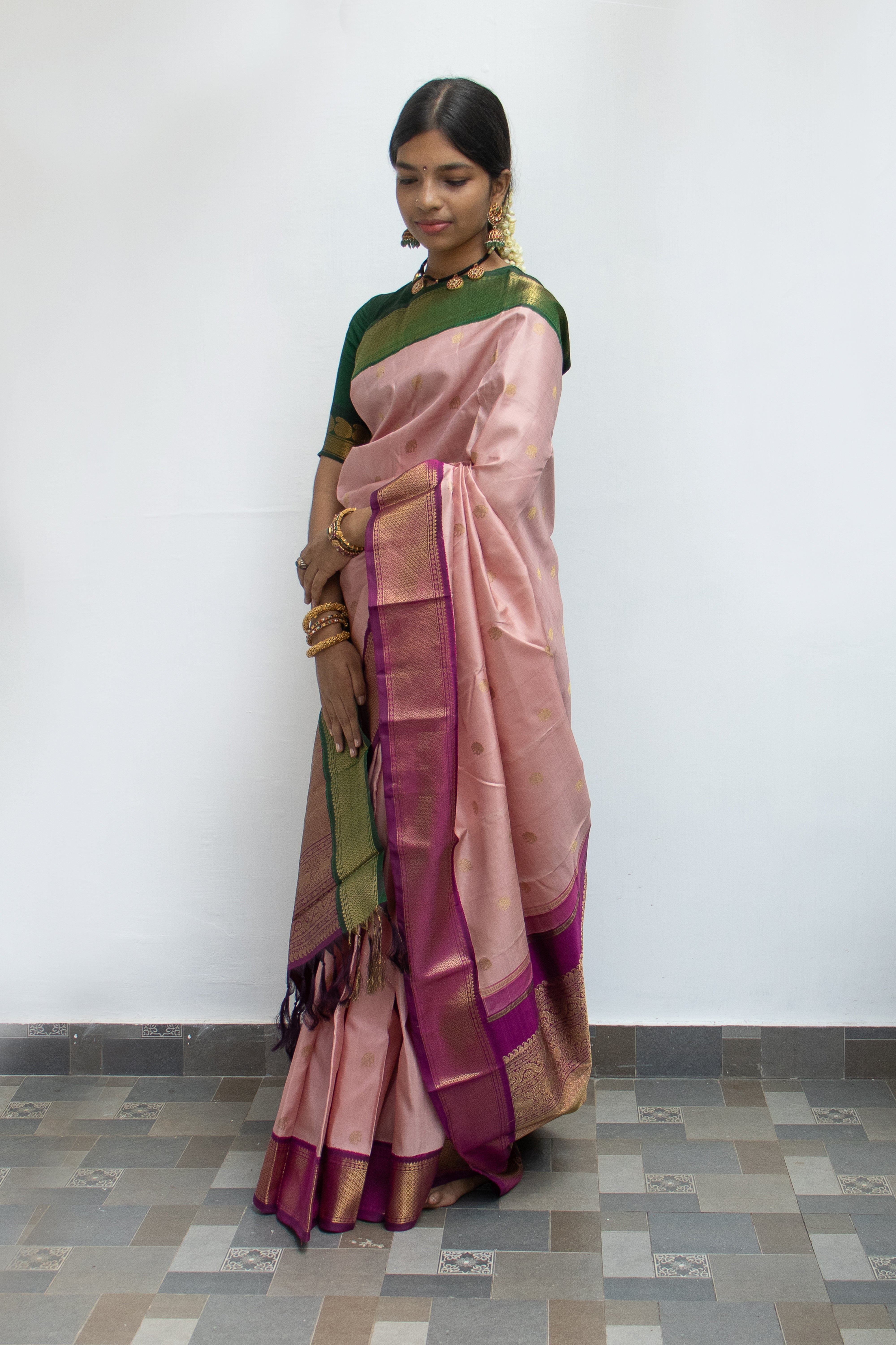 Blush Pink Kanjivaram Silk Saree with Black Aramadam Border and Seer Pallu