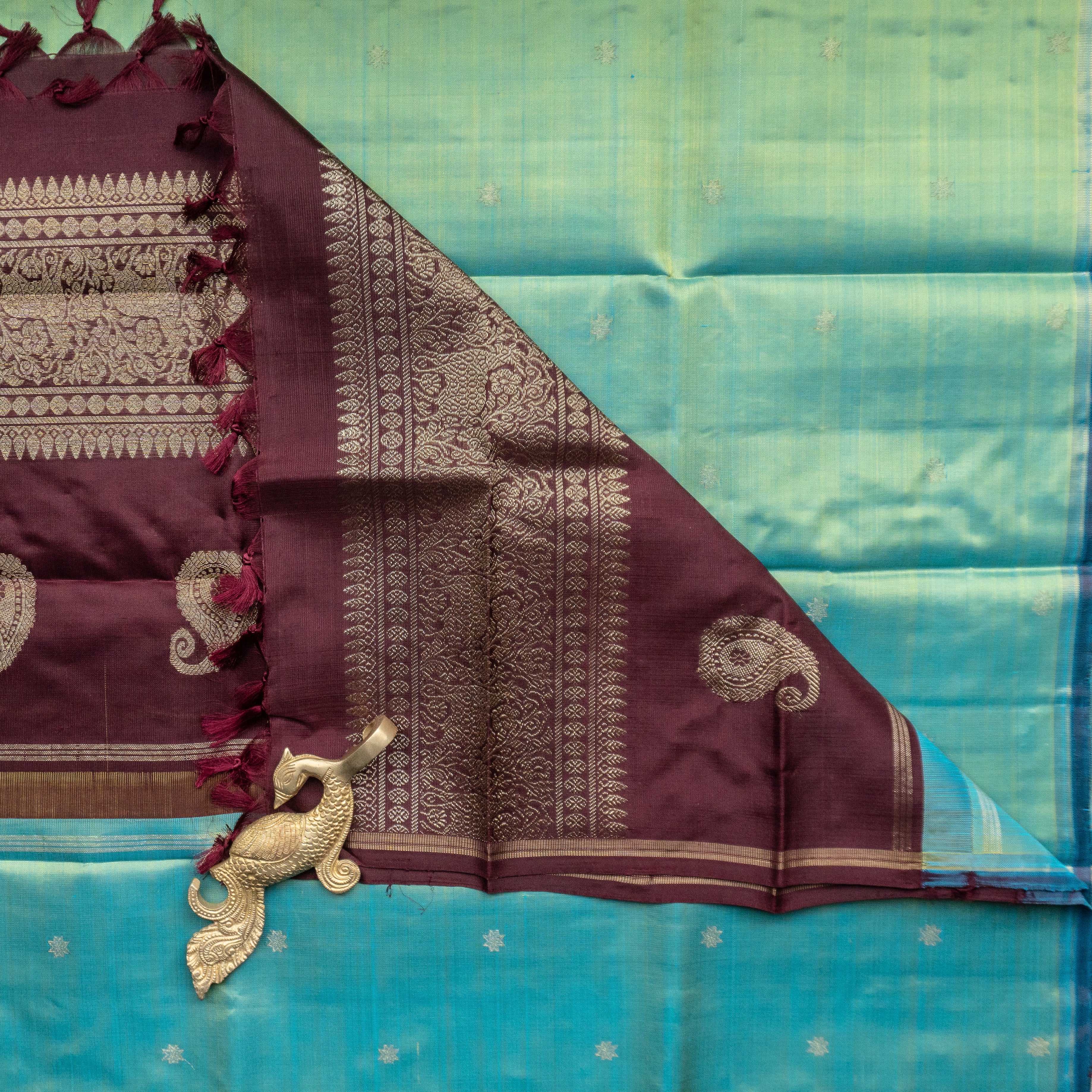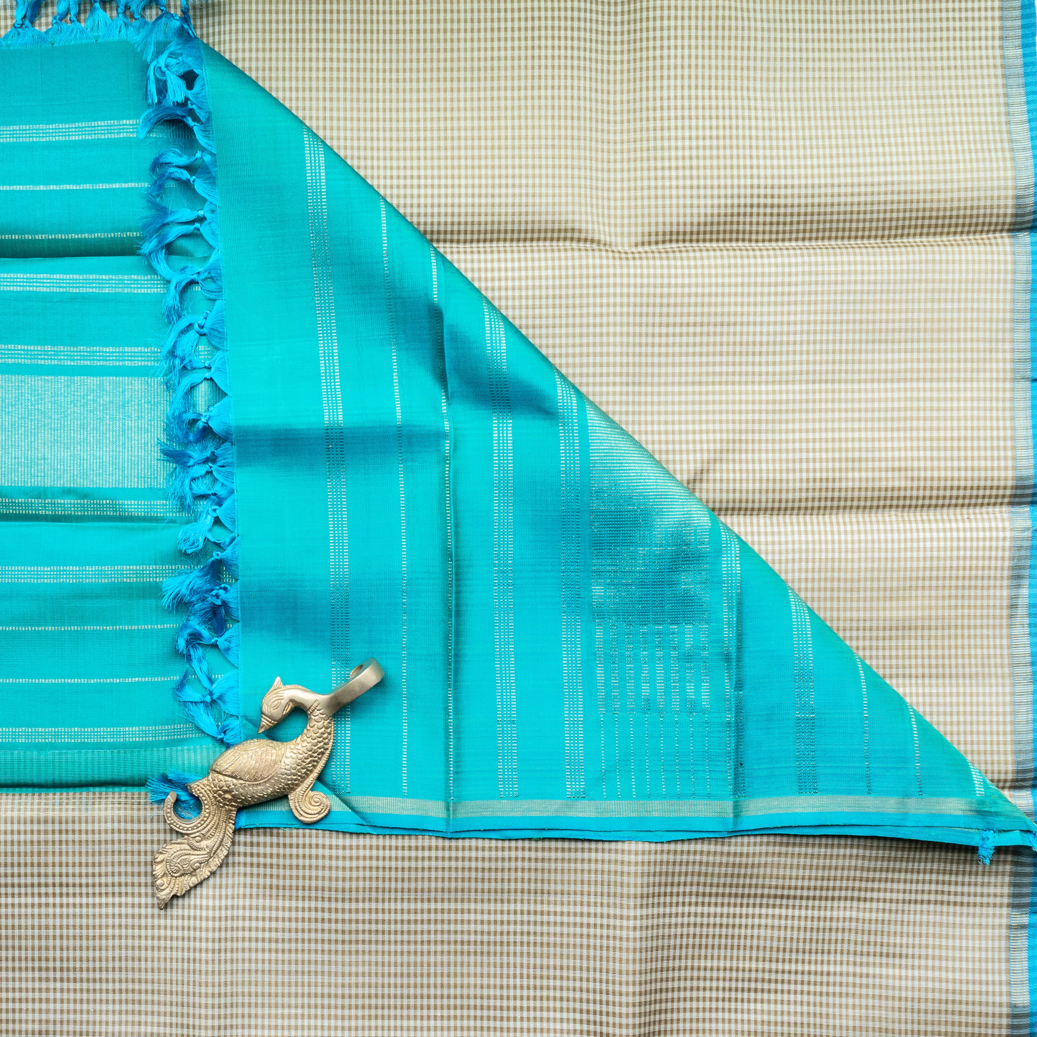 Grey Kanjivaram Duppatta With Turquoise Blue Border With Florals