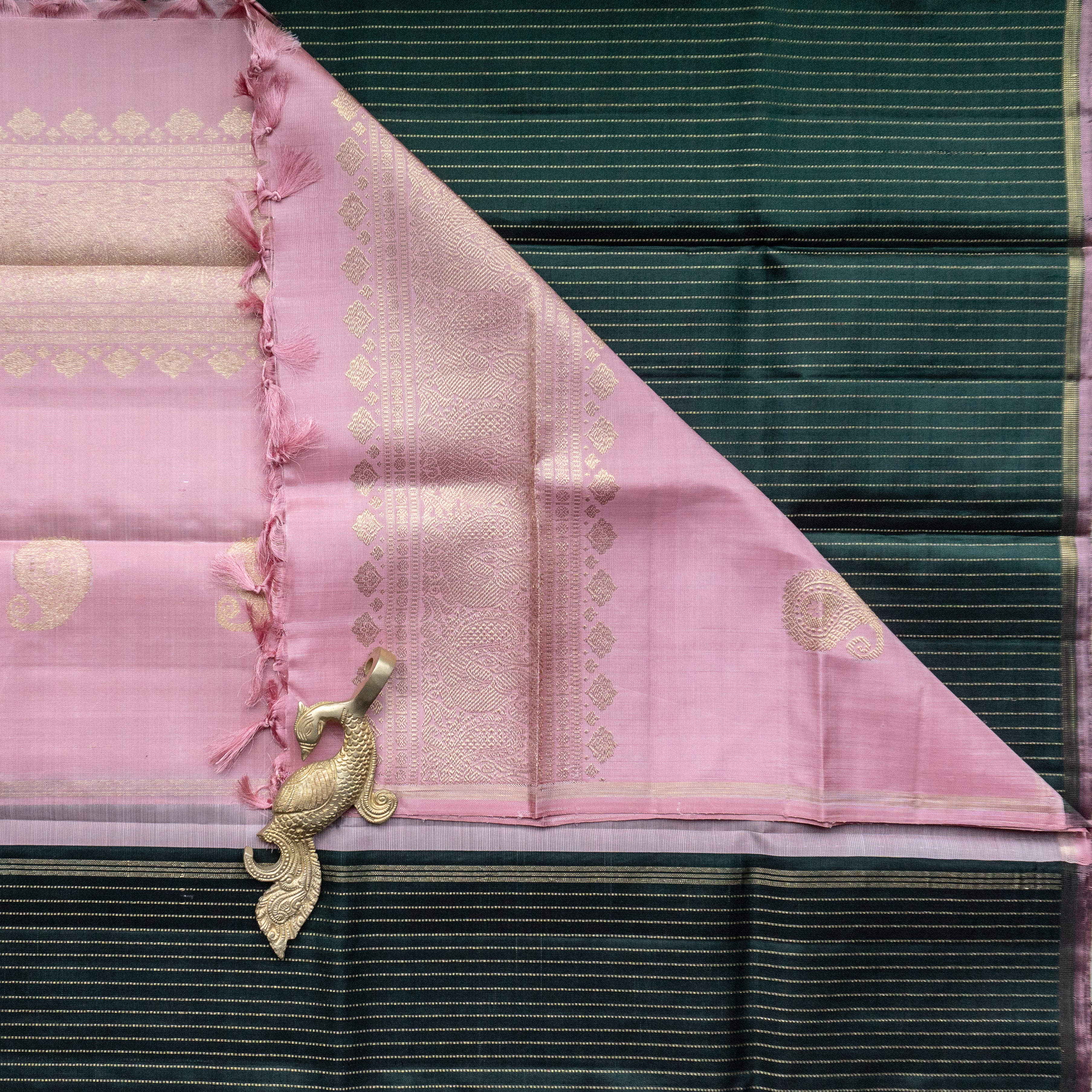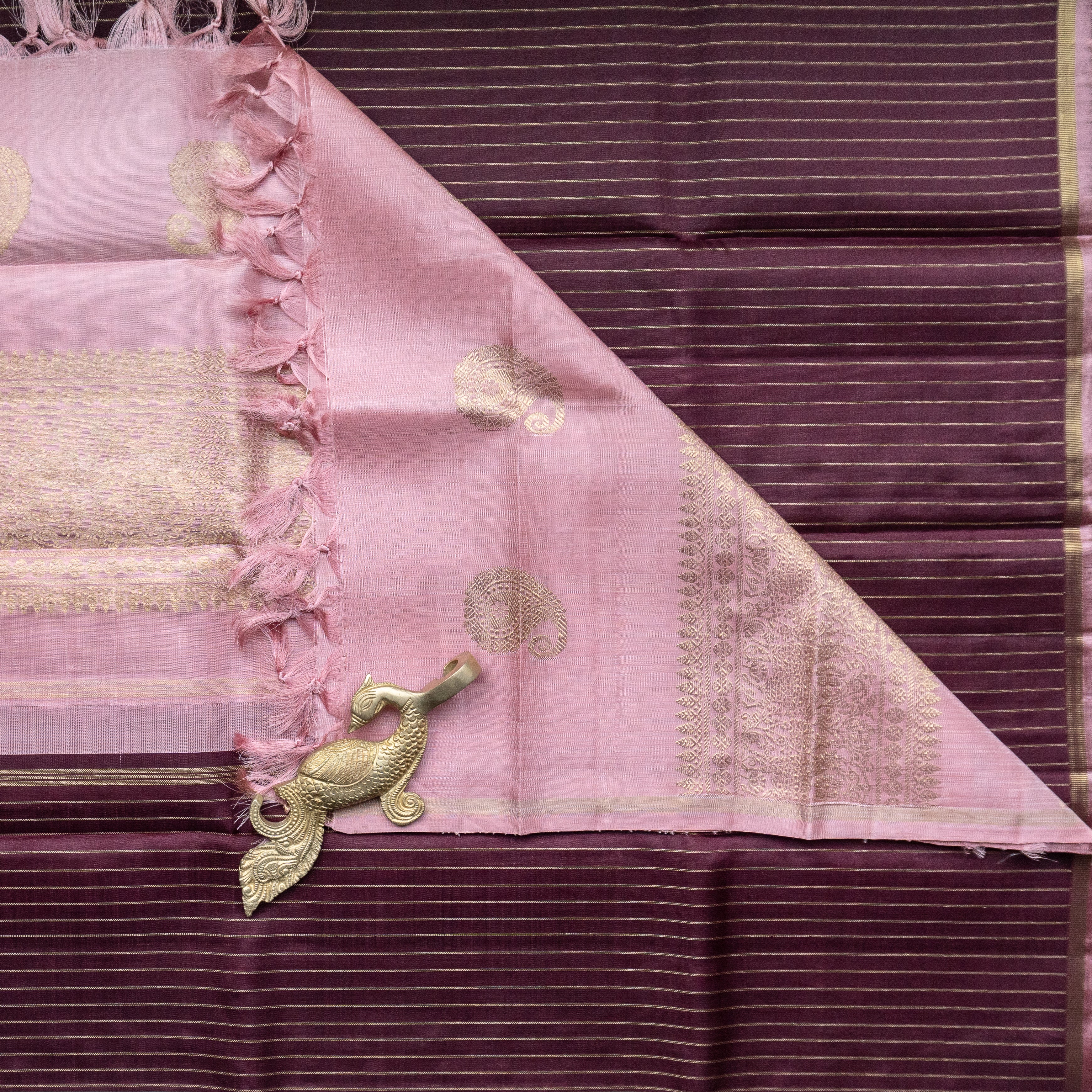 Brown kanjivaram Duppatta with subtle zari stripes, complemented by pastel pink sides adorned with rich traditional zari work for a refined and elegant look.