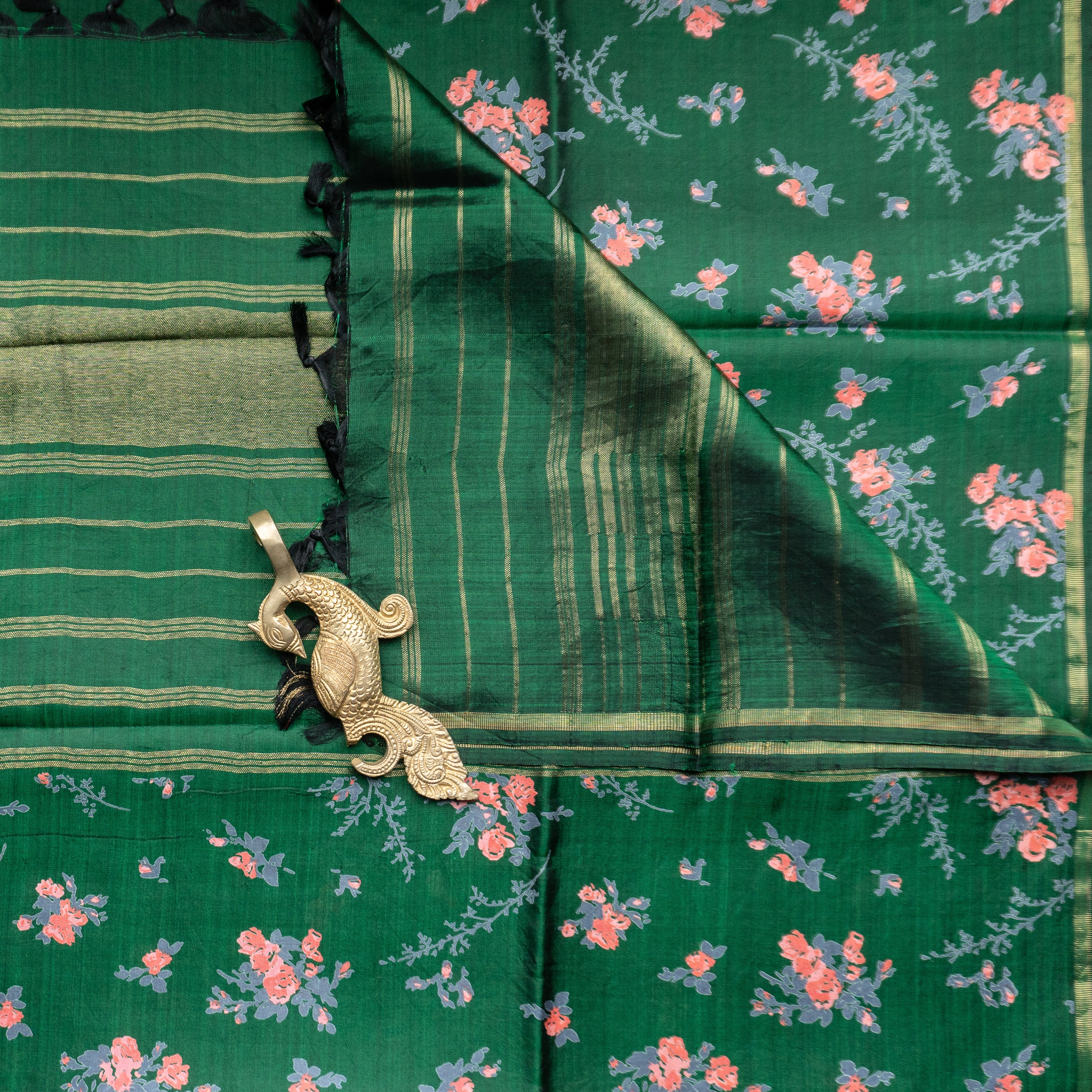 Bottle green Kanjivaram Duppatta adorned with floral hand block prints, complemented by traditional design as the sides for a classic touch.