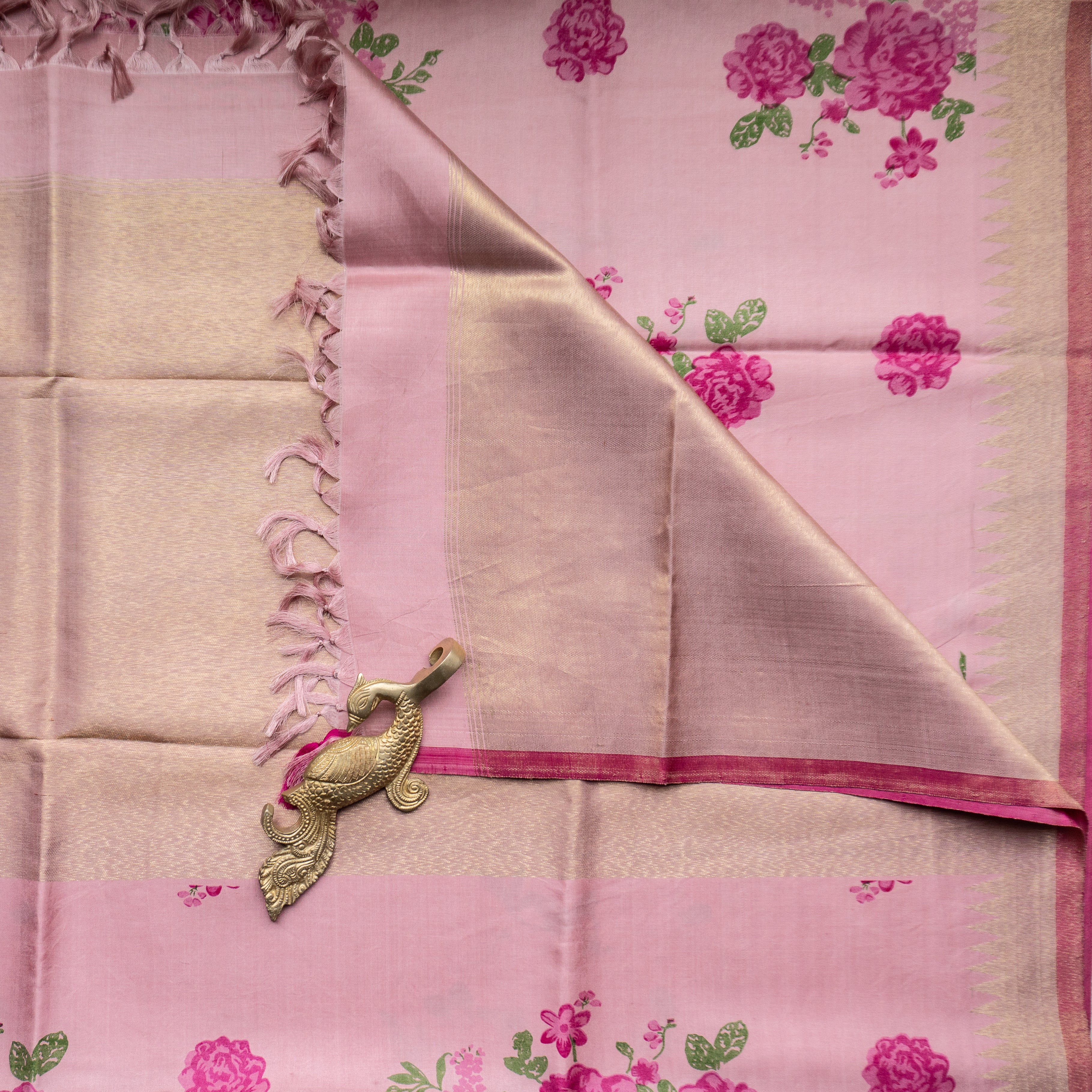 Pastel pink Duppatta featuring delicate floral hand block prints , adorned with a rich gold zari temple border and a striking Rani pink selvedge. Elegant and timeless.