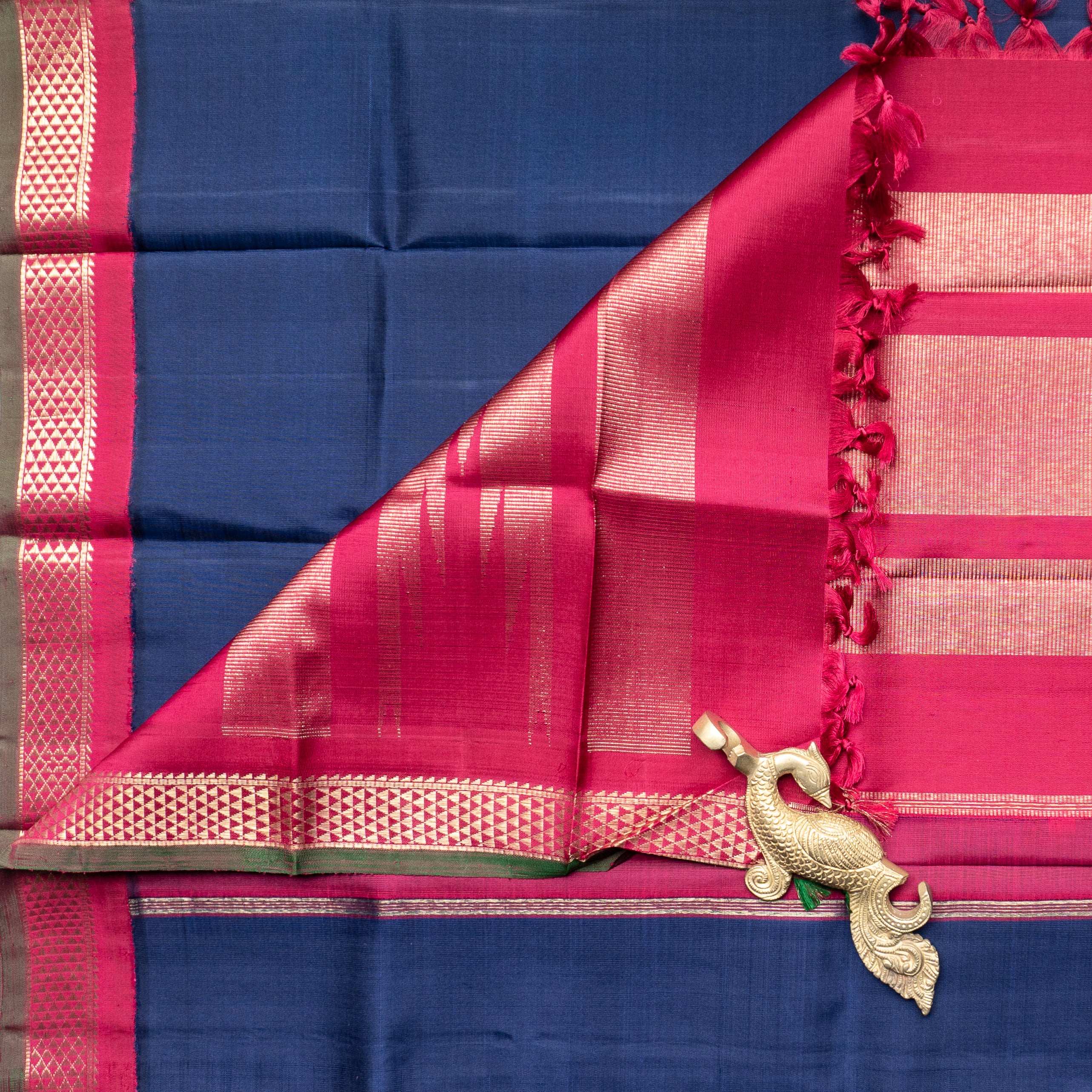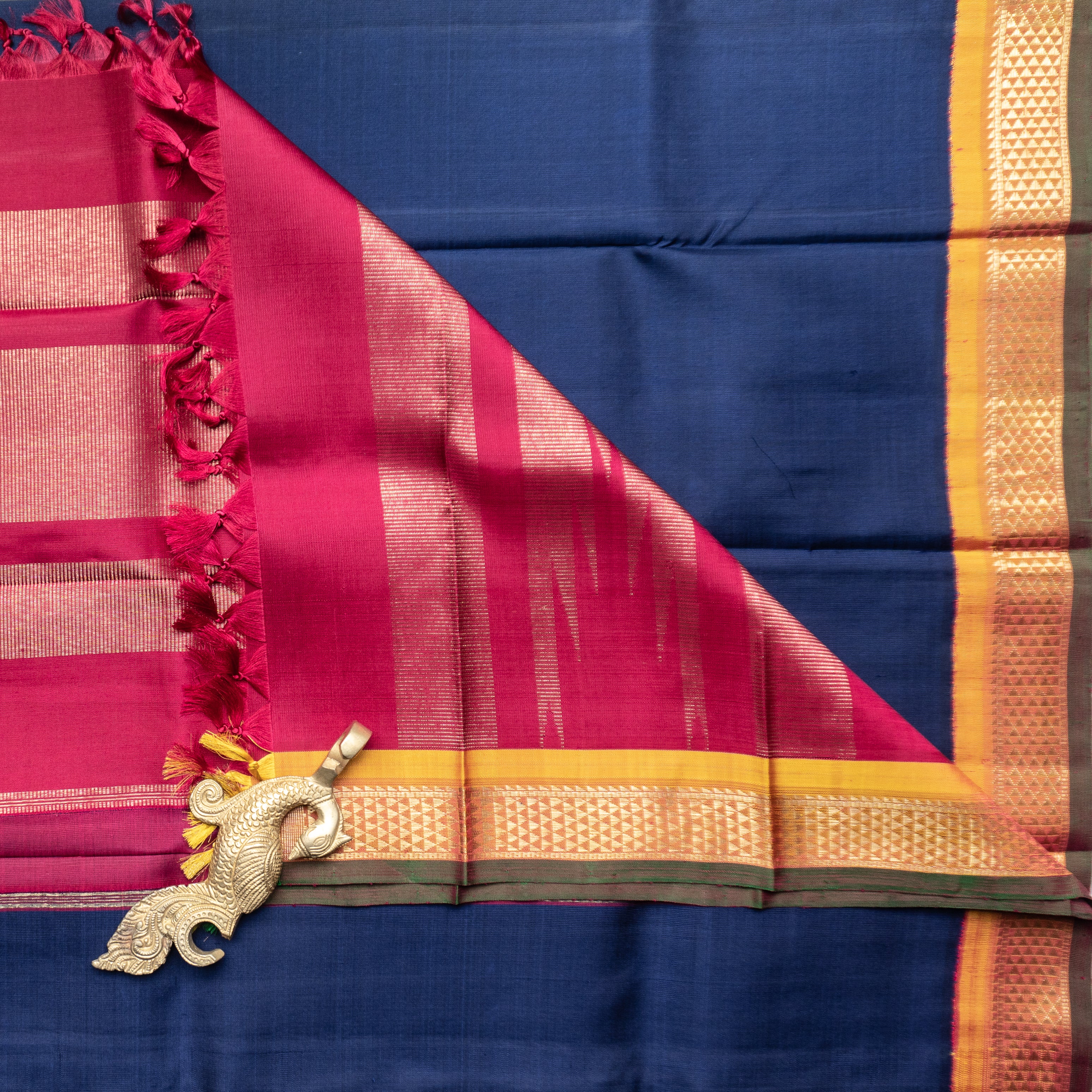 Navy blue kanjivaram Duppatta featuring a striking Ganga Jamuna aramadam border and a vibrant green selvedge - an elegant blend of tradition and contrast .