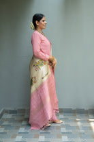 Ivory Kanjivaram silk duppatta with hand-block printed floral motifs in the body. The border and the sides of the duppatta are pastel pink with pure gold zari detailing. The print on the duppatta is unique because of the number of dyes which has been used, making the process time-consuming.