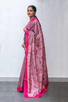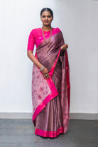 Lavender Tussar silk saree with gold zari checks running along with body. The pallu is unique with floral checks in kanjivaram silk. The saree has a rani pink kanjivaram silk border, which completes the look of the saree.