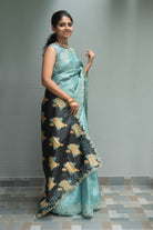 Powder Blue golden zari checked saree which flows into a black bed of floral pallu. The blouse follows a similar pattern to the pallu.