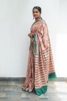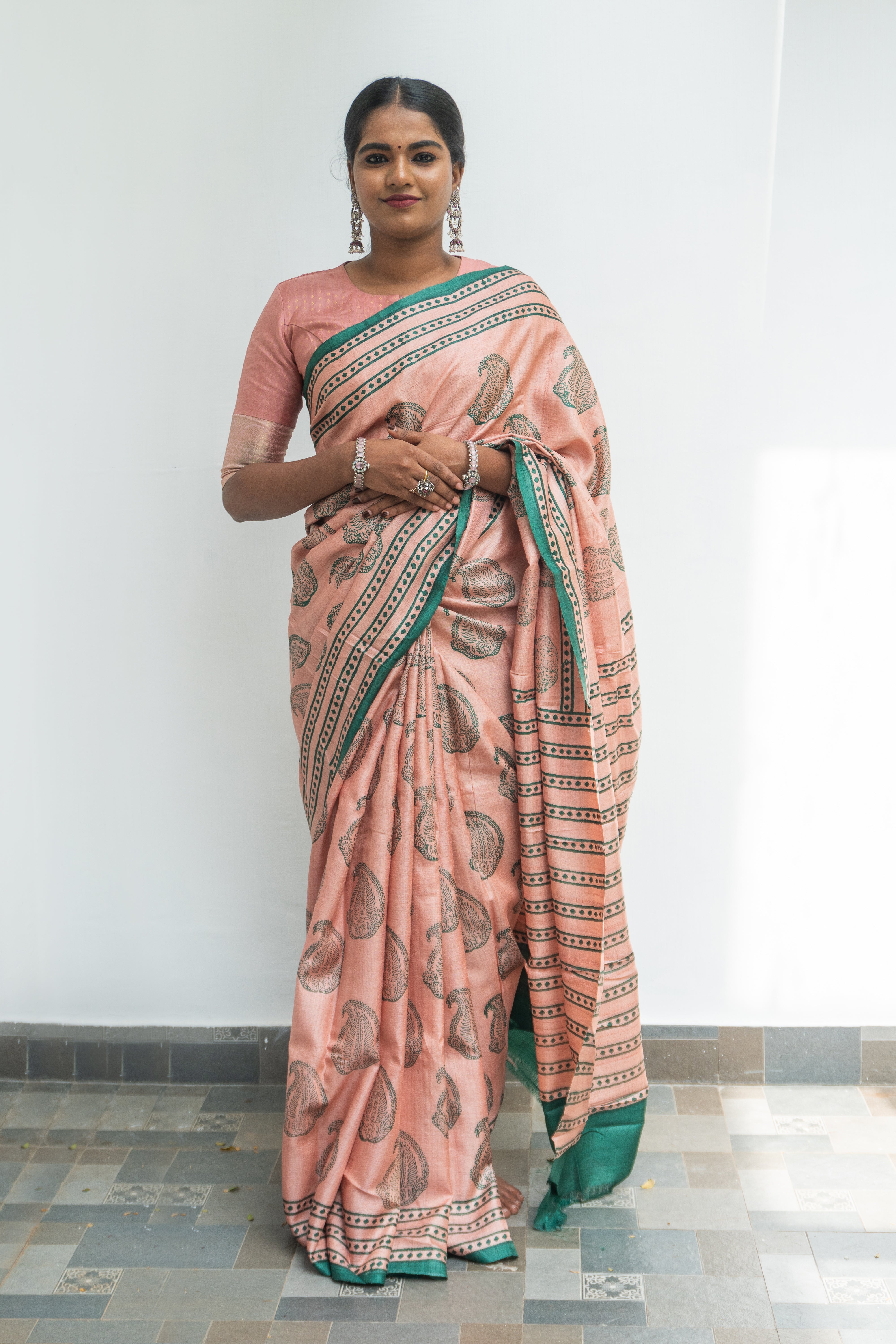 Handcrafted in pure tussar silk, this pastel pink saree with its natural sheen and rich texture form a graceful canvas for hand block printed paisley motifs rendered in a serene contrast of green. The saree flows into a border and pallu with geometric patterns, adding a contemporary touch to its classic elegance.