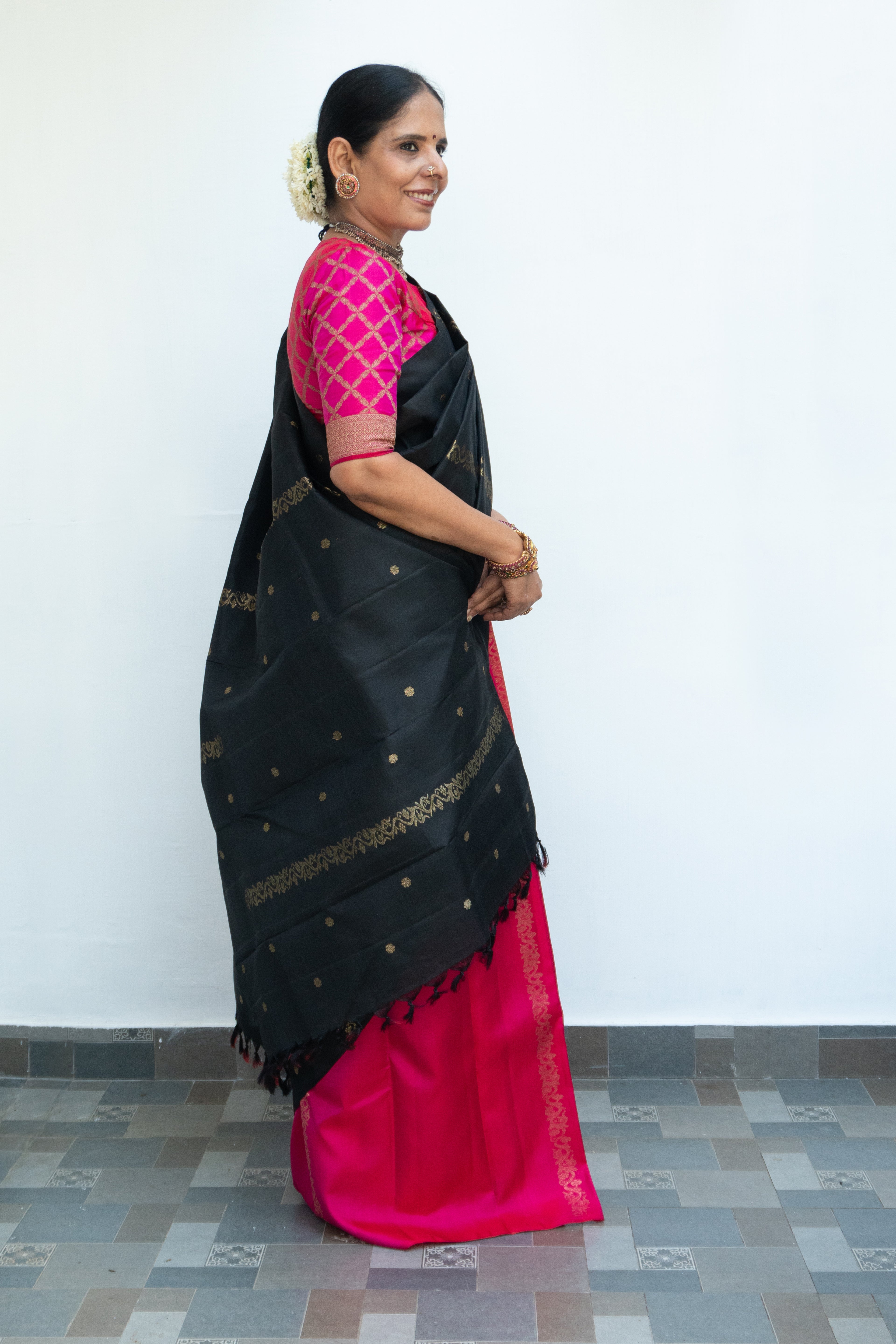This black and pink half-and-half Kanjivaram silk saree is an elegant fusion of tradition and modern artistry. The black portion of the saree is adorned with traditional buttis and floral vine motifs, while the contrasting pink half showcases delicate floral patterns, creating a harmonious balance of depth and vibrance.