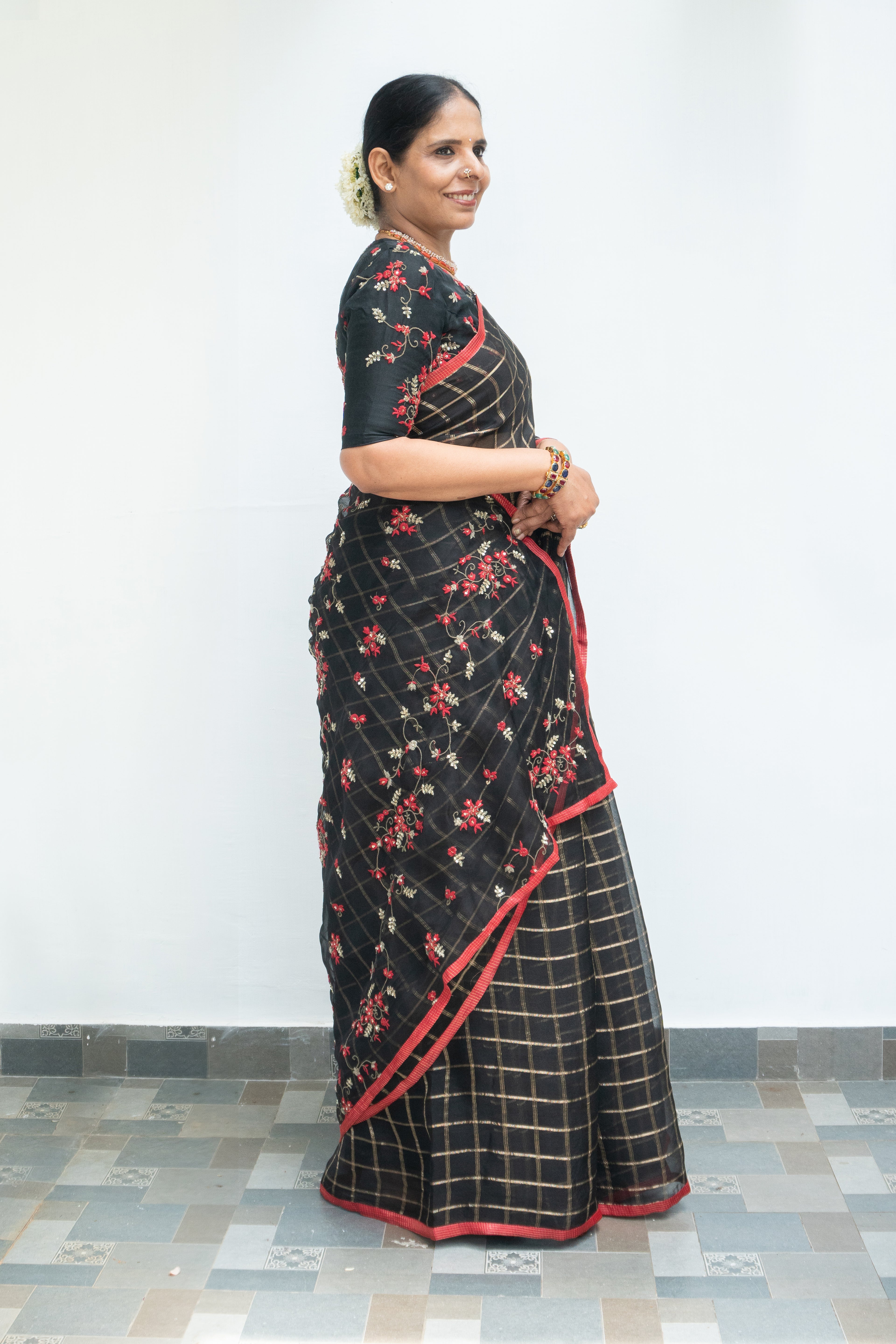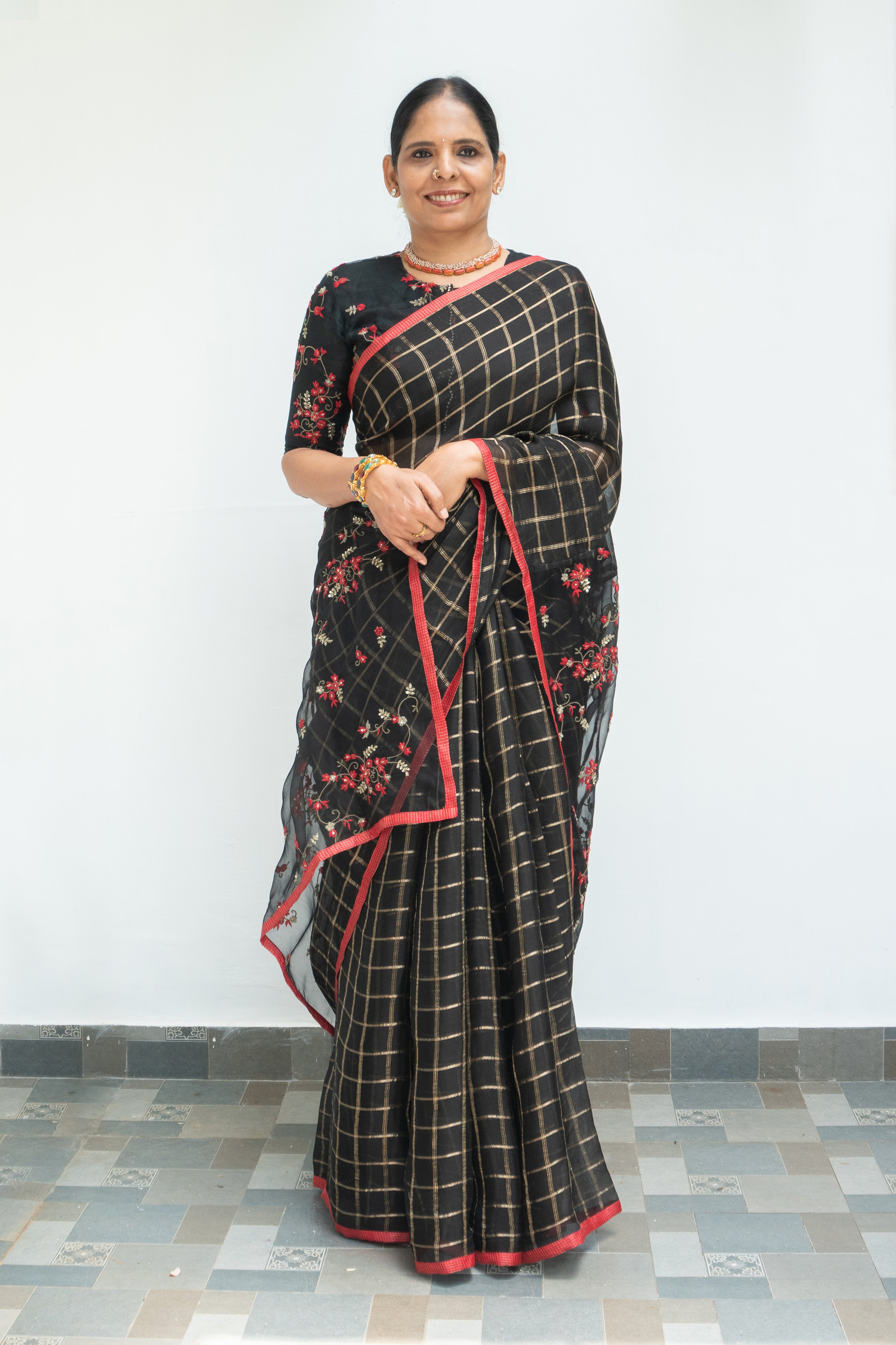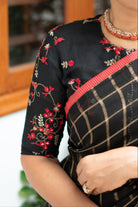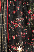 Black Checked Organza Silk Saree with Embroidered Pallu and Red Tussar Border
