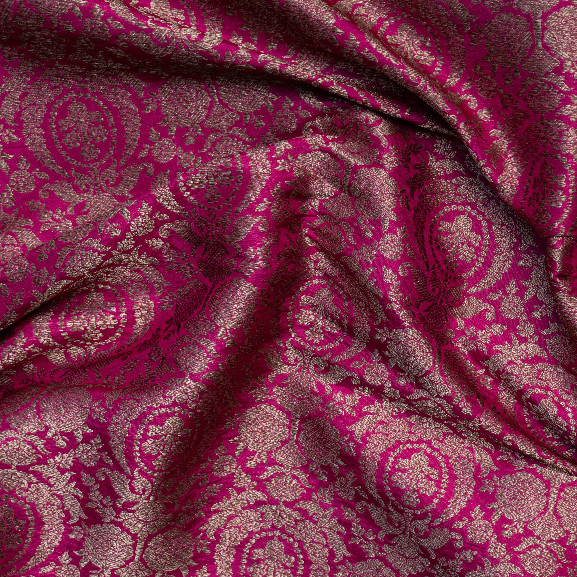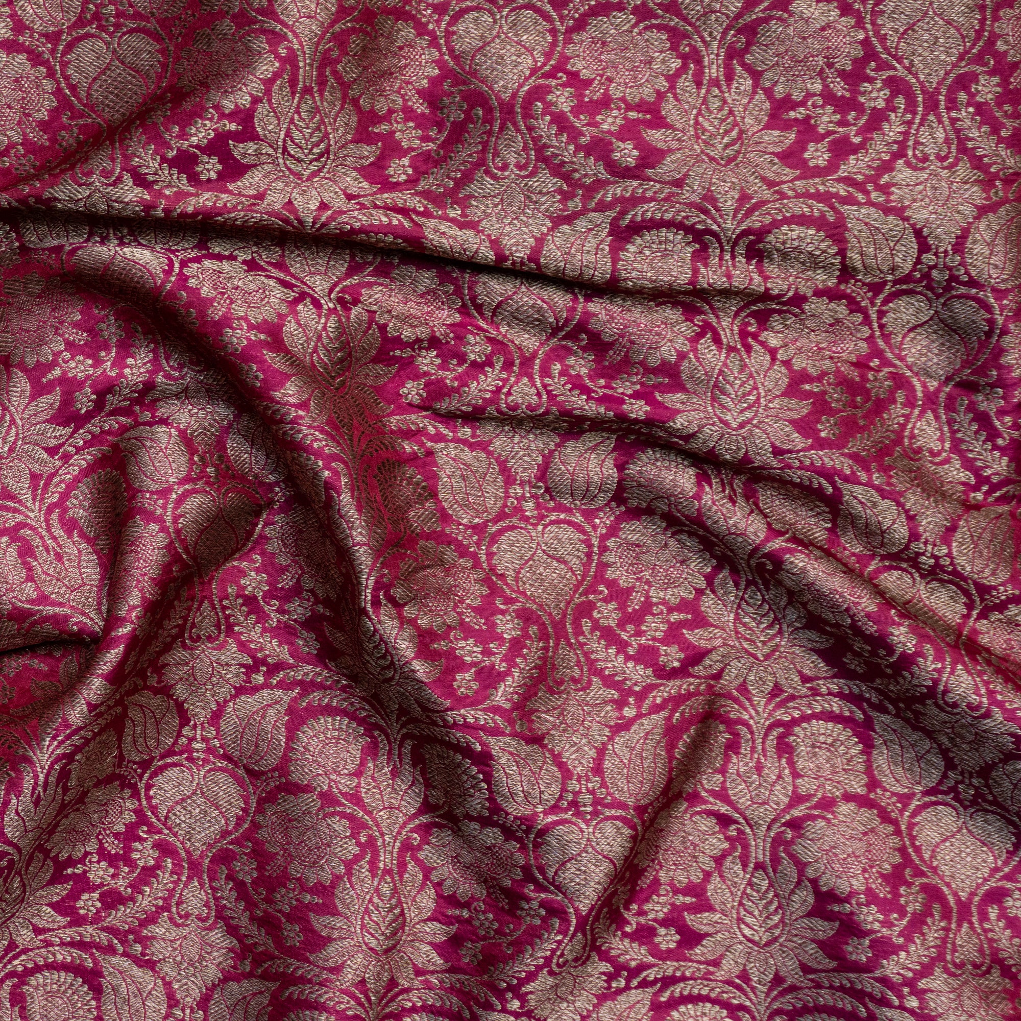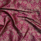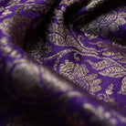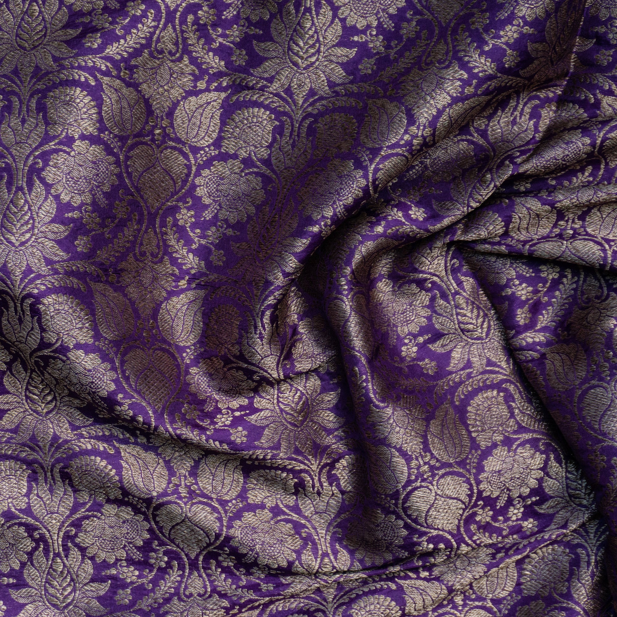 Purple Banarasi brocade silk fabric featuring rich golden zari motifs on a royal purple base. Ideal for adding a touch of traditional opulence.