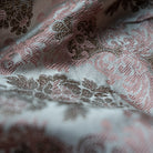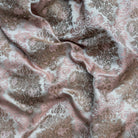 Cream Banarasi fabric featuring intricate pink thread work and shimmering gold brocade, blending elegance with classic craftmanship