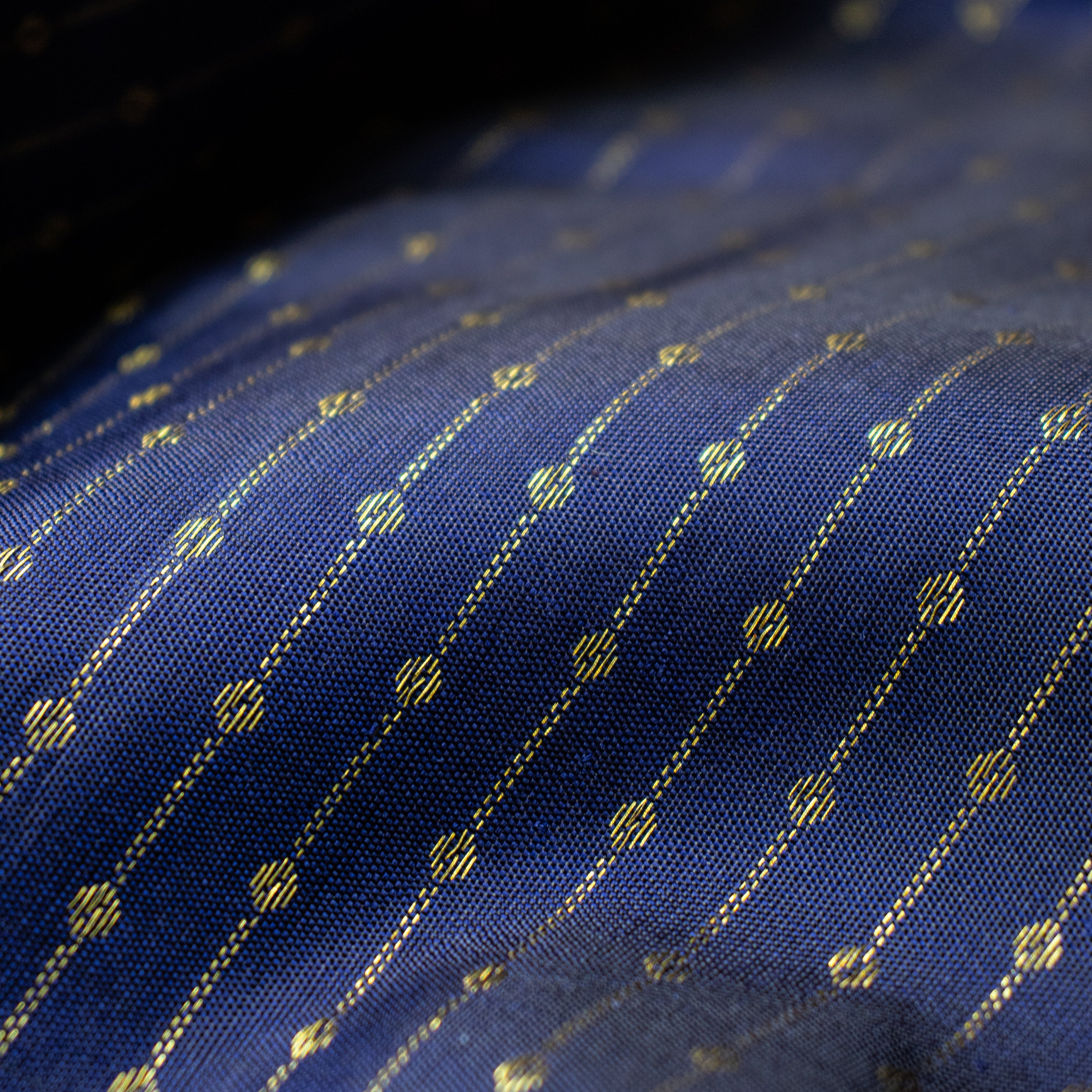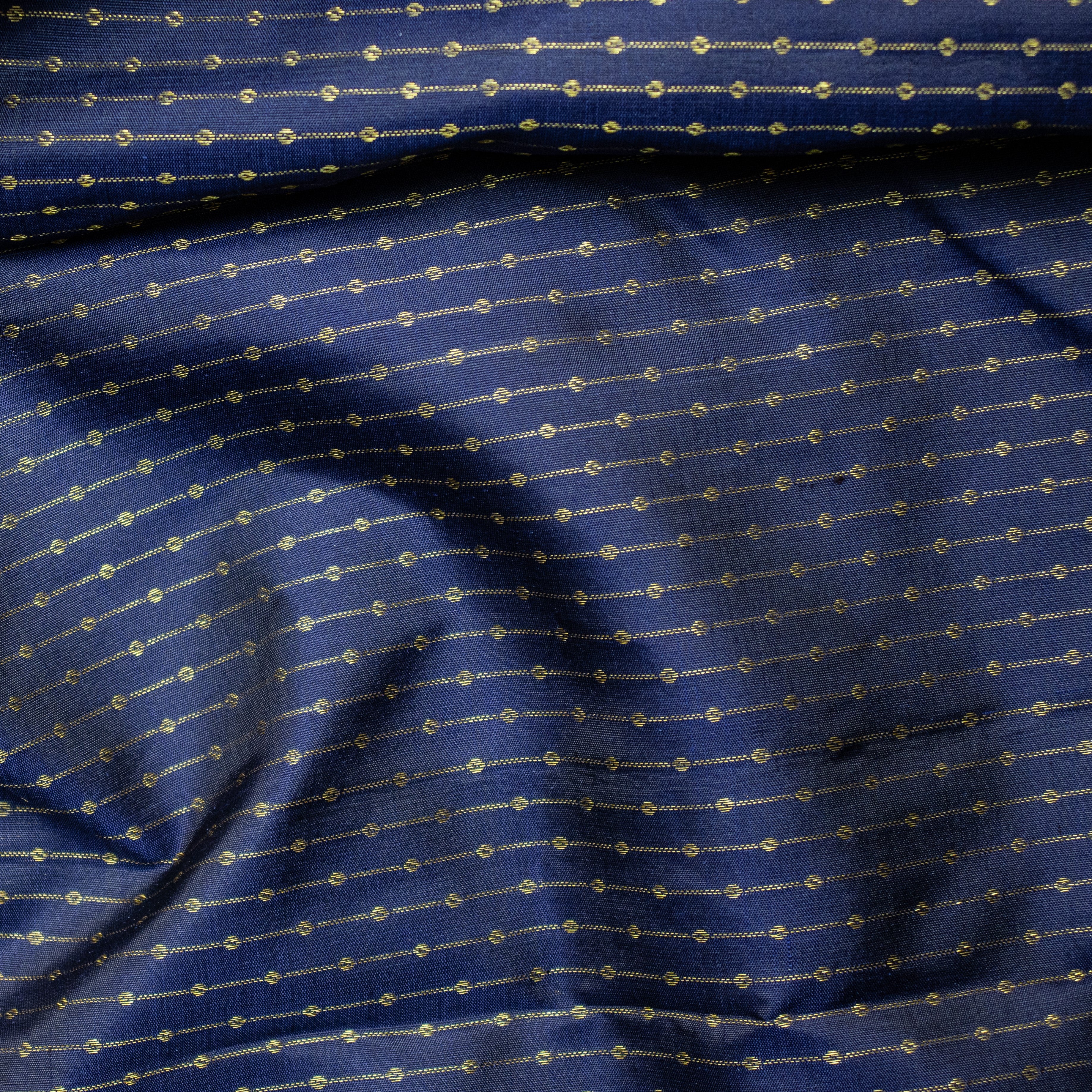 A deep dark blue kanjivaram silk fabric featuring elegant needle - inspired motifs woven in fine linear patterns. The subtle geometry and rich silk sheen come together to create a refined, contemporary take on traditional kanjivaram craftsmanship.