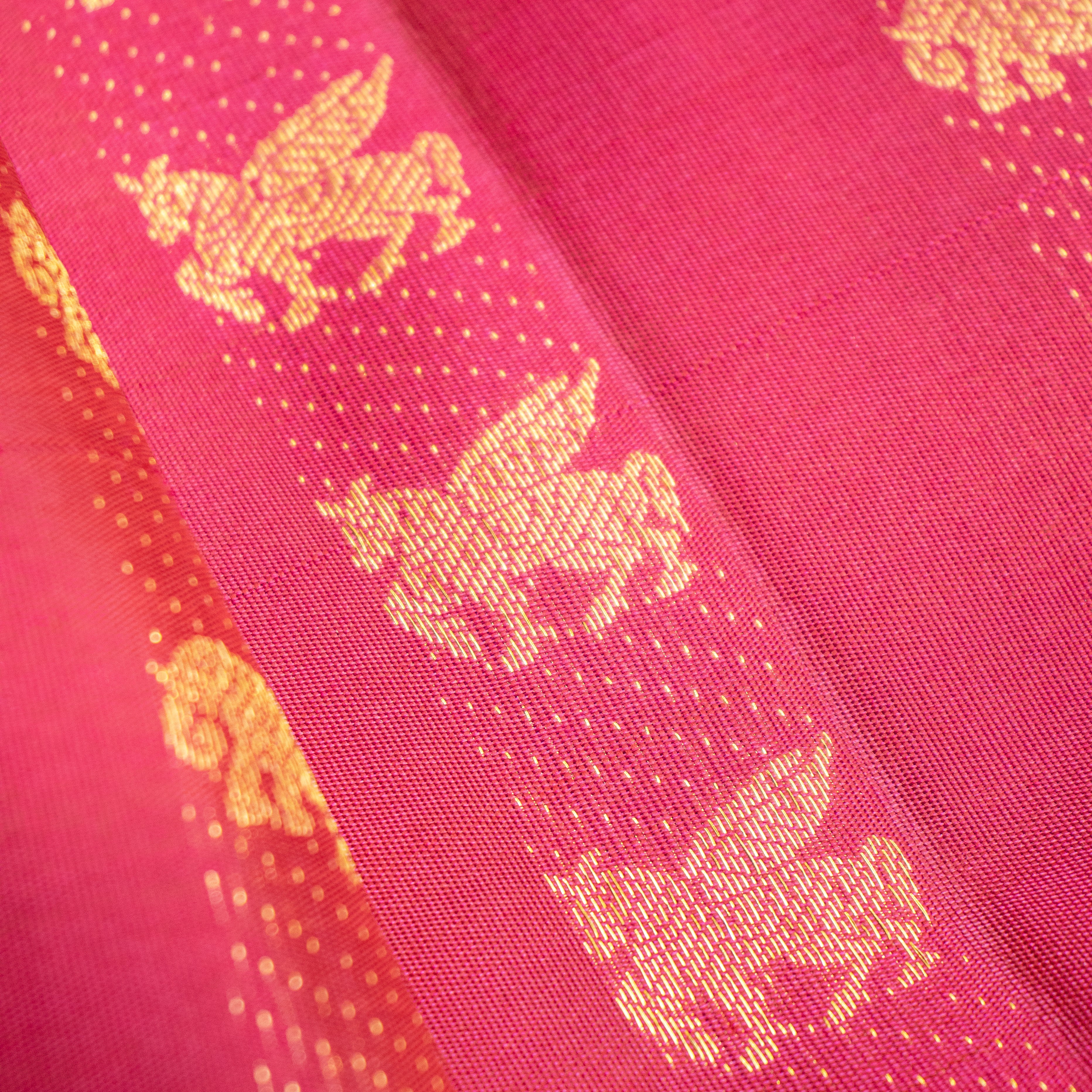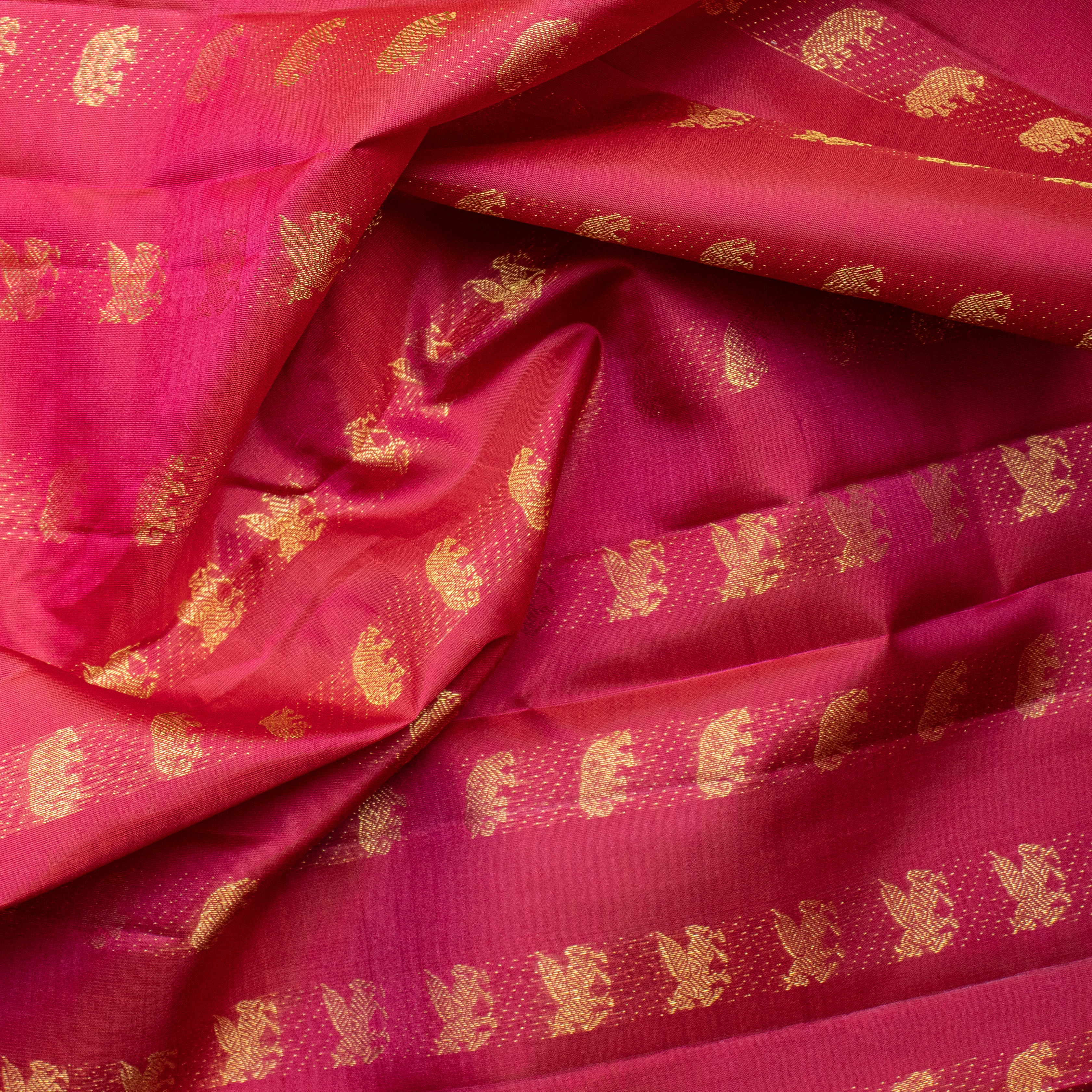 Chilli red kanjivaram silk fabric featuring vertical lines of ‘yazhi’ and ‘yaanai” motifs woven in pure gold zari. The luminous silk and intricate zari work create a timeless, regal look rooted in classic South Indian craftsmanship.