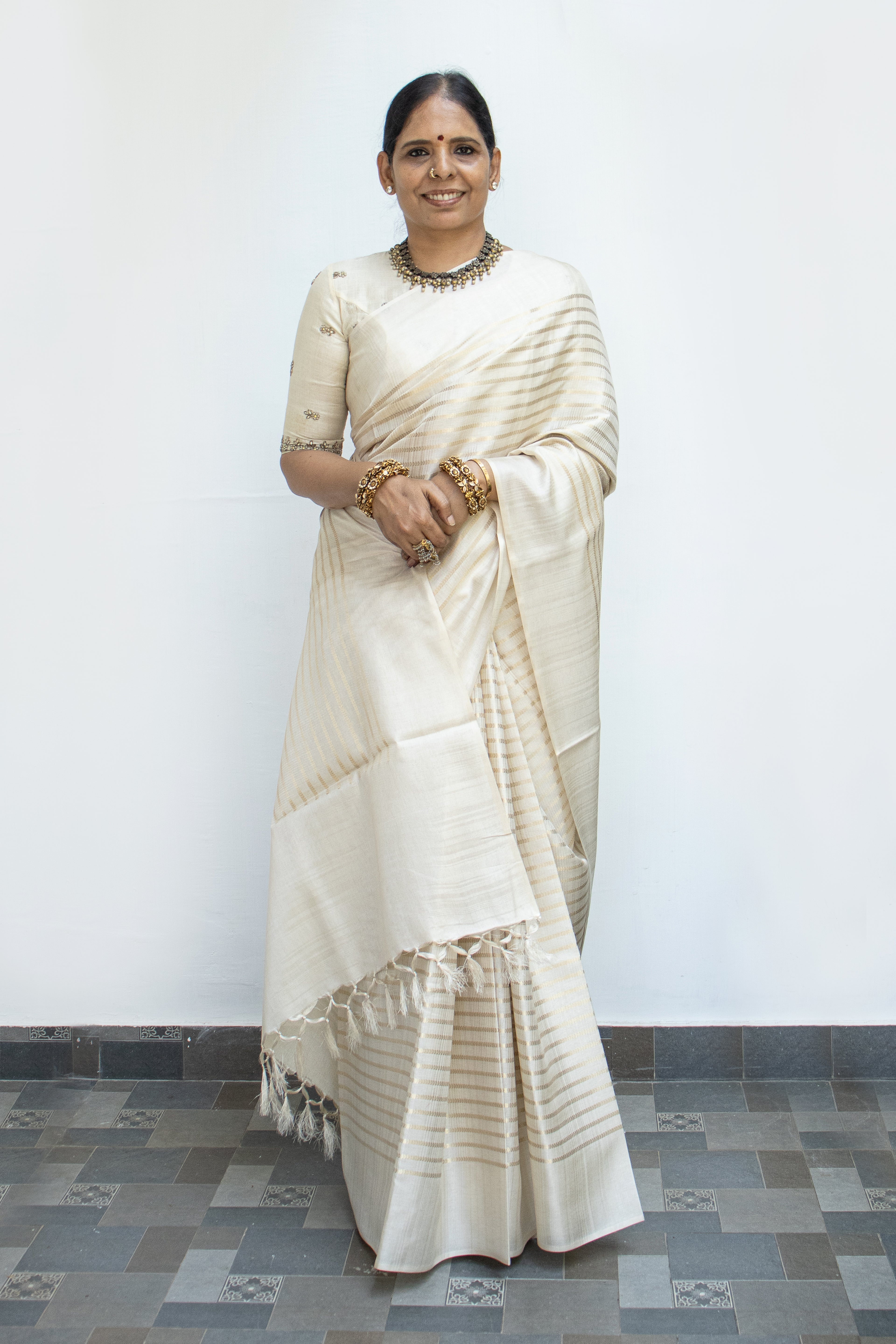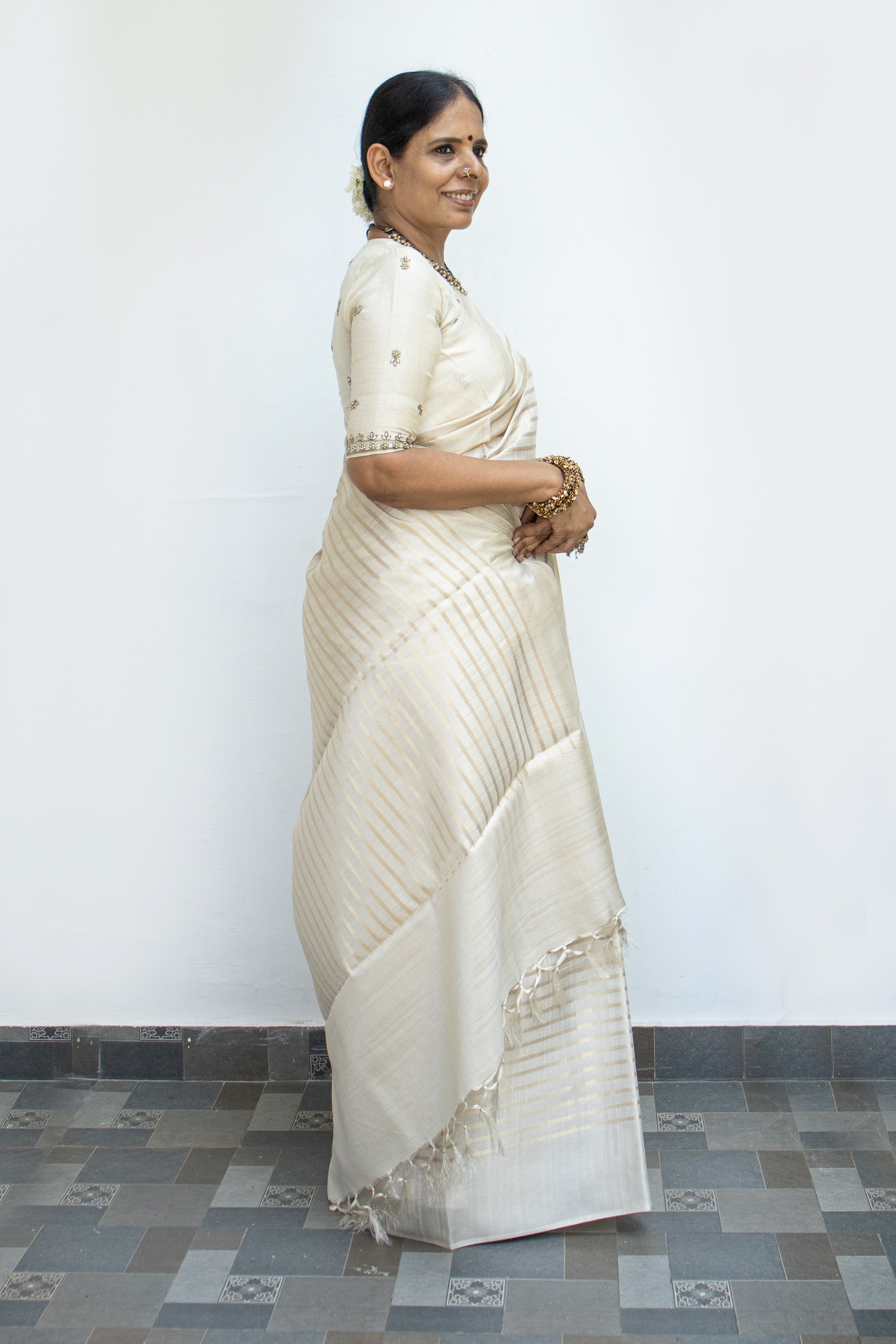 Cream Tussar Silk Saree with Horizontal Gold Zari Lines