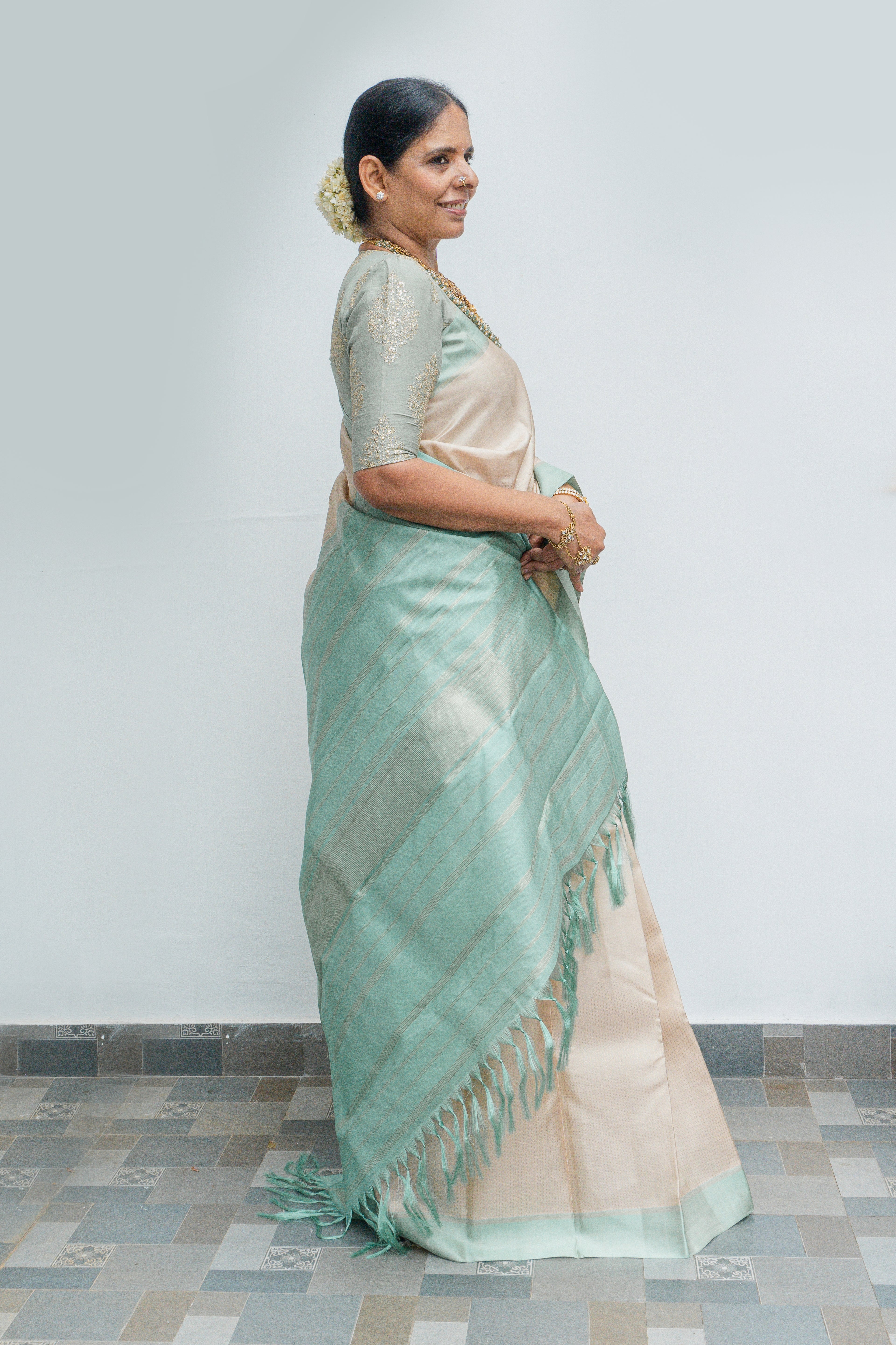 Ivory Kanjivaram Silk Saree with Gold Zari and Mint Green Contrast Border