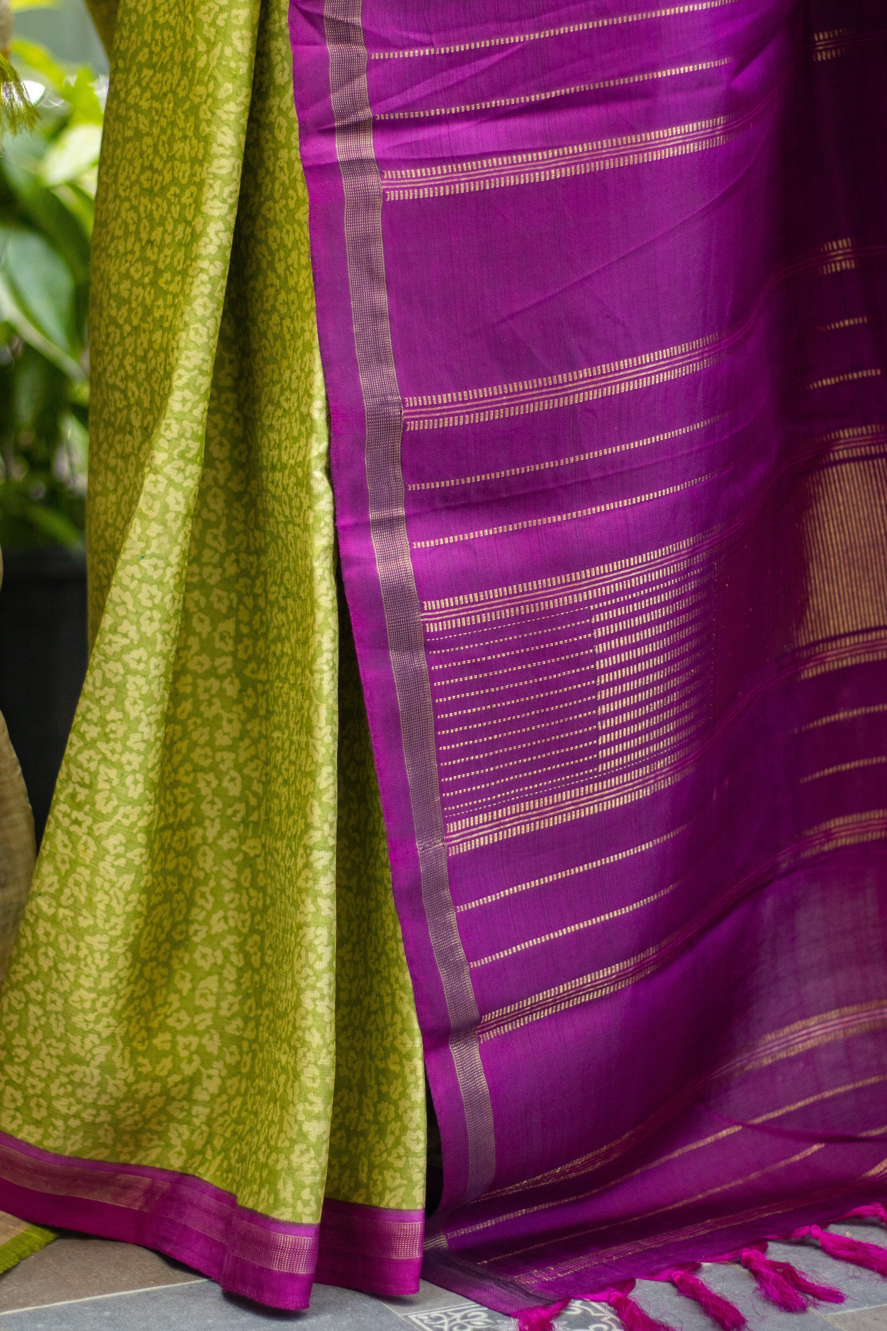 Kanjivaram Silk Saree with Hand Block Printed Motifs and Purple Contrast Pallu