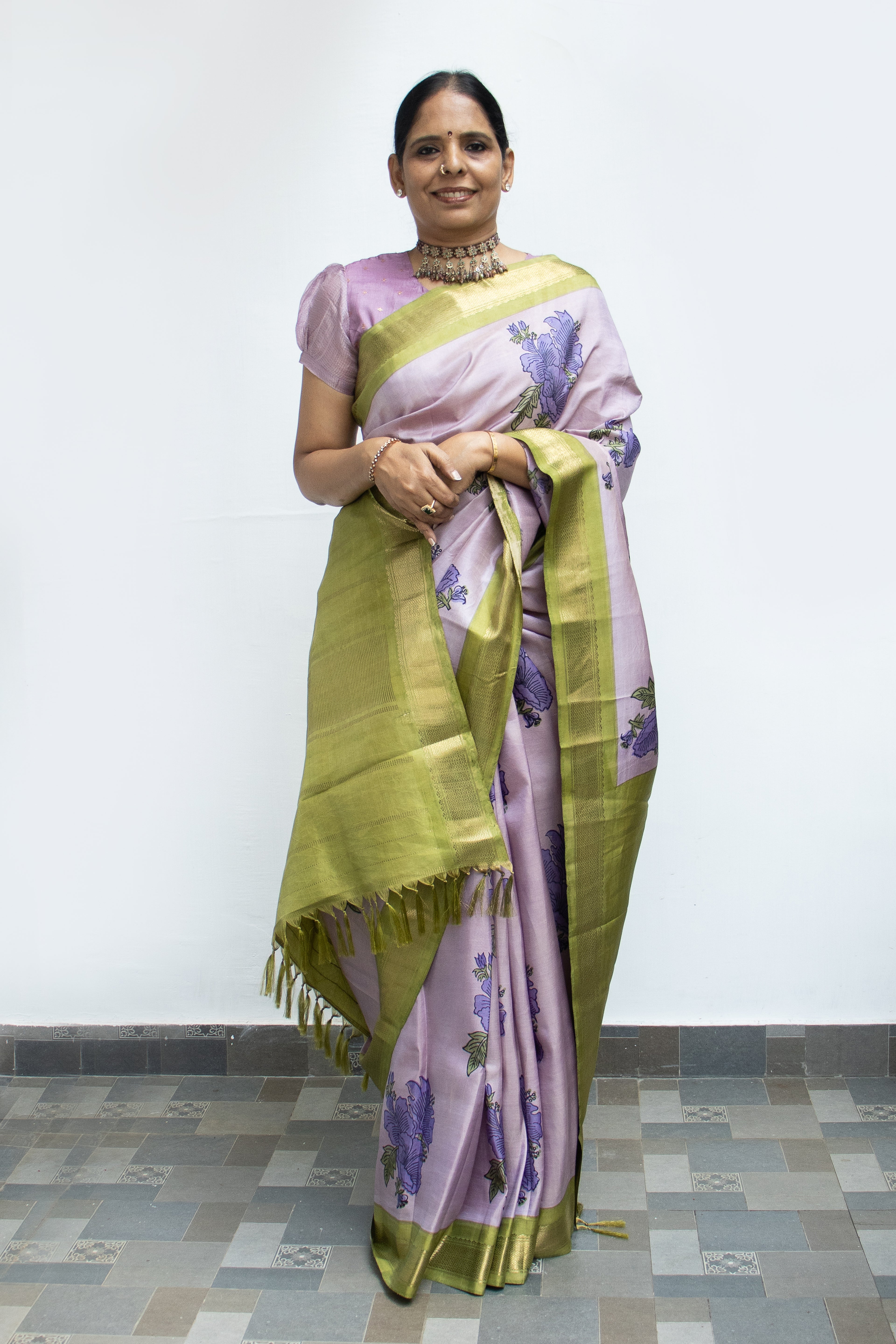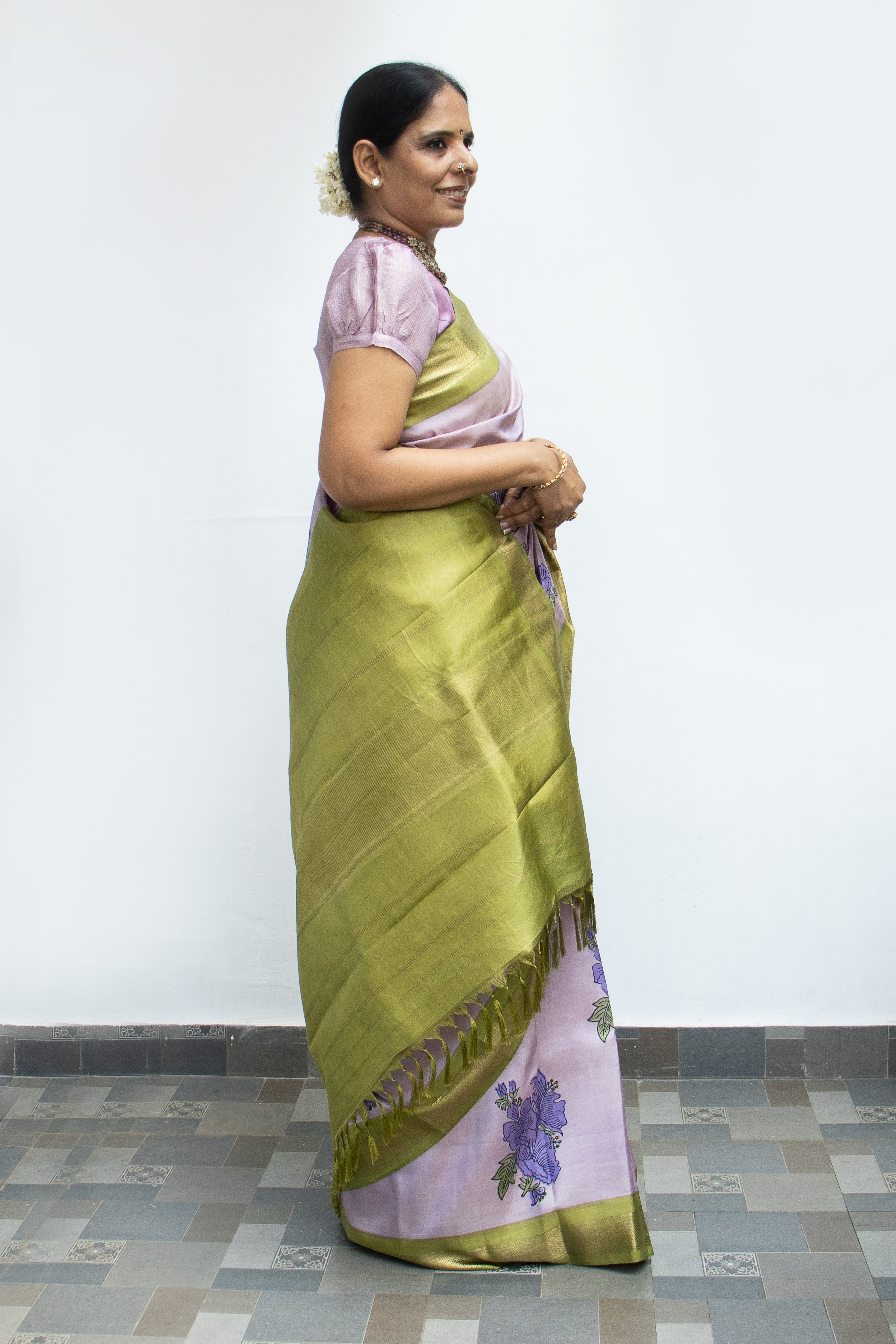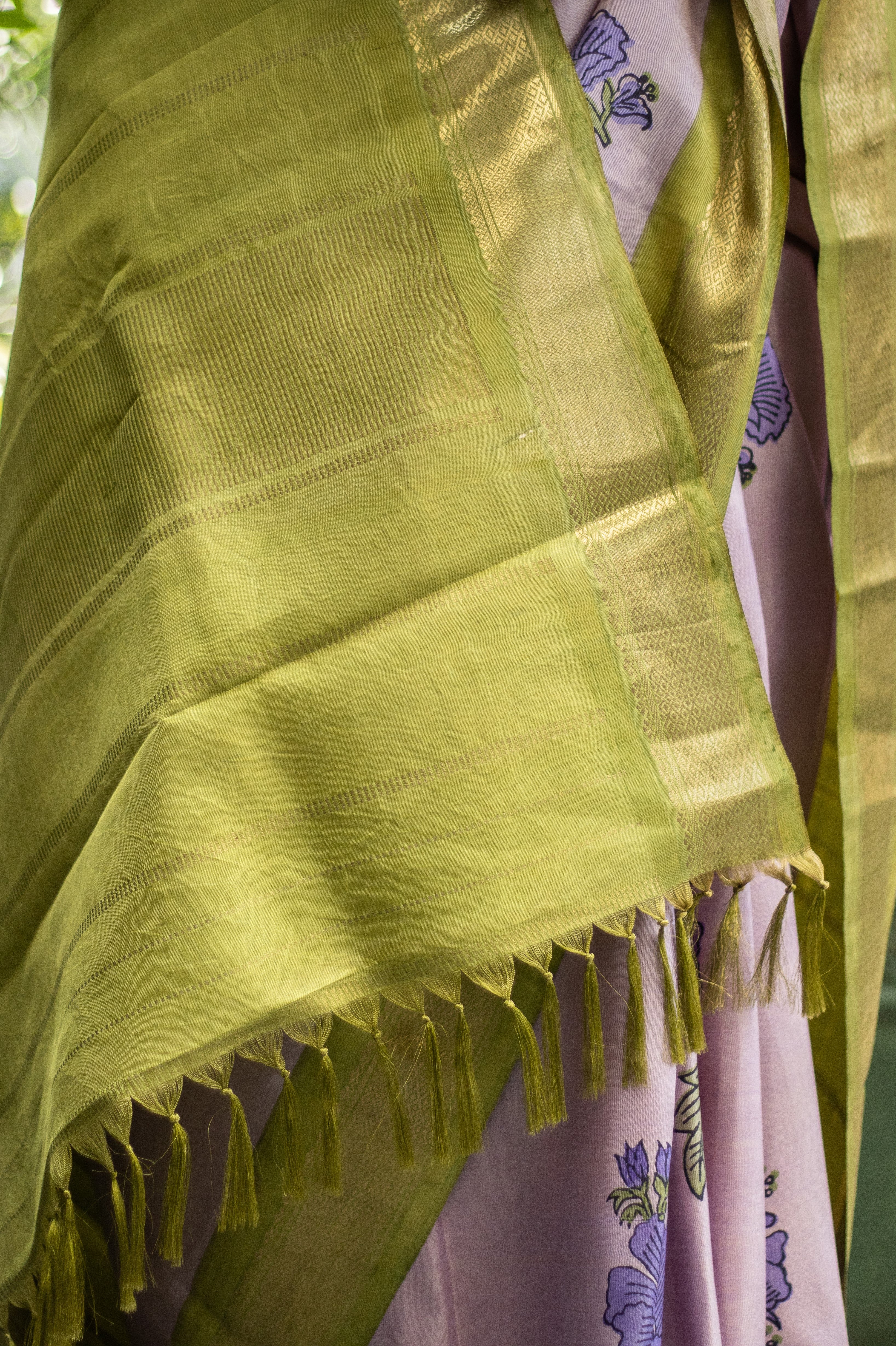 Lilac Kanjivaram Silk Saree with Hibiscus Hand Block Print and Olive Green Border