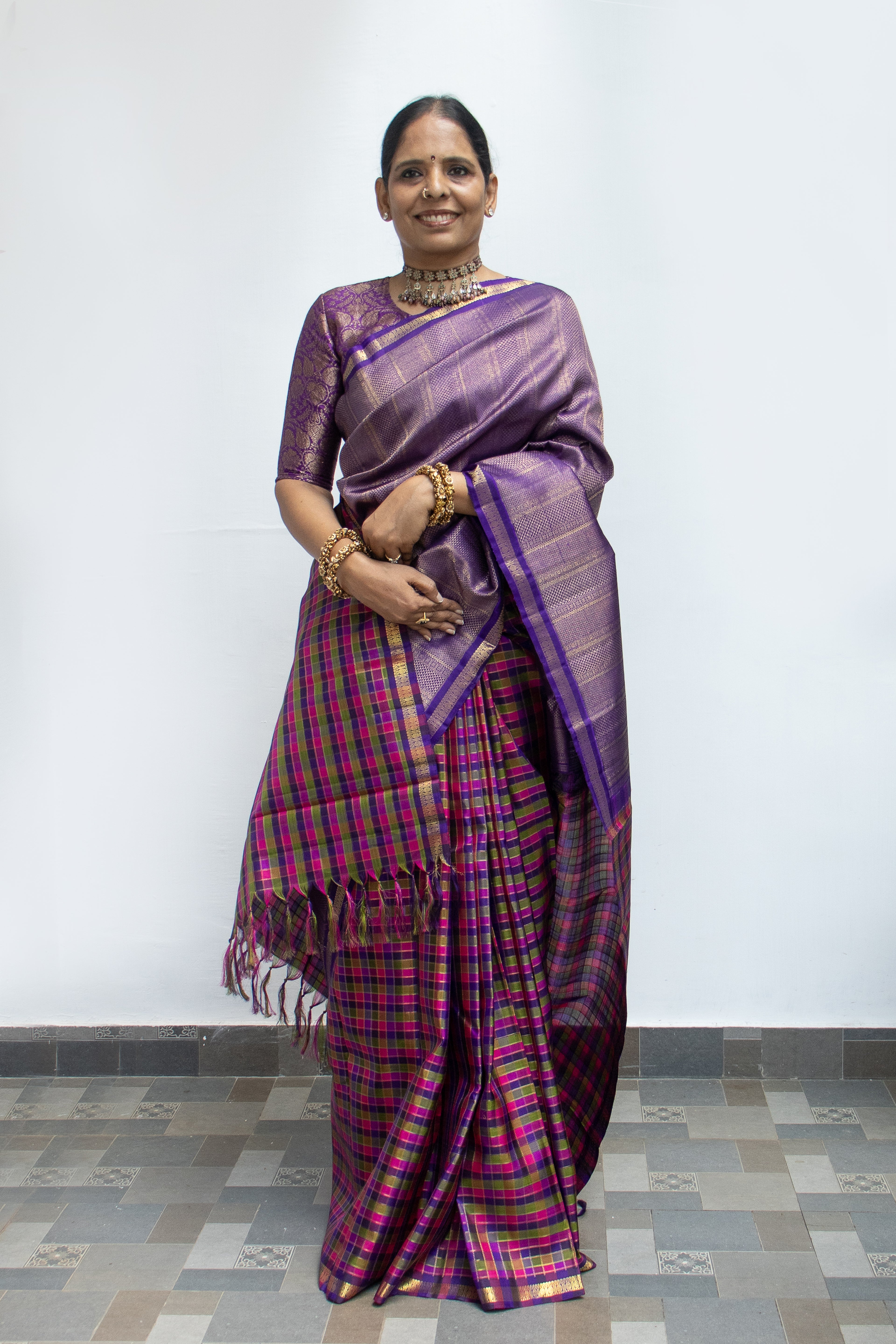 A refined continuation of our Madras Checks collection, these Kanjivaram silk sarees are reimagined in a fresh jewel-toned palette. Both pieces feature classic Madras checks woven in rich hues of purple, green, pink, and magenta, reflecting timeless South Indian craftsmanship with a contemporary sensibility.