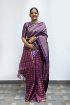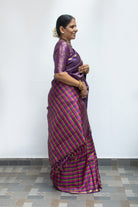 Also showcased is a vibrant shoulder-rich saree where a lustrous solid purple body flows seamlessly into the checked weave, creating a striking yet balanced composition. A thin gold zari border frames the saree elegantly, adding a touch of traditional refinement.