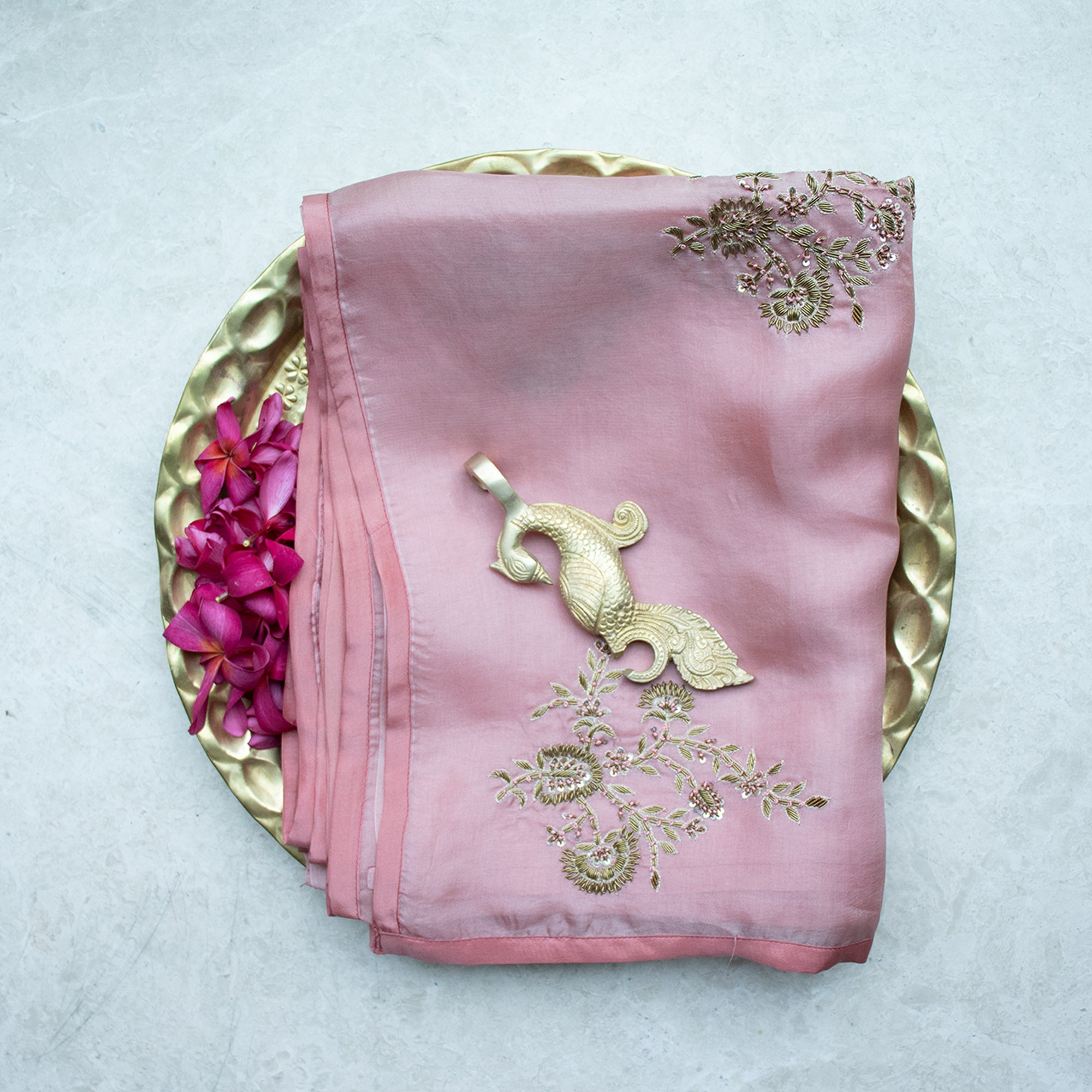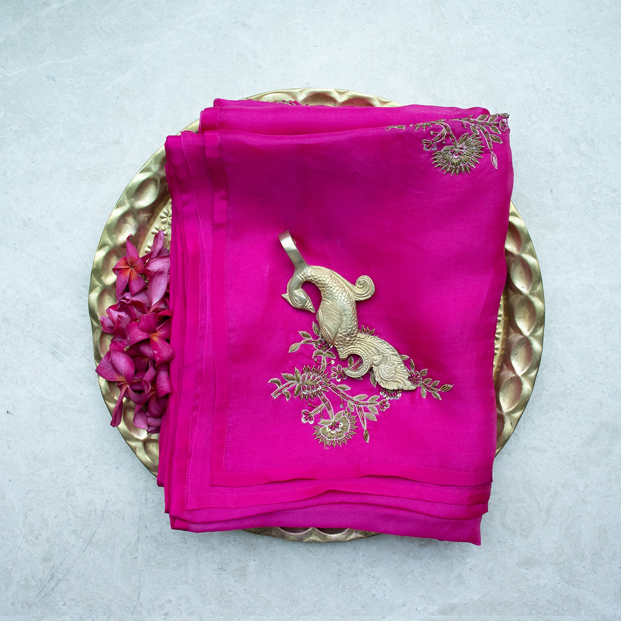 Adorning the saree is intricate zardosi embroidery, featuring delicate handwork that brings depth, texture, and a touch of regal charm to the ensemble. The subtle sheen of organza silk enhances the richness of the detailed motifs, creating a luminous interplay of light and craftsmanship.