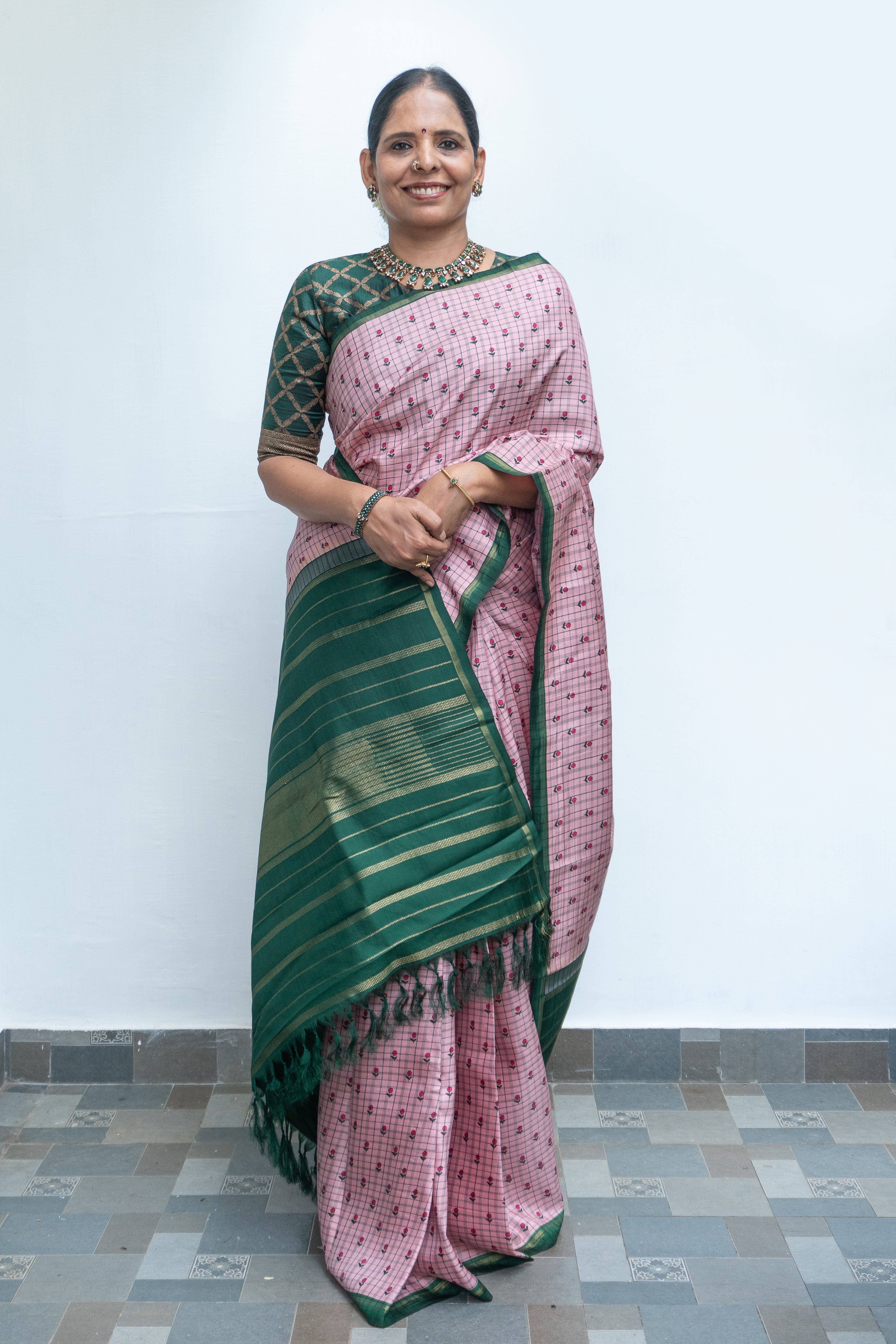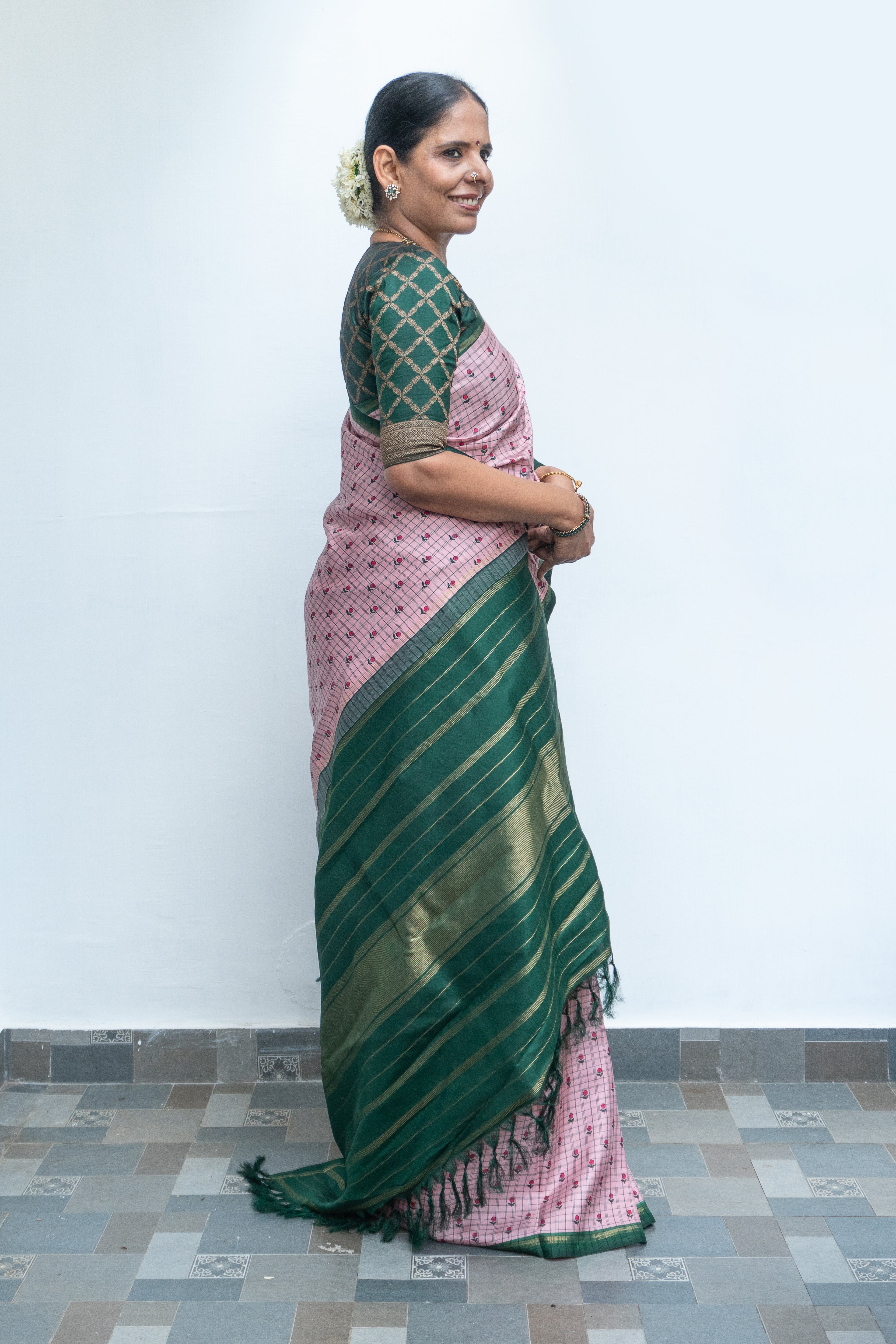 This elegant pastel pink Kanjivaram silk saree blends traditional craftsmanship with contemporary charm. The body is adorned with soft green checks and delicate floral block prints arranged in linear patterns, lending it a graceful, artisanal touch. The saree transitions into a rich bottle green contrast pallu, intricately woven with traditional Kanjivaram motifs in pure gold zari, exuding heritage grandeur.