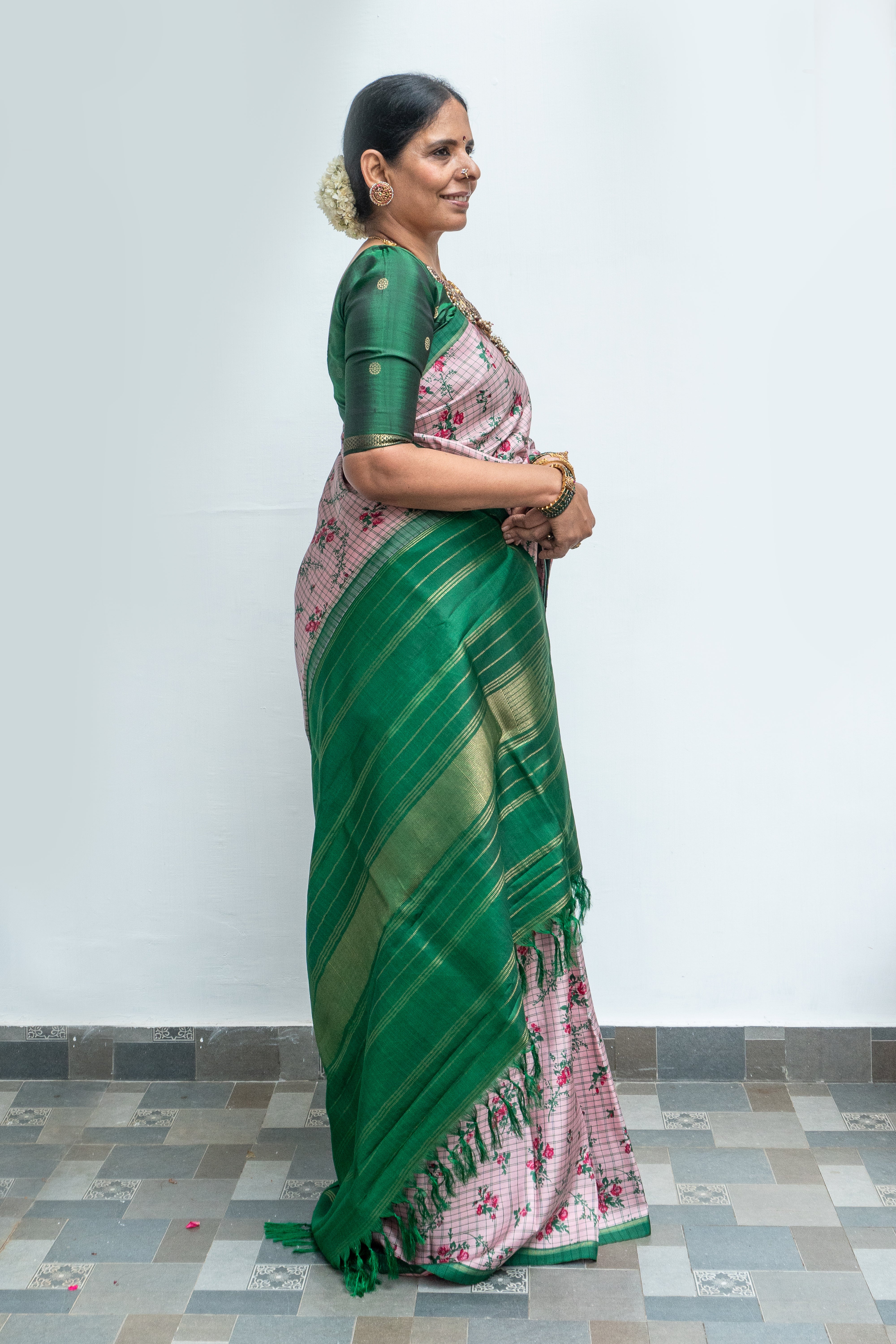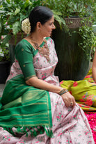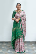 A Pastel Pink Kanjivaram silk saree woven with delicate green checks that lend a gentle rhythm to the body. The luminous silk is adorned with hand block-printed floral bunches, adding an artistic layer of charm. It transitions into a bold contrast bottle-green pallu, highlighted by the timeless seeprekku pattern rendered with traditional intricacy. A slim green border edged with subtle gold zari bands frames the saree with understated grandeur, creating a look that is both refined and regal.