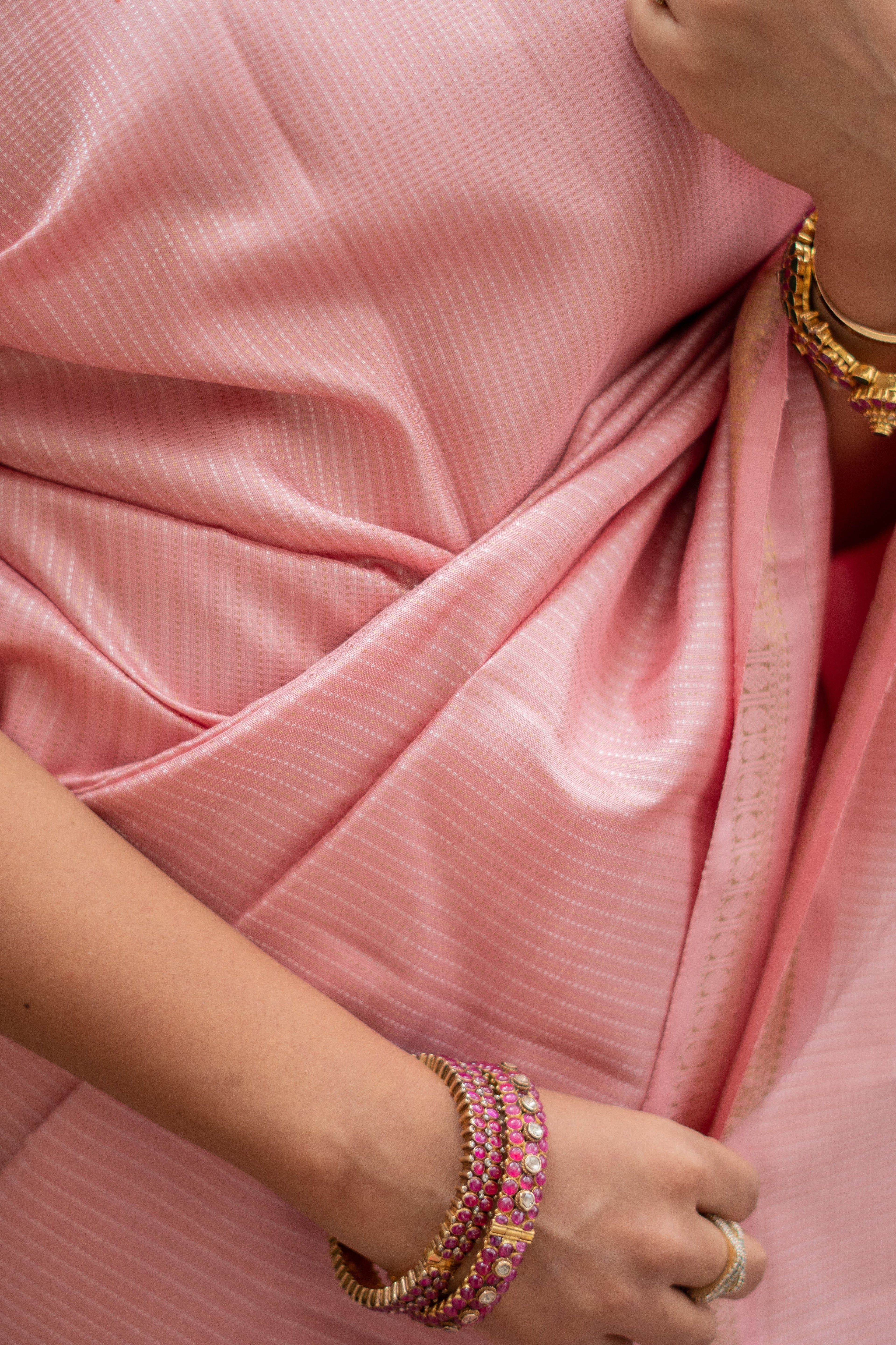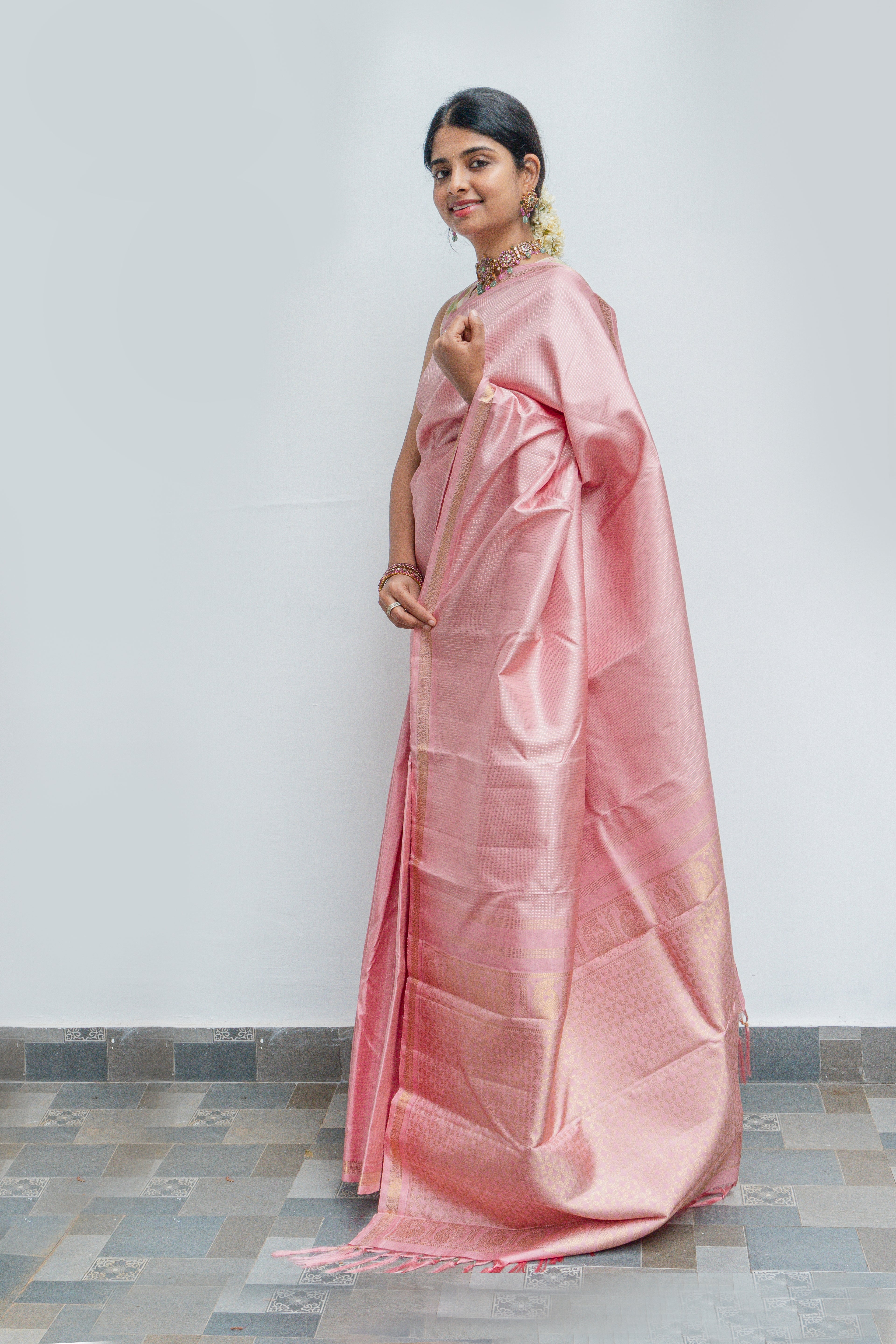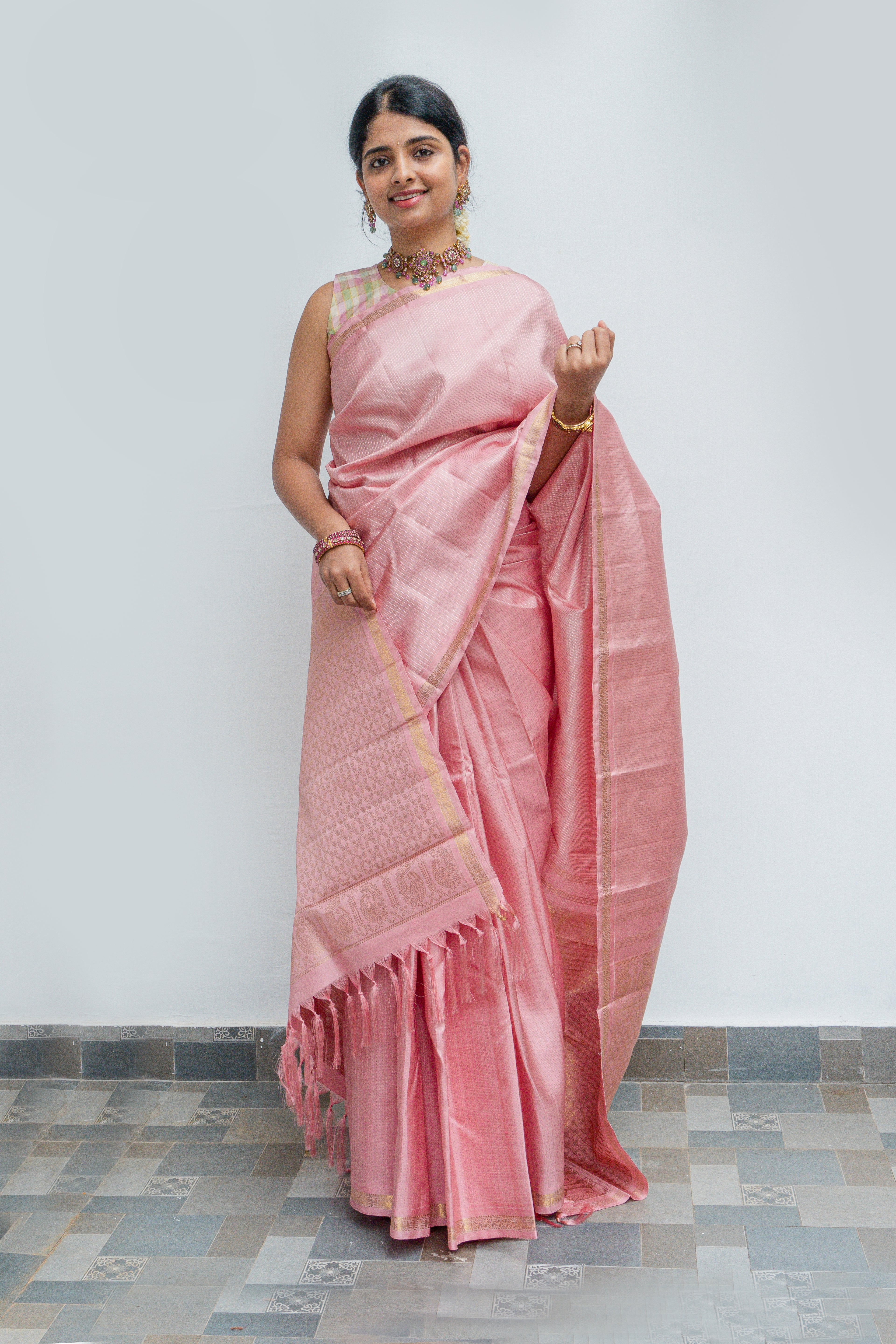 This pastel pink Kanjivaram silk saree is crafted in a serene monotone palette that radiates effortless elegance. The body features a refined interplay of gold and silver zari lines, creating a soft shimmer that enhances the luxurious drape. A delicate gold zari border adds a touch of traditional Kanjivaram artistry while preserving the understated pastel charm. The saree concludes with a richly woven gold zari pallu, detailed with intricate motifs that lend depth and timeless grandeur to the ensemble.