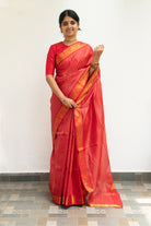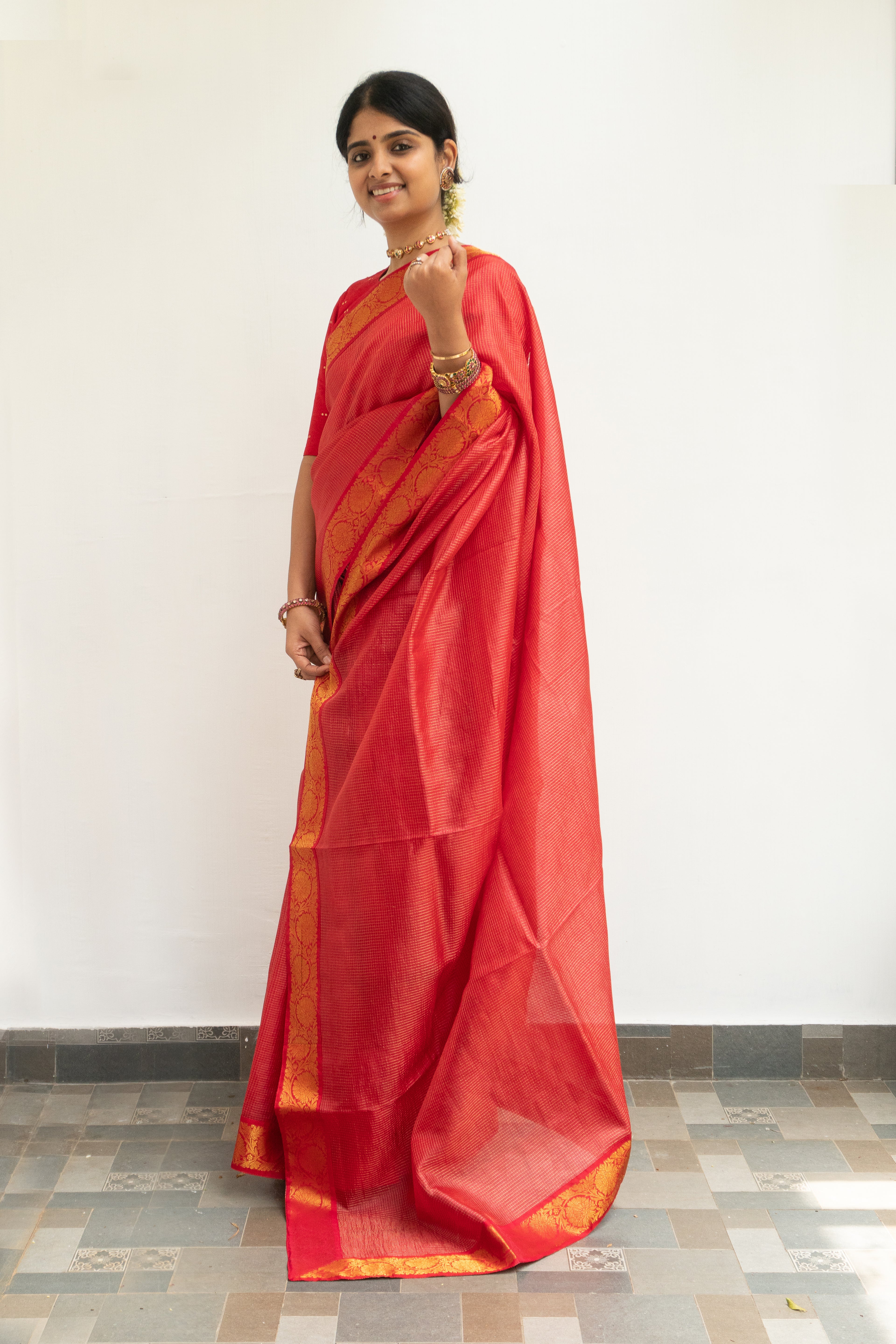 An exquisite Tussar silk saree adorned with minute gold zari checks, lending the drape a subtle yet luxurious shimmer. The saree is gracefully framed by a Kanjivaram silk border, adding a touch of grandeur to its understated elegance.